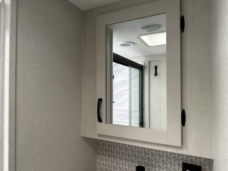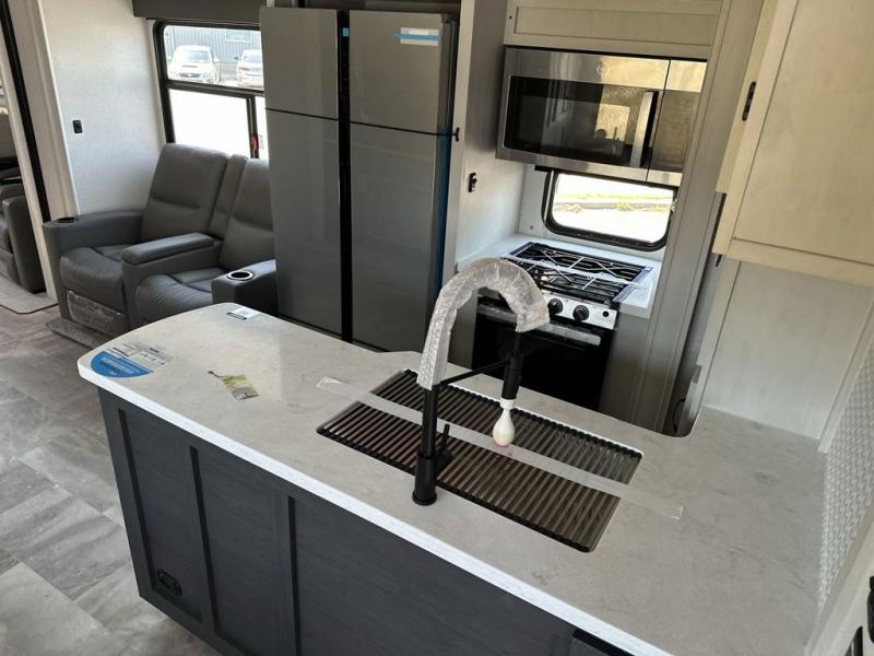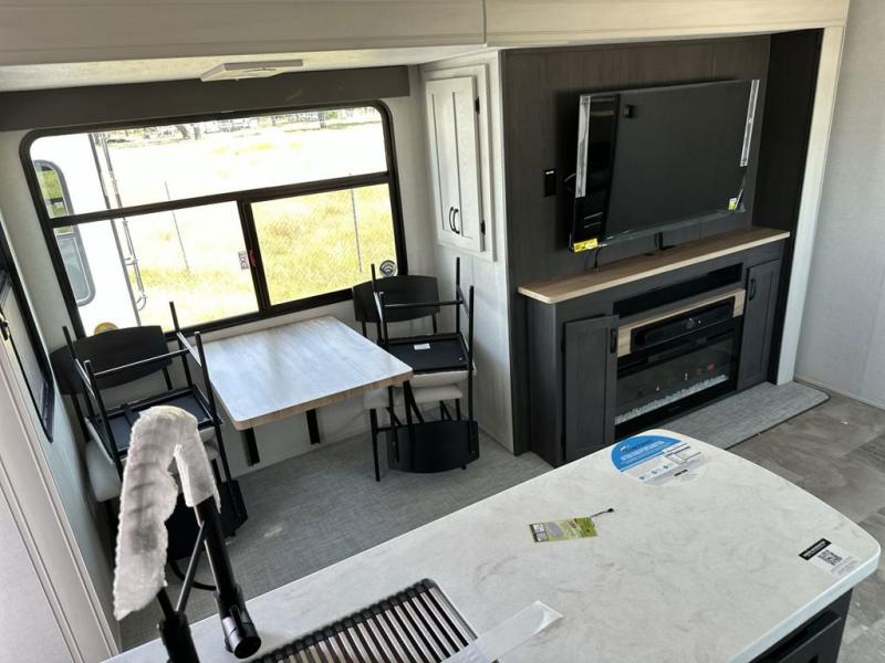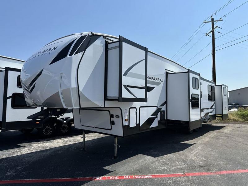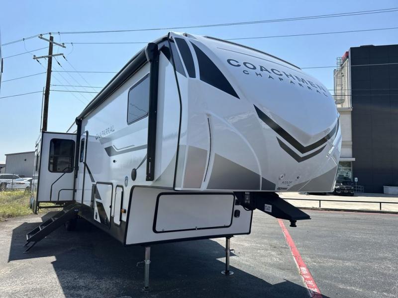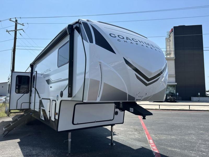Each Chaparral mid-profile fifth wheel by Coachmen is designed with residential features, loads of storage space, and roomy bedroom suites to make you feel right at home. The durable construction means you can enjoy your RV for years to come. There's 6X double Azdel aluminum cage sidewall system, Weather Shield+ technology, and Tri-Tex powder coated frame technology that will help extend your camping season. Each model includes a Winegard Air 360+ HDTV/radio dome antenna to help keep you connected as you camp, slow rise blackout roller night shades, a new 16 cu. ft. side-by-side stainless glass 12V refrigerator, and a modern electric fireplace to make your space cozy. There is also a large transom window in the kitchen, a modern high-rise faucet, LED motion sensor lights in the bathroom, plus a full-size shower with glass doors and a seat. Now that's what I call luxury! Choose a Chaparral fifth wheel today!