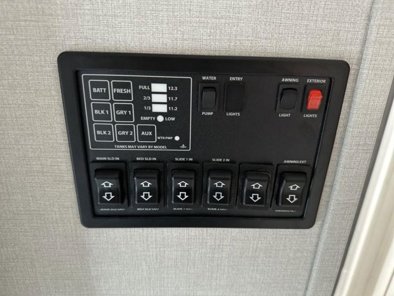 They say you can't have it all, but you can almost have it all with this fifth wheel in tow! This is the perfect unit to camp with family or a large group of friends since it features two private bunkhouses, two full baths, and two entry doors! The rear bunkhouse includes its own full bath, a tri-fold sofa and a flip-down bunk, plus a dresser to store clothes. Within the middle bunkhouse you'll find double-size bunks and overhead cabinets for your guests' things. Everyone will love to visit in the main living area that includes a free-standing table, theatre seating, and an entertainment center with a 50" 4K Smart LED TV. This Chaparral kitchen is complete with an island peninsula, pantry, plus a 16 cu. ft. side-by-side 12V refrigerator. There is also an outside entertainment center and an outside refrigerator to keep cold drinks stocked.