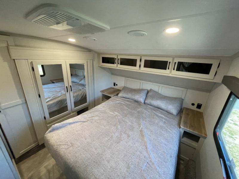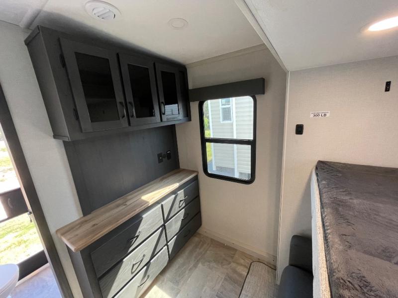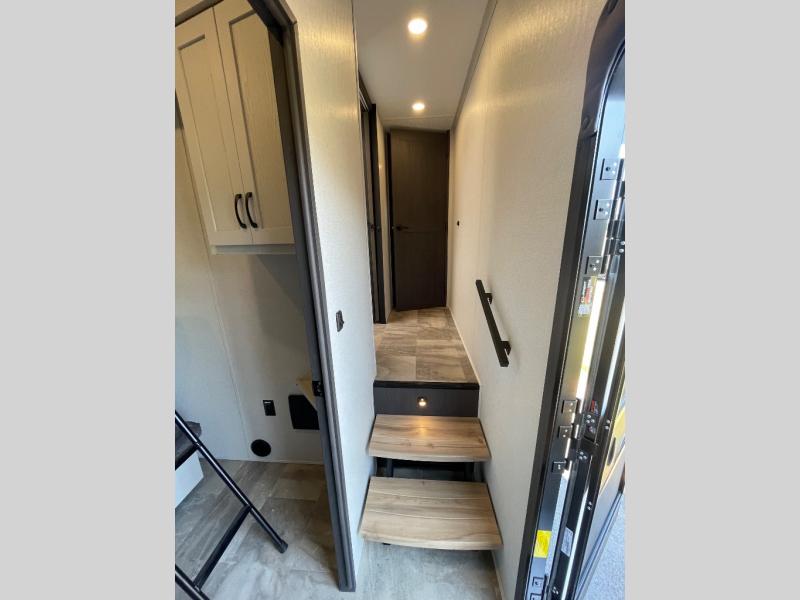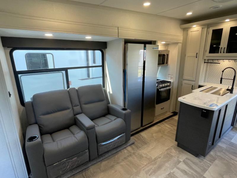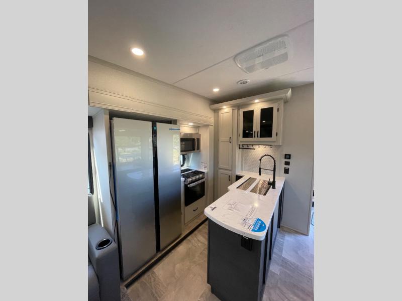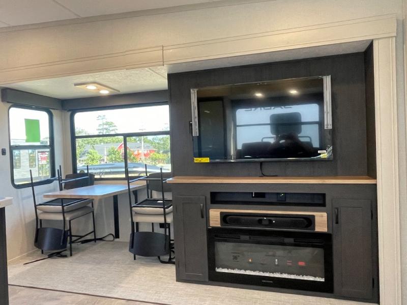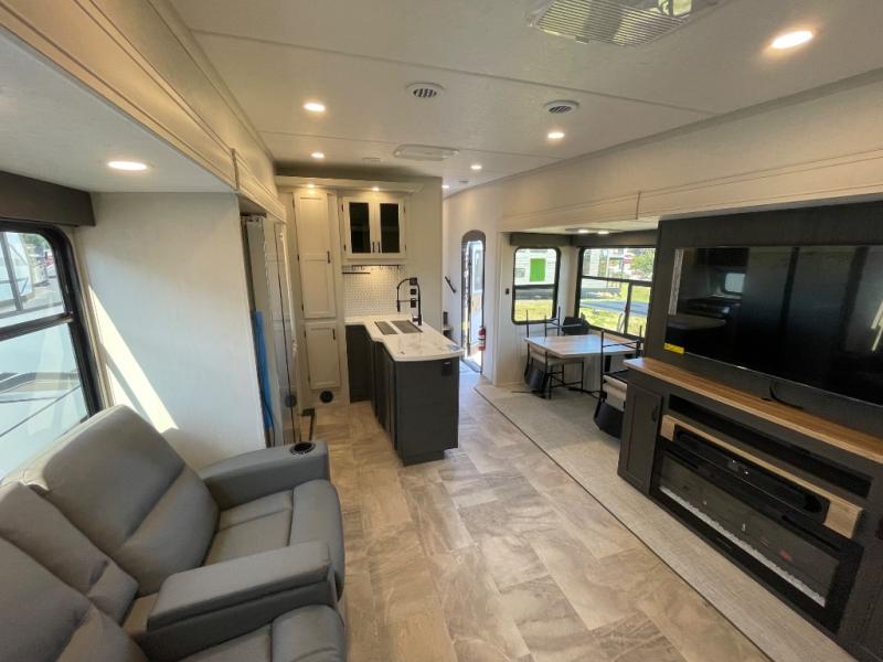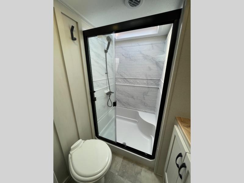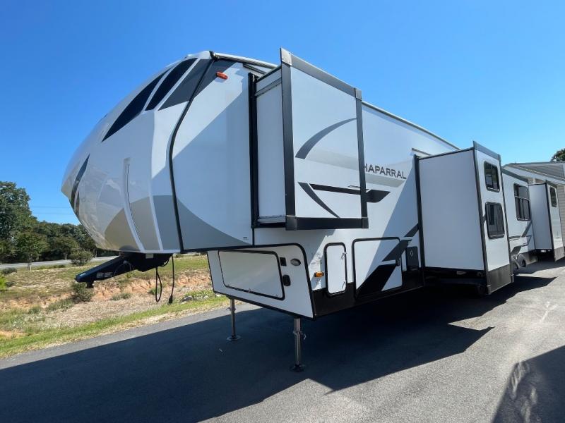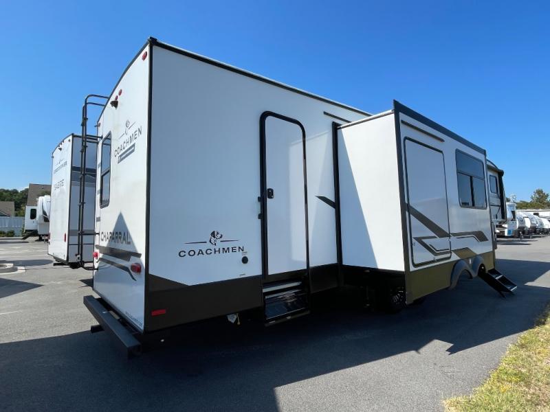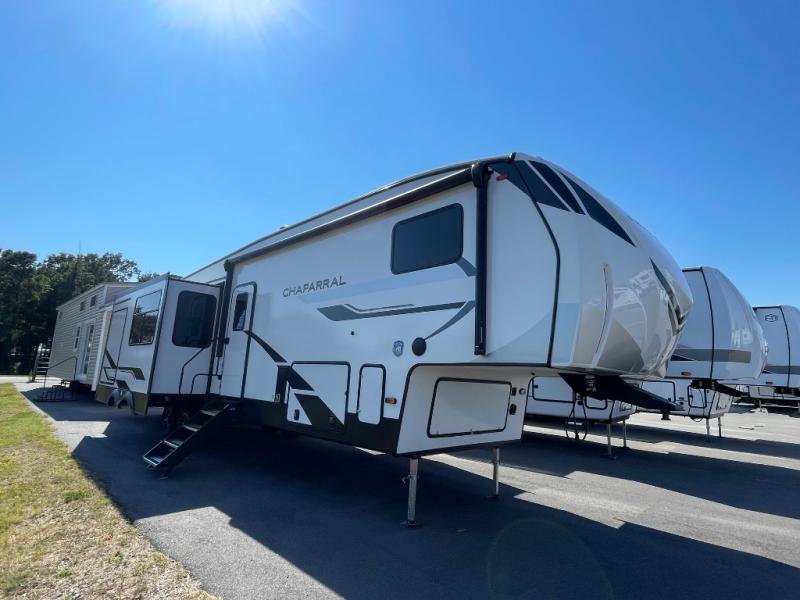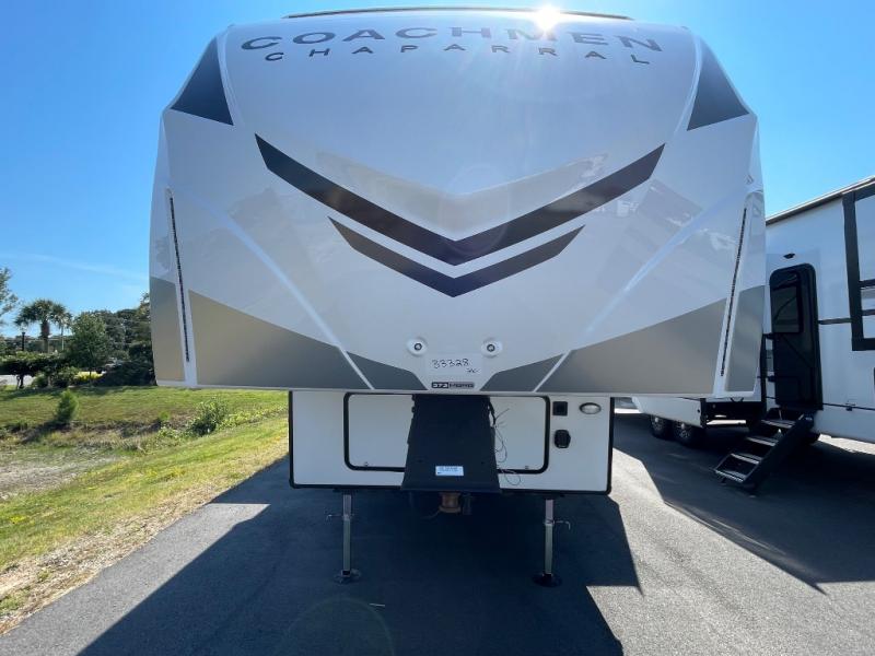 Each Chaparral mid-profile fifth wheel by Coachmen is designed with residential features, loads of storage space, and roomy bedroom suites to make you feel right at home. The durable construction means you can enjoy your RV for years to come. There's 6X double Azdel aluminum cage sidewall system, Weather Shield+ technology, and Tri-Tex powder coated frame technology that will help extend your camping season. Each model includes a Winegard Air 360+ HDTV/radio dome antenna to help keep you connected as you camp, slow rise blackout roller night shades, a new 16 cu. ft. side-by-side stainless glass 12V refrigerator, and a modern electric fireplace to make your space cozy. There is also a large transom window in the kitchen, a modern high-rise faucet, LED motion sensor lights in the bathroom, plus a full-size shower with glass doors and a seat. Now that's what I call luxury! Choose a Chaparral fifth wheel today!