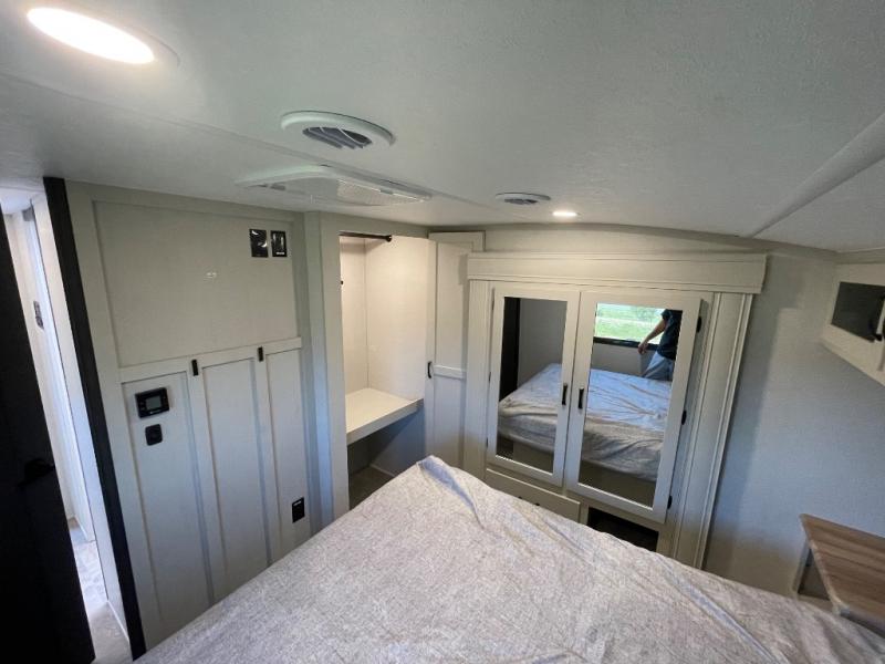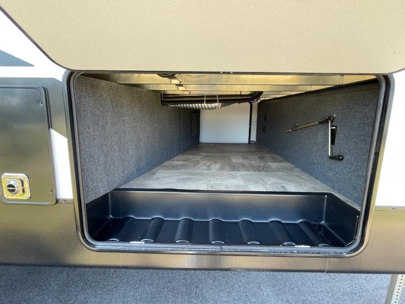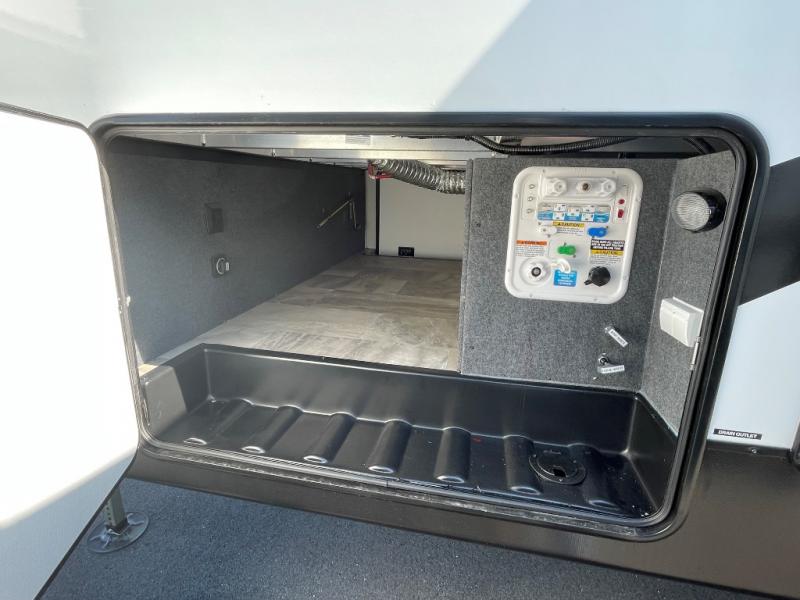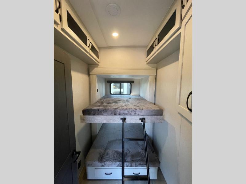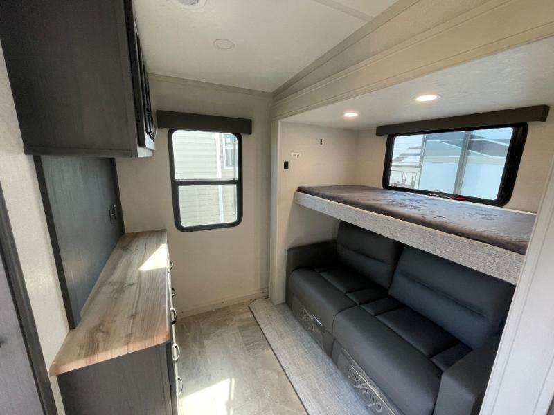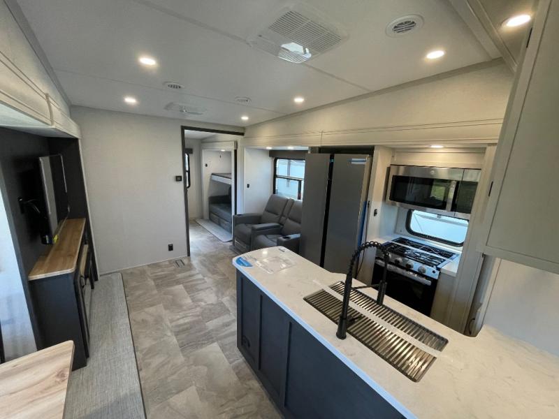 They say you can't have it all, but you can almost have it all with this fifth wheel in tow! This is the perfect unit to camp with family or a large group of friends since it features two private bunkhouses, two full baths, and two entry doors! The rear bunkhouse includes its own full bath, a tri-fold sofa and a flip-down bunk, plus a dresser to store clothes. Within the middle bunkhouse you'll find double-size bunks and overhead cabinets for your guests' things. Everyone will love to visit in the main living area that includes a free-standing table, theatre seating, and an entertainment center with a 50" 4K Smart LED TV. This Chaparral kitchen is complete with an island peninsula, pantry, plus a 16 cu. ft. side-by-side 12V refrigerator. There is also an outside entertainment center and an outside refrigerator to keep cold drinks stocked.