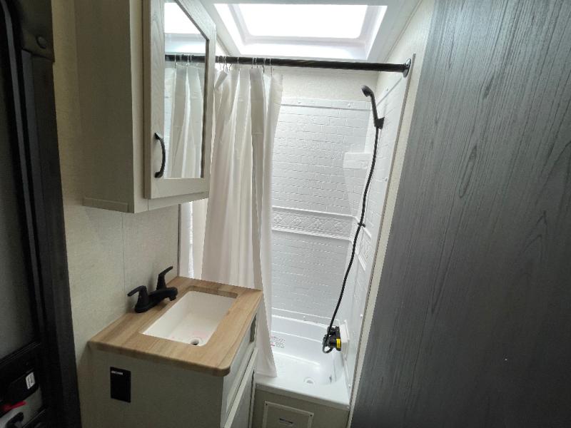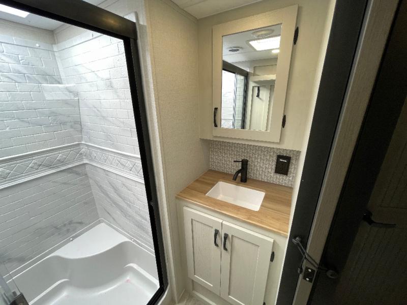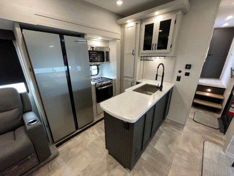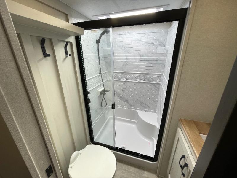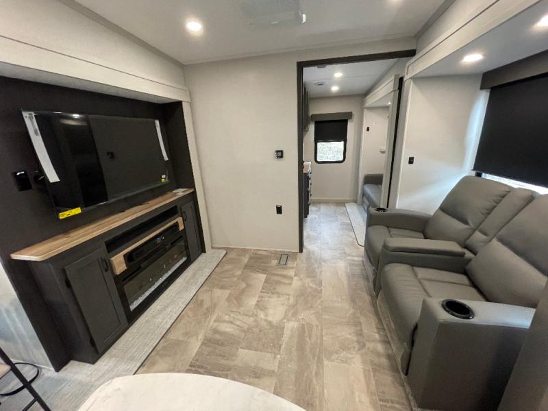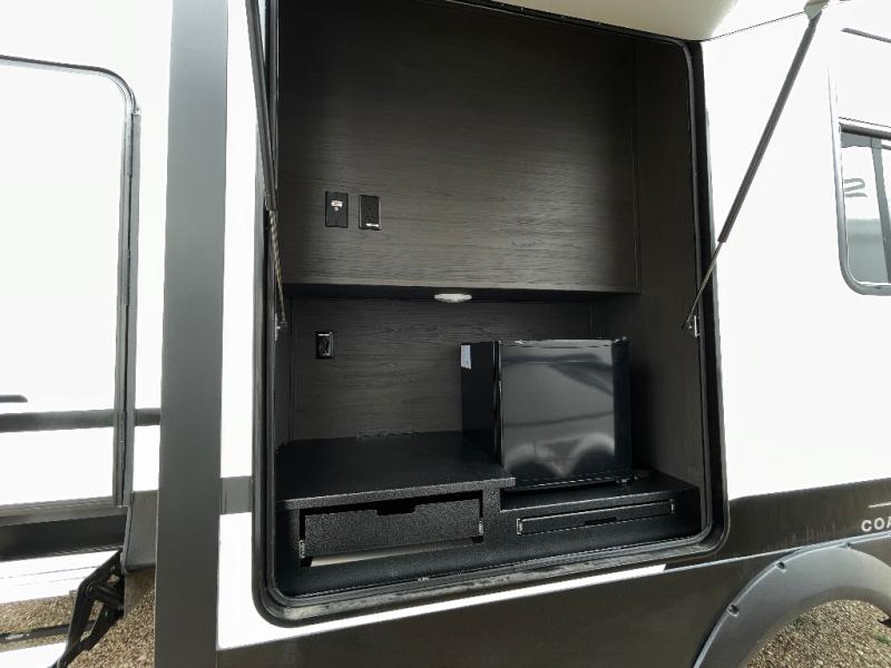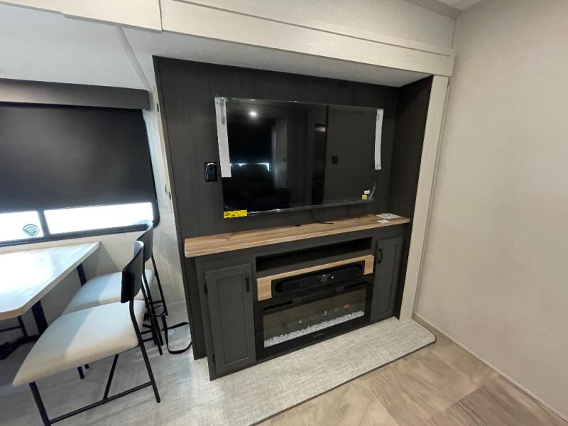 The Tri-Tex™ powder coated frame technology is up to 5X more weather resistant, and the Equa-Flex® suspension with 1/2" thick anodized shackles, bronze bushings, and greasable Zerk® fittings will make towing easier than ever. There is also a Solar Source +™ package with an upgraded 200W roof-mounted solar panel, along with an upgraded lithium-ready converter and 30AMP charge controller by Rich Solar® to support off-grid capability. To top it off, the 6X™ Double Azdel® aluminum cage sidewall system helps deliver a strong, vacuum-bonded build, while the upgraded Carbon & Walnut entertainment center with JBL® soundbar adds a premium touch. Now that's what I call luxury! Choose a Chaparral fifth wheel today!