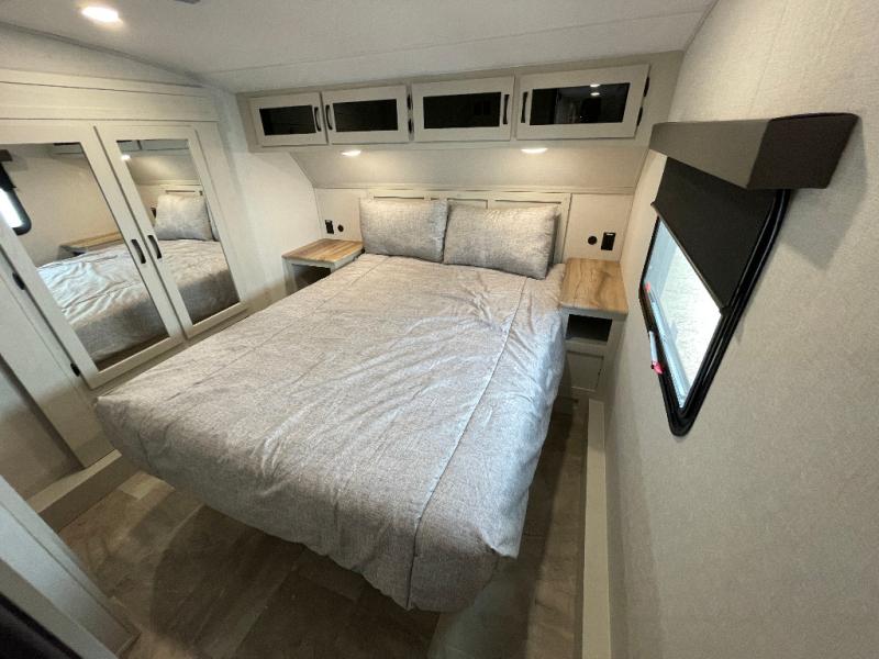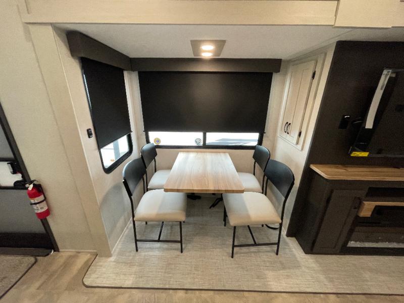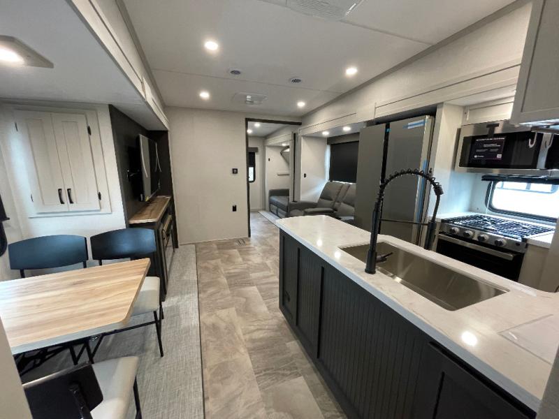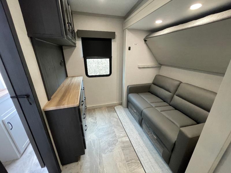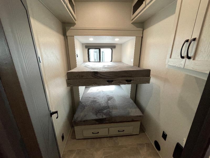 They say you can't have it all, but you can almost have it all with this fifth wheel in tow! This is the perfect unit to camp with family or a large group of friends since it features two private bunkhouses, two full baths, and two entry doors! The rear bunkhouse includes its own full bath, a tri-fold sofa and a flip-down bunk, plus a dresser to store clothes. Within the middle bunkhouse you'll find double-size bunks and overhead cabinets for your guests' things. Everyone will love to visit in the main living area that includes a free-standing table, theatre seating, and an entertainment center with a 50" 4K Smart LED TV. This Chaparral kitchen is complete with an island peninsula, pantry, plus a 16 cu. ft. side-by-side 12V refrigerator. There is also an outside entertainment center and an outside refrigerator to keep cold drinks stocked.