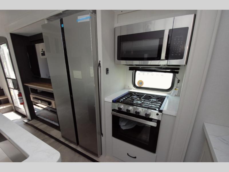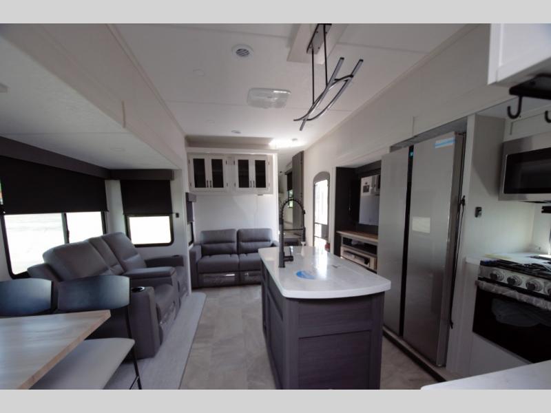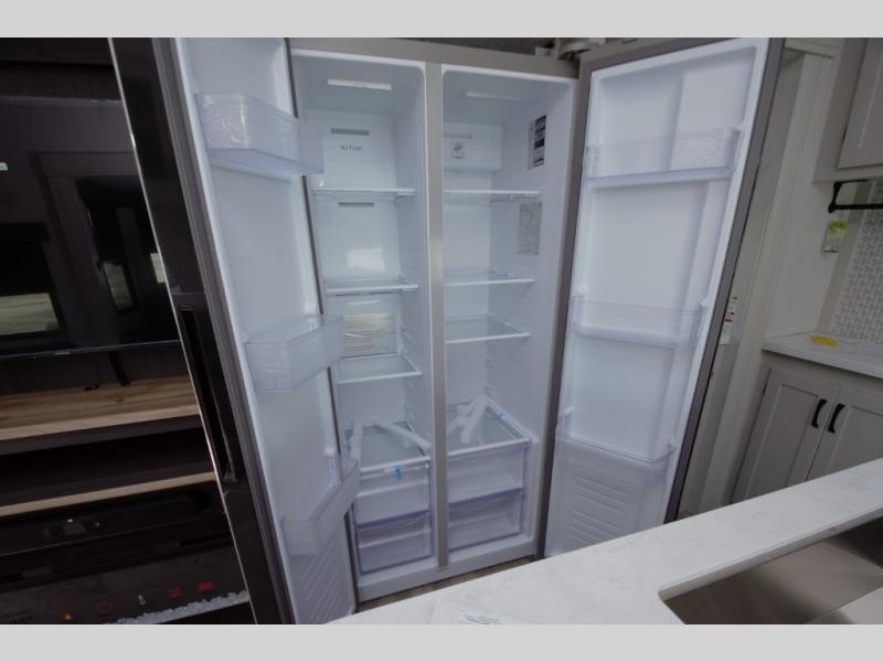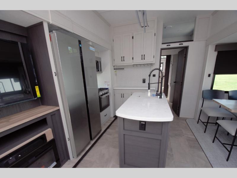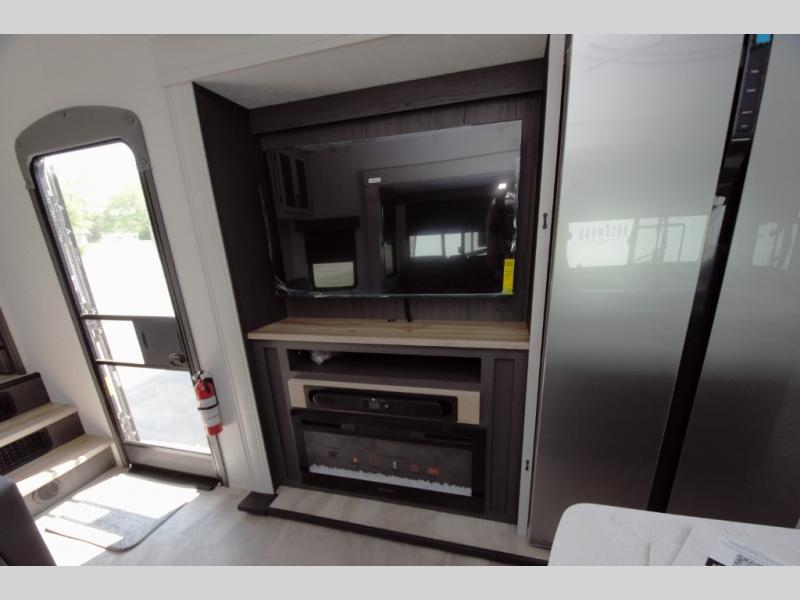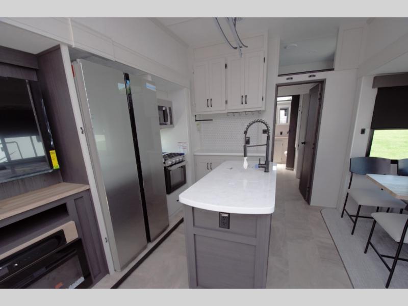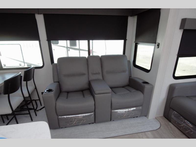 Enjoy a fully equipped kitchen with a large center island and stainless glass 12 volt refrigerator. Theater seating, a tri fold sofa, and a free standing table provide comfort for meals and movie nights. The modern electric fireplace adds a cozy touch.