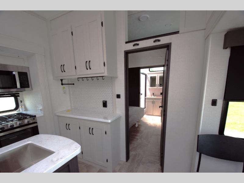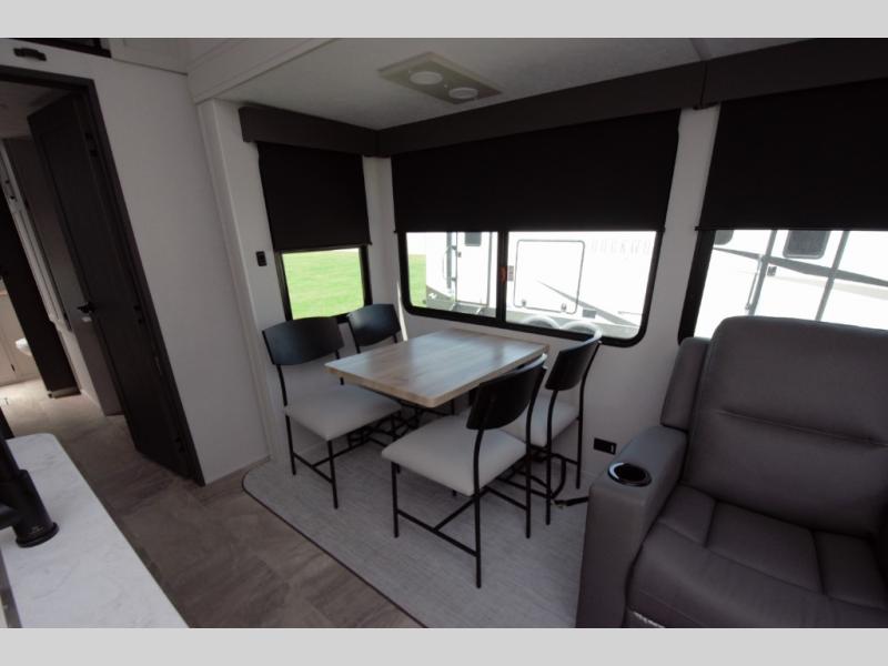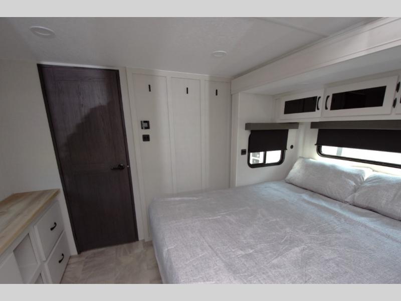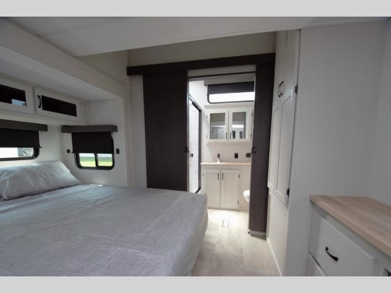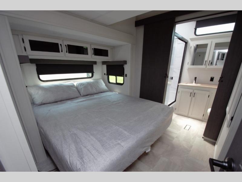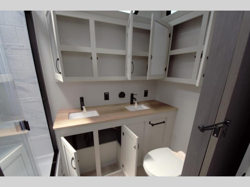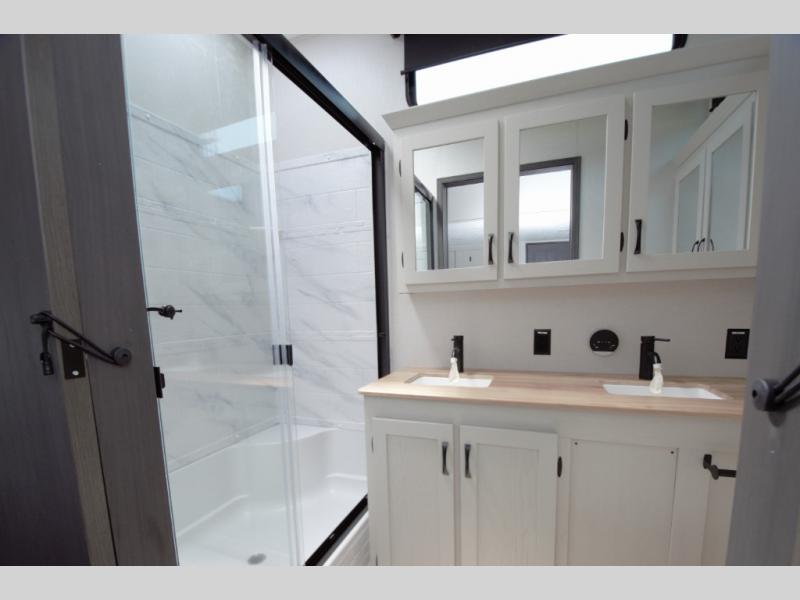 Relax in the rear master bedroom with a king bed slide and direct access to the second full bath. The rear bath features a double sink vanity, large shower with seat, and plenty of storage.