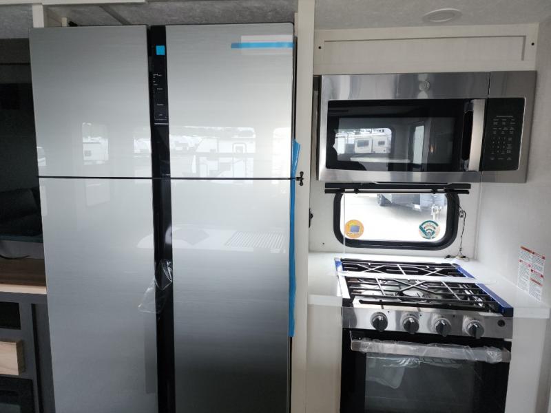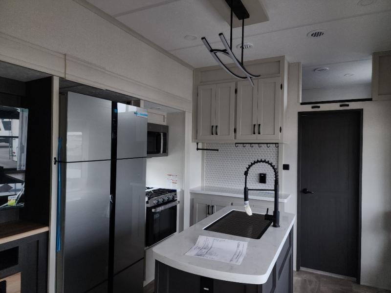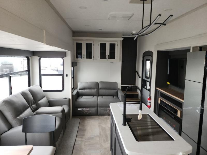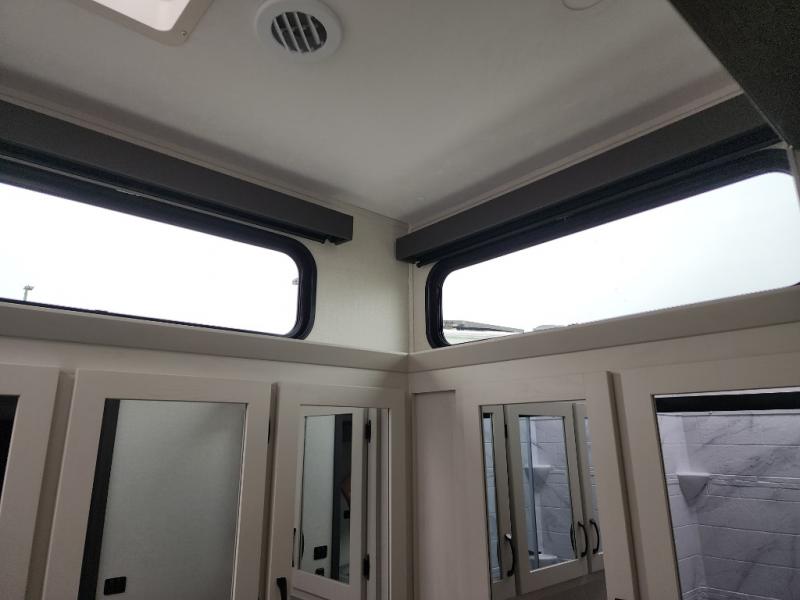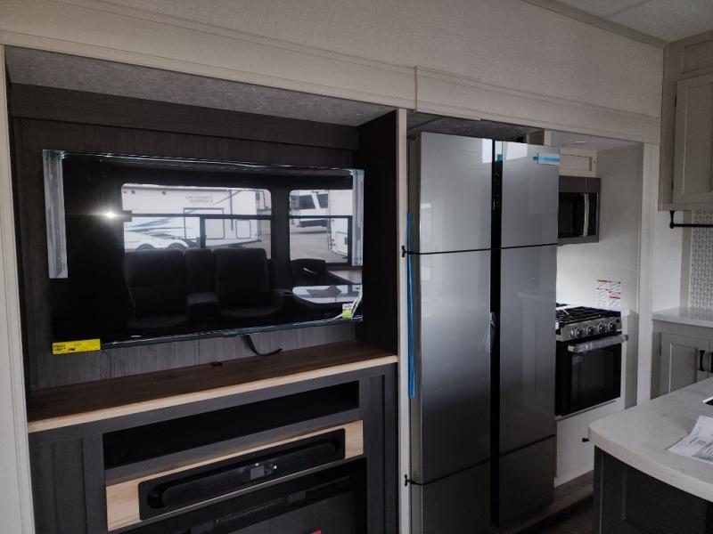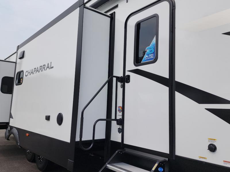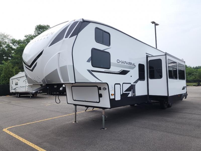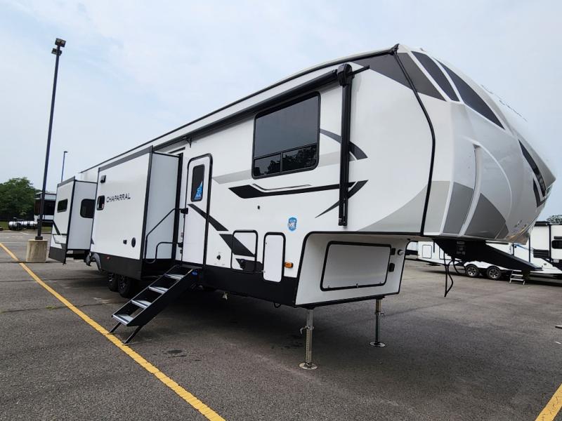 Each Chaparral mid-profile fifth wheel by Coachmen is designed with residential features, loads of storage space, and roomy bedroom suites to make you feel right at home. The durable construction means you can enjoy your RV for years to come. There's 6X double Azdel aluminum cage sidewall system, Weather Shield+ technology, and Tri-Tex powder coated frame technology that will help extend your camping season. Each model includes a Winegard Air 360+ HDTV/radio dome antenna to help keep you connected as you camp, slow rise blackout roller night shades, a new 16 cu. ft. side-by-side stainless glass 12V refrigerator, and a modern electric fireplace to make your space cozy. There is also a large transom window in the kitchen, a modern high-rise faucet, LED motion sensor lights in the bathroom, plus a full-size shower with glass doors and a seat. Now that's what I call luxury! Choose a Chaparral fifth wheel today!