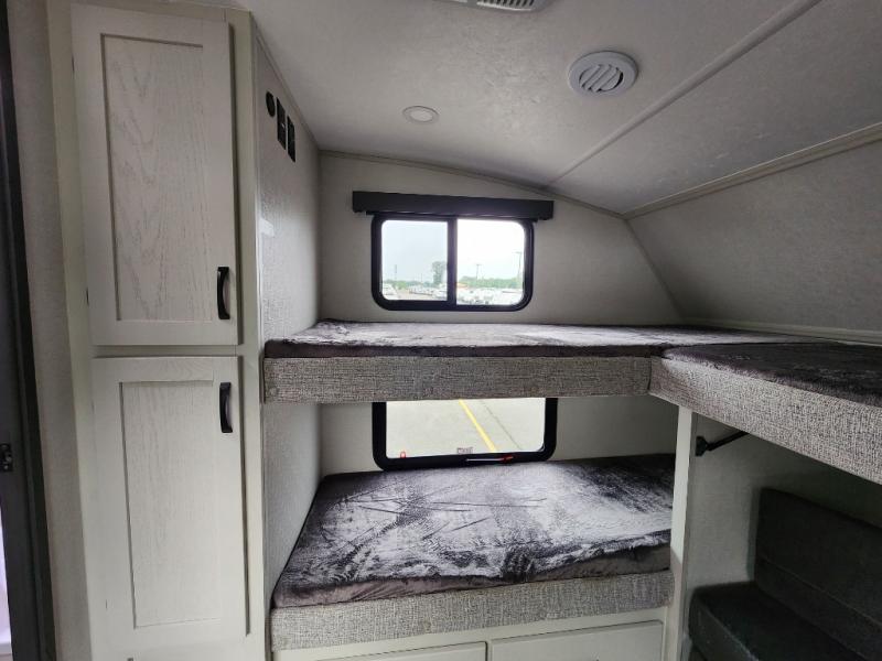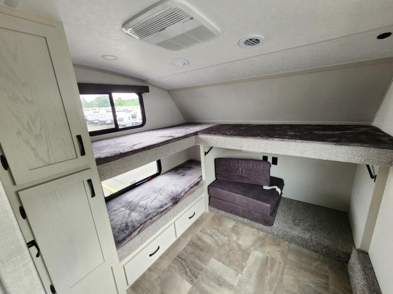 A front bunkhouse model with a private full bath, how nice! The children will love bringing along their friends with this spacious Chaparral fifth wheel. It even has a loft for added space or storage. The front bunk room features a cube sofa with a 30" x 62" bunk overhead, and 30" x 74" bunks off to the side. The full bath is located within the bunkhouse space and features a tub/shower, toilet and sink. There is also wardrobe space for clothing. Down on the main level, the combined kitchen and living area features one large slide including a theater seat and free spanning table for four. A nice center island features a sink so you can visit while prepping dinner or doing the dishes. There is also a tri-fold sofa in this space for seating and added sleeping. The rear features a master bedroom and second full bath including a king bed slide out! The full rear bath includes a vanity with two sinks, a toilet and a large shower with seat. The loft is above the rear master bedroom area and could sleep one more, or be used for added storage!