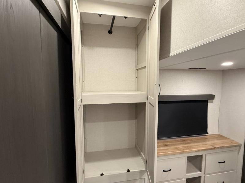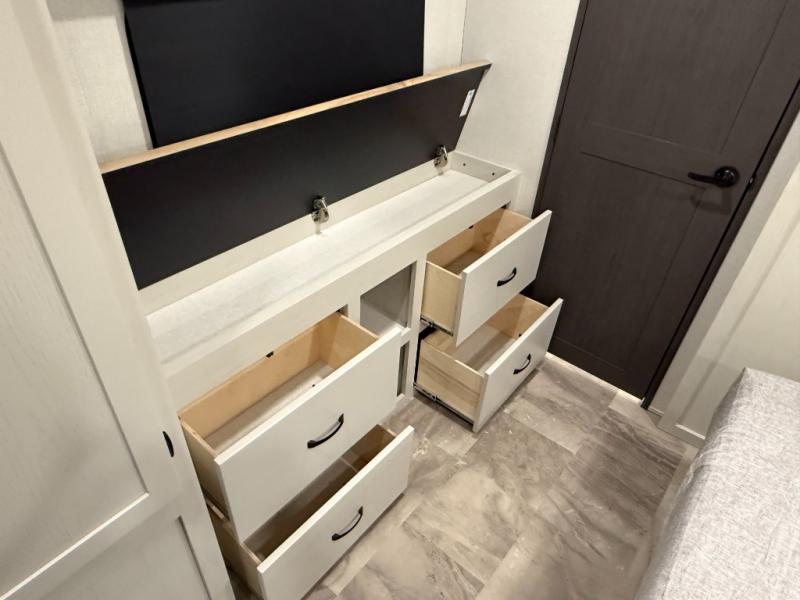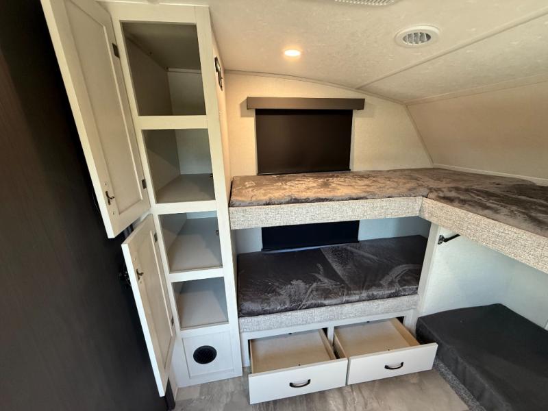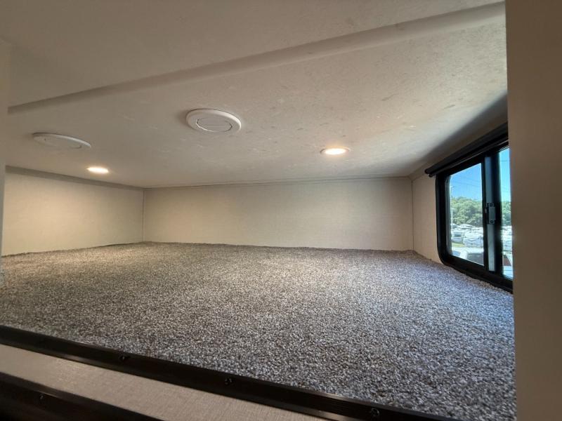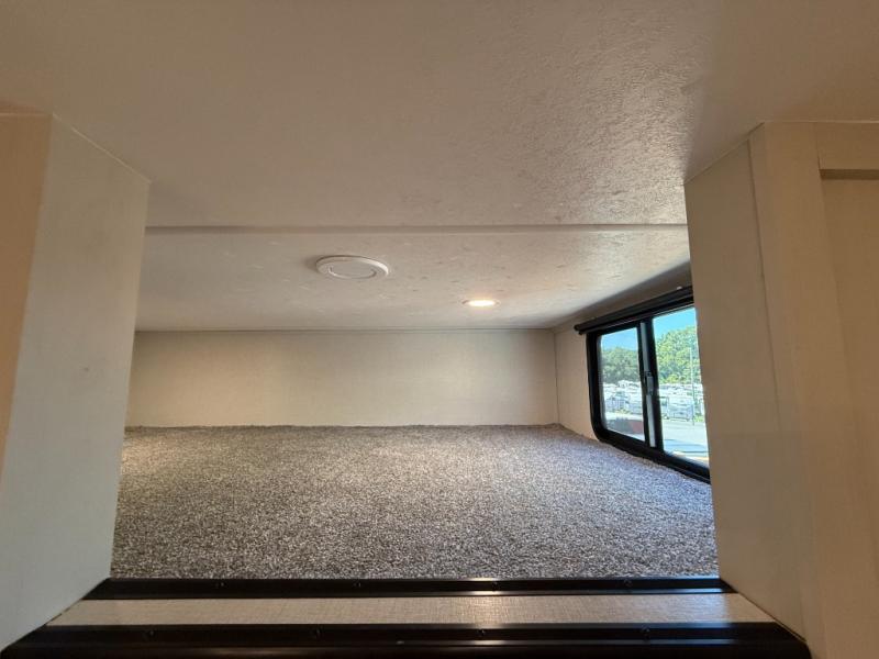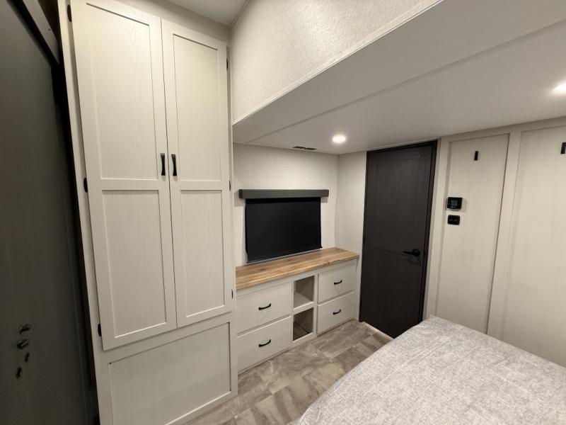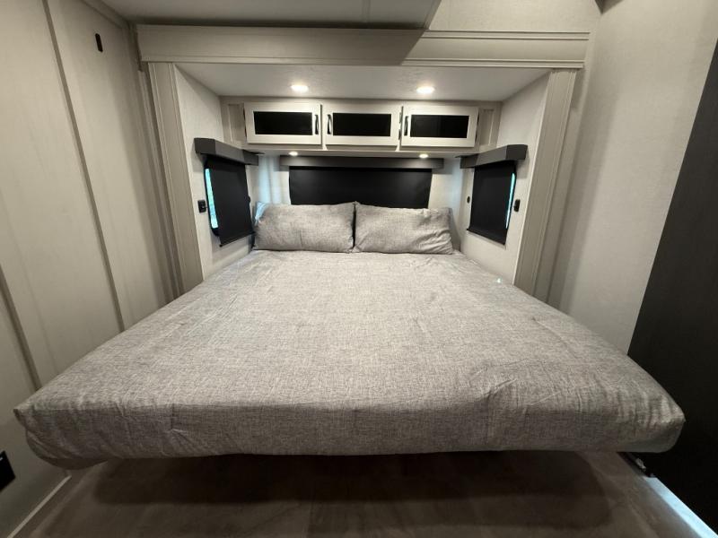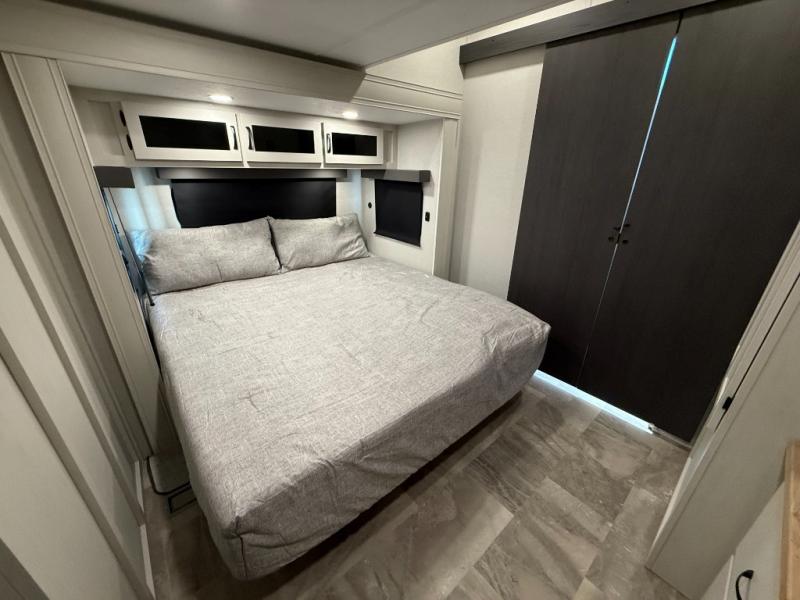 Rear master bedroom with a slide-out king-size bed, private bath, loft area above for extra sleeping or storage.