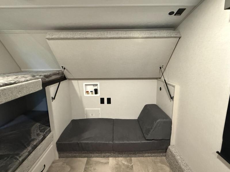 Front bunkhouse: includes cube sofa with overhead bunk, side bunks (30" x 74")