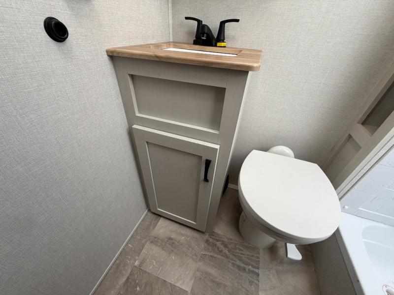 Two full bathrooms (one in the front bunkhouse and one in the rear master suite).
