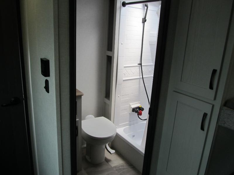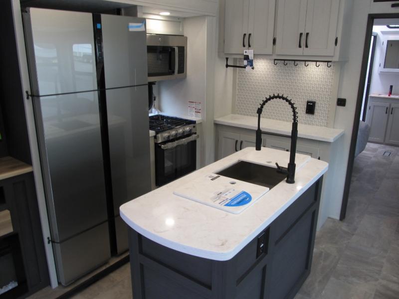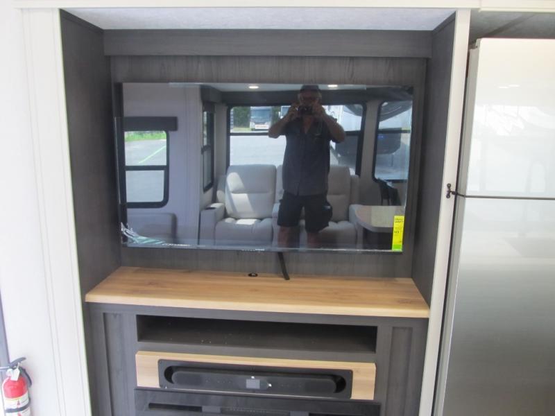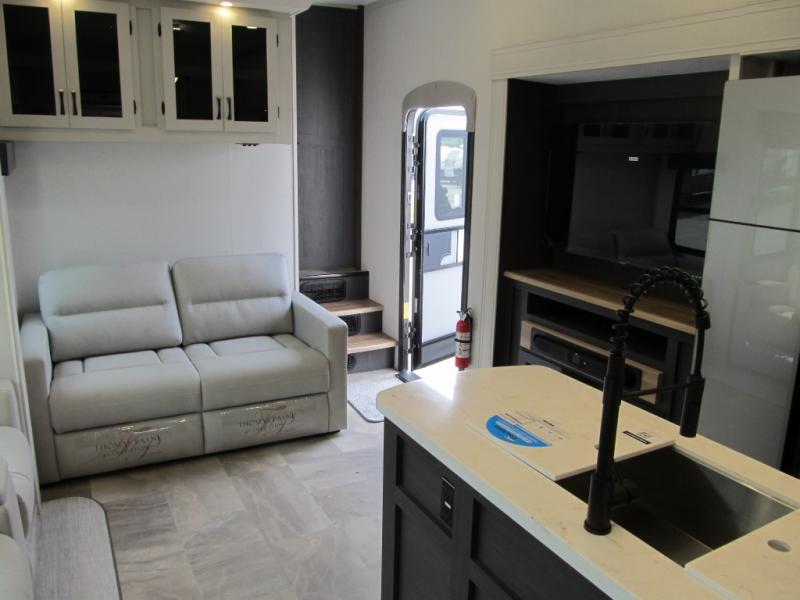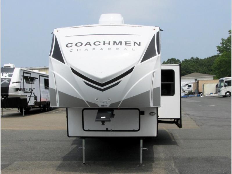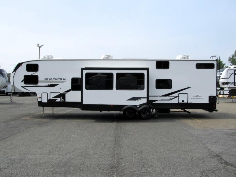 Each Chaparral mid-profile fifth wheel by Coachmen is designed with residential features, loads of storage space, and roomy bedroom suites to make you feel right at home. The durable construction means you can enjoy your RV for years to come. There's 6X double Azdel aluminum cage sidewall system, Weather Shield+ technology, and Tri-Tex powder coated frame technology that will help extend your camping season. Each model includes a Winegard Air 360+ HDTV/radio dome antenna to help keep you connected as you camp, slow rise blackout roller night shades, a new 16 cu. ft. side-by-side stainless glass 12V refrigerator, and a modern electric fireplace to make your space cozy. There is also a large transom window in the kitchen, a modern high-rise faucet, LED motion sensor lights in the bathroom, plus a full-size shower with glass doors and a seat. Now that's what I call luxury! Choose a Chaparral fifth wheel today!