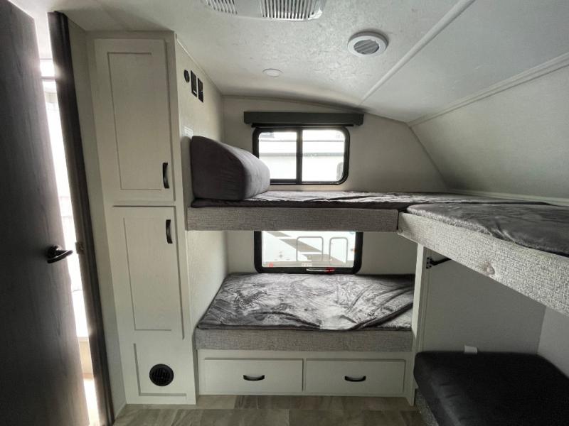 A front bunkhouse model with a private full bath, how nice! The children will love bringing along their friends with this spacious Chaparral fifth wheel. It even has a loft for added space or storage. The front bunk room features a cube sofa with a 30" x 62" bunk overhead, and 30" x 74" bunks off to the side. The full bath is located within the bunkhouse space and features a tub/shower, toilet and sink. There is also wardrobe space for clothing. Down on the main level, the combined kitchen and living area features one large slide including a theater seat and free spanning table for four. A nice center island features a sink so you can visit while prepping dinner or doing the dishes. There is also a tri-fold sofa in this space for seating and added sleeping. The rear features a master bedroom and second full bath including a king bed slide out! The full rear bath includes a vanity with two sinks, a toilet and a large shower with seat. The loft is above the rear master bedroom area and could sleep one more, or be used for added storage!