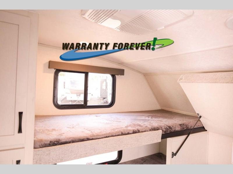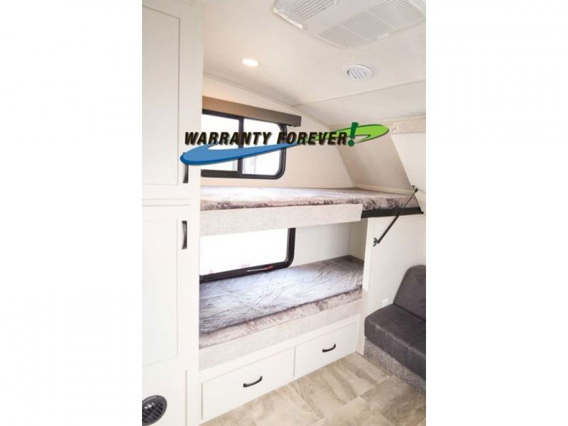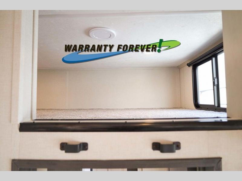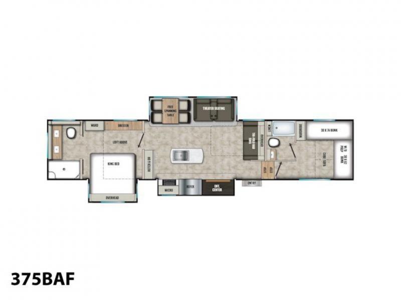 A front bunkhouse model with a private full bath, how nice! The children will love bringing along their friends with this spacious Chaparral fifth wheel. It even has a loft for added space or storage. The front bunk room features a cube sofa with a 30" x 62" bunk overhead, and 30" x 74" bunks off to the side. The full bath is located within the bunkhouse space and features a tub/shower, toilet and sink. There is also wardrobe space for clothing. Down on the main level, the combined kitchen and living area features one large slide including a theater seat and free spanning table for four. A nice center island features a sink so you can visit while prepping dinner or doing the dishes. There is also a tri-fold sofa in this space for seating and added sleeping. The rear features a master bedroom and second full bath including a king bed slide out! The full rear bath includes a vanity with two sinks, a toilet and a large shower with seat. The loft is above the rear master bedroom area and could sleep one more, or be used for added storage!