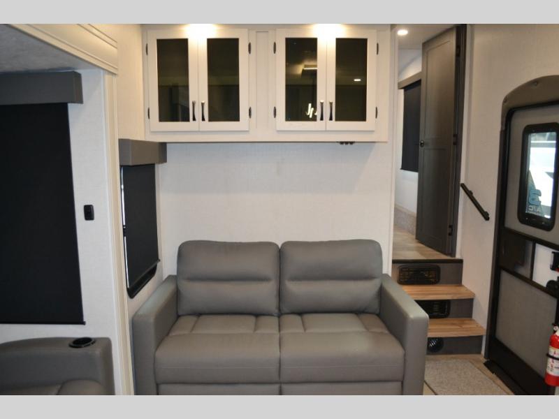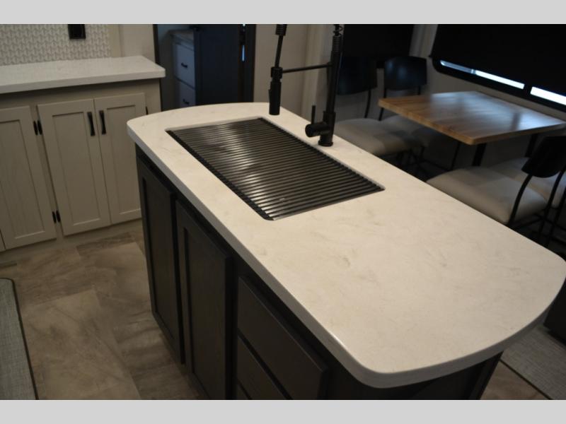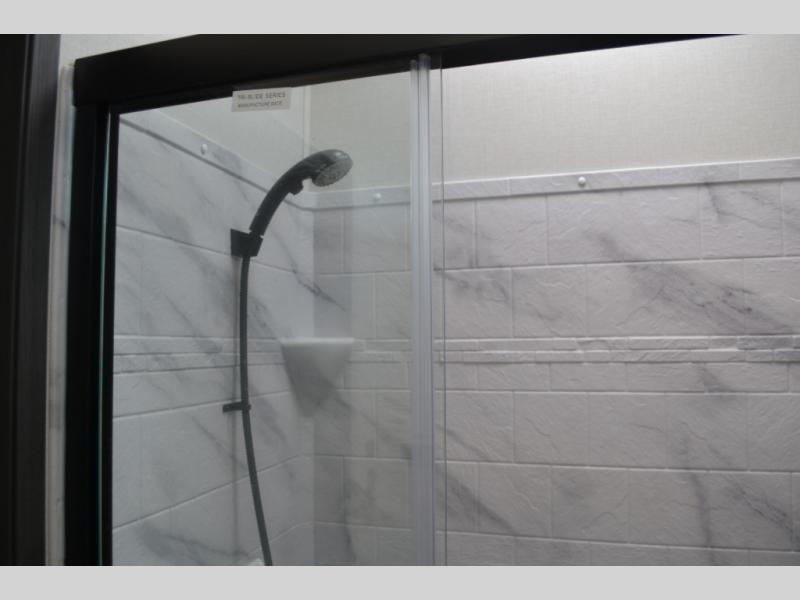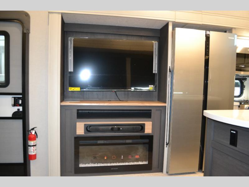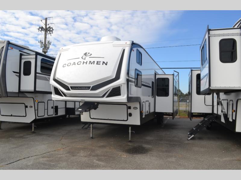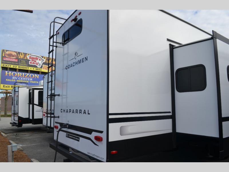 Each Chaparral mid-profile fifth wheel by Coachmen is designed with residential features, loads of storage space, and roomy bedroom suites to make you feel right at home. The durable construction means you can enjoy your RV for years to come. There's 6X double Azdel aluminum cage sidewall system, Weather Shield+ technology, and Tri-Tex powder coated frame technology that will help extend your camping season. Each model includes a Winegard Air 360+ HDTV/radio dome antenna to help keep you connected as you camp, slow rise blackout roller night shades, a new 16 cu. ft. side-by-side stainless glass 12V refrigerator, and a modern electric fireplace to make your space cozy. There is also a large transom window in the kitchen, a modern high-rise faucet, LED motion sensor lights in the bathroom, plus a full-size shower with glass doors and a seat. Now that's what I call luxury! Choose a Chaparral fifth wheel today!