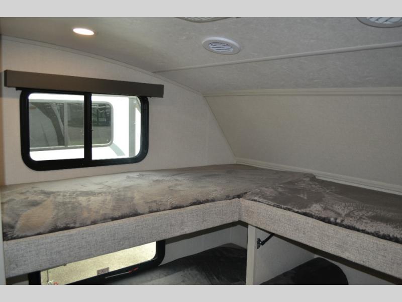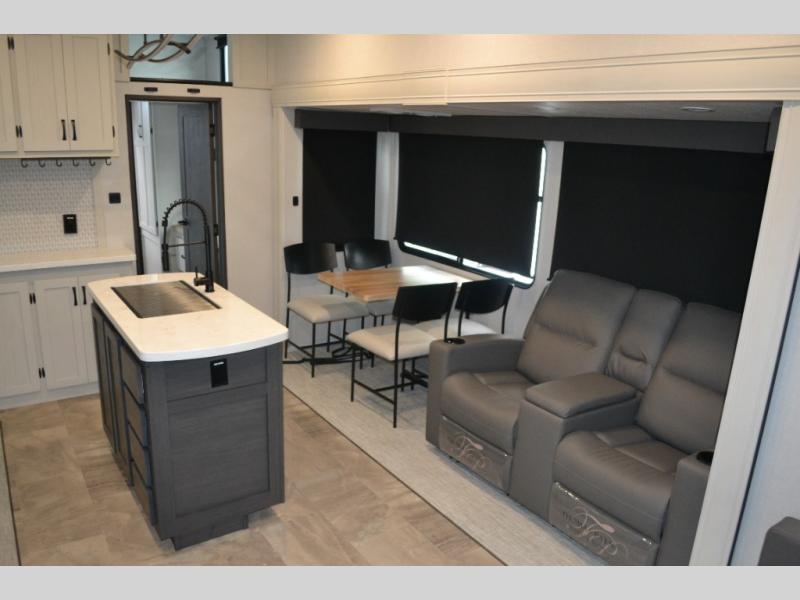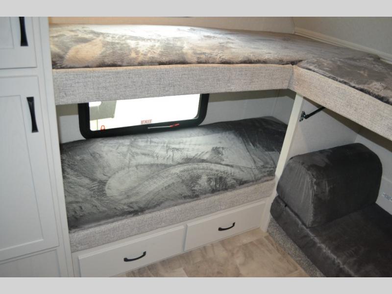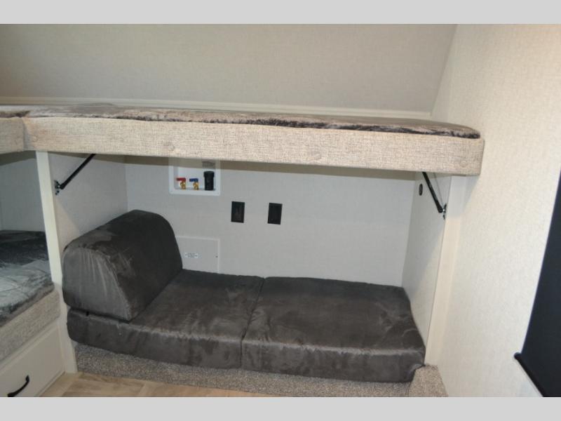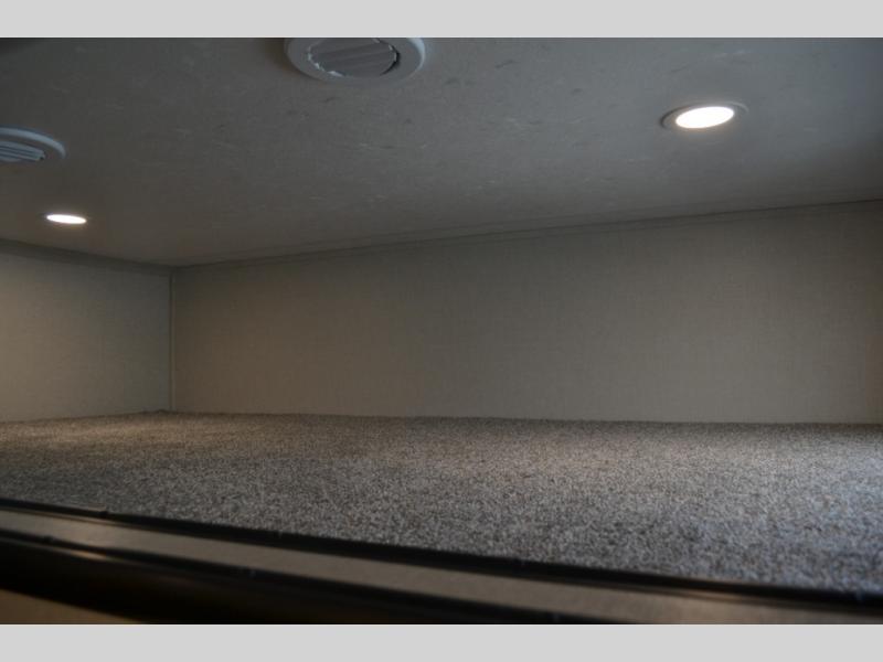 A front bunkhouse model with a private full bath, how nice! The children will love bringing along their friends with this spacious Chaparral fifth wheel. It even has a loft for added space or storage. The front bunk room features a cube sofa with a 30" x 62" bunk overhead, and 30" x 74" bunks off to the side. The full bath is located within the bunkhouse space and features a tub/shower, toilet and sink. There is also wardrobe space for clothing. Down on the main level, the combined kitchen and living area features one large slide including a theater seat and free spanning table for four. A nice center island features a sink so you can visit while prepping dinner or doing the dishes. There is also a tri-fold sofa in this space for seating and added sleeping. The rear features a master bedroom and second full bath including a king bed slide out! The full rear bath includes a vanity with two sinks, a toilet and a large shower with seat. The loft is above the rear master bedroom area and could sleep one more, or be used for added storage!
