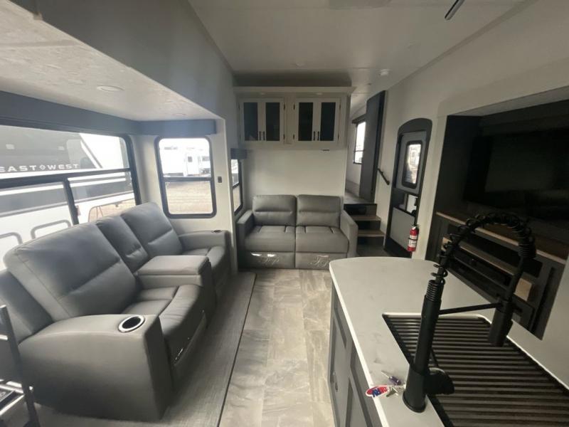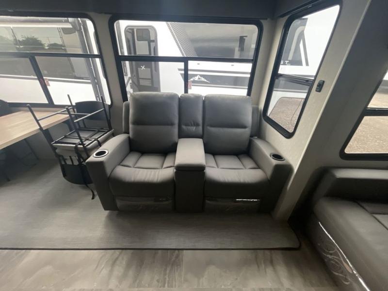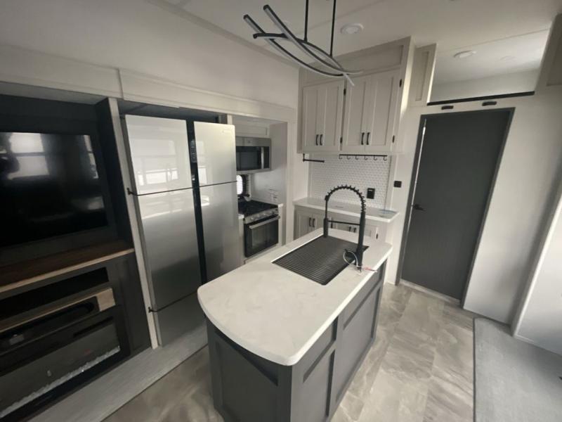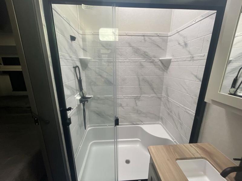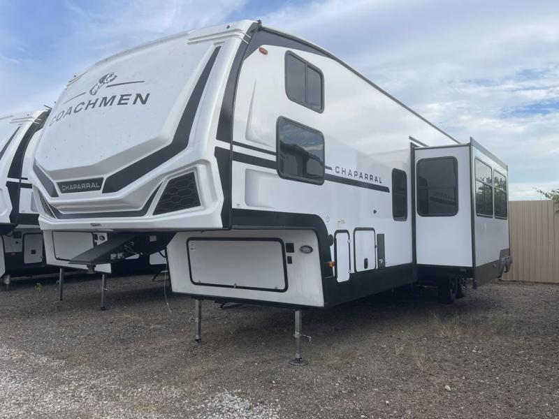 Each Chaparral mid-profile fifth wheel by Coachmen is designed with residential features, loads of storage space, and roomy bedroom suites to make you feel right at home. The durable construction means you can enjoy your RV for years to come. There's 6X double Azdel aluminum cage sidewall system, Weather Shield+ technology, and Tri-Tex powder coated frame technology that will help extend your camping season. Each model includes a Winegard Air 360+ HDTV/radio dome antenna to help keep you connected as you camp, slow rise blackout roller night shades, a new 16 cu. ft. side-by-side stainless glass 12V refrigerator, and a modern electric fireplace to make your space cozy. There is also a large transom window in the kitchen, a modern high-rise faucet, LED motion sensor lights in the bathroom, plus a full-size shower with glass doors and a seat. Now that's what I call luxury! Choose a Chaparral fifth wheel today!
