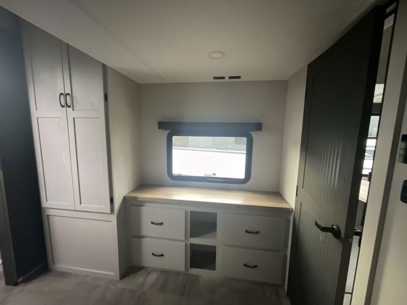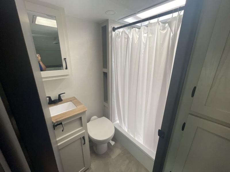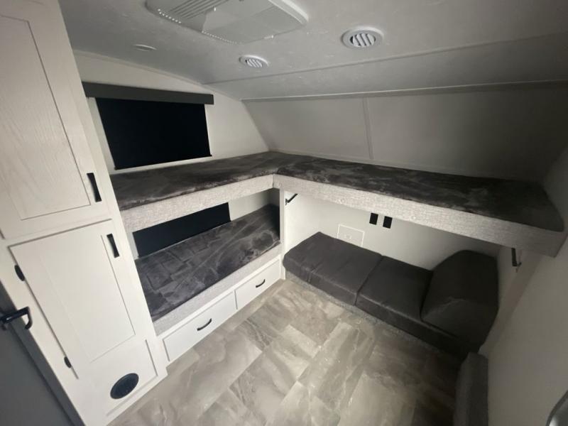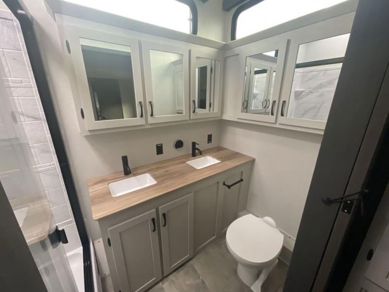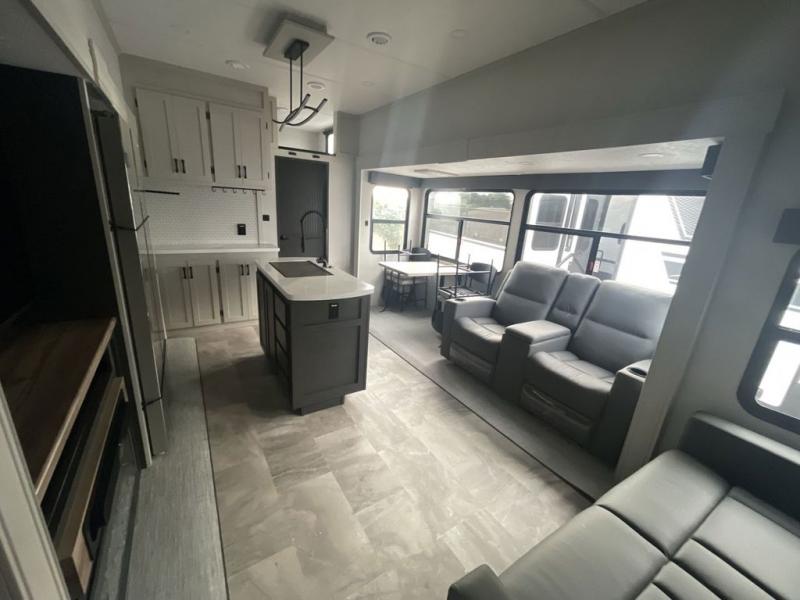 A front bunkhouse model with a private full bath, how nice! The children will love bringing along their friends with this spacious Chaparral fifth wheel. It even has a loft for added space or storage. The front bunk room features a cube sofa with a 30" x 62" bunk overhead, and 30" x 74" bunks off to the side. The full bath is located within the bunkhouse space and features a tub/shower, toilet and sink. There is also wardrobe space for clothing. Down on the main level, the combined kitchen and living area features one large slide including a theater seat and free spanning table for four. A nice center island features a sink so you can visit while prepping dinner or doing the dishes. There is also a tri-fold sofa in this space for seating and added sleeping. The rear features a master bedroom and second full bath including a king bed slide out! The full rear bath includes a vanity with two sinks, a toilet and a large shower with seat. The loft is above the rear master bedroom area and could sleep one more, or be used for added storage!