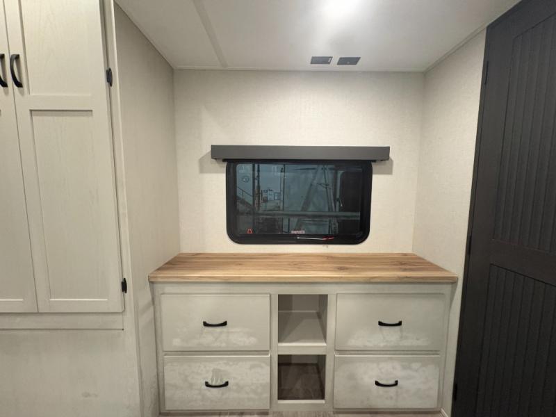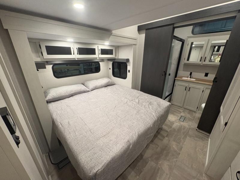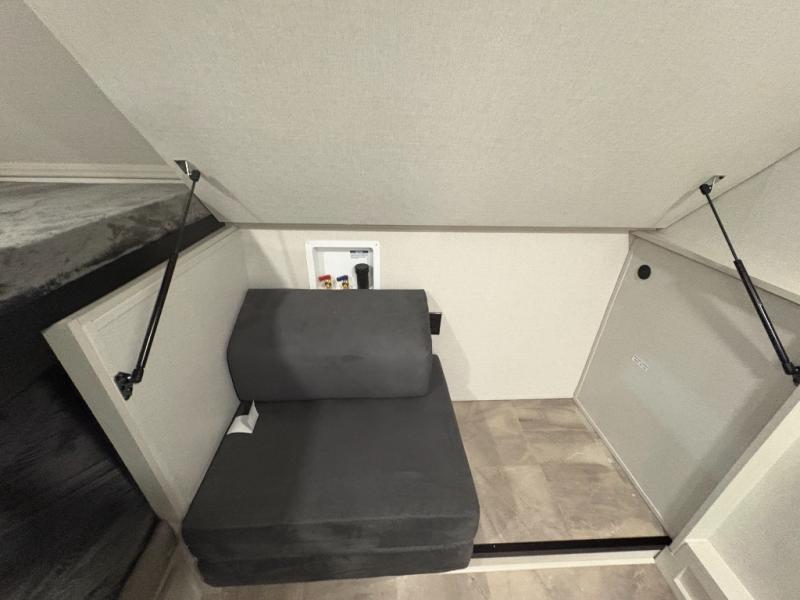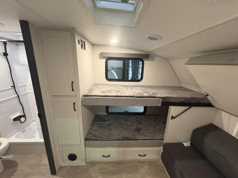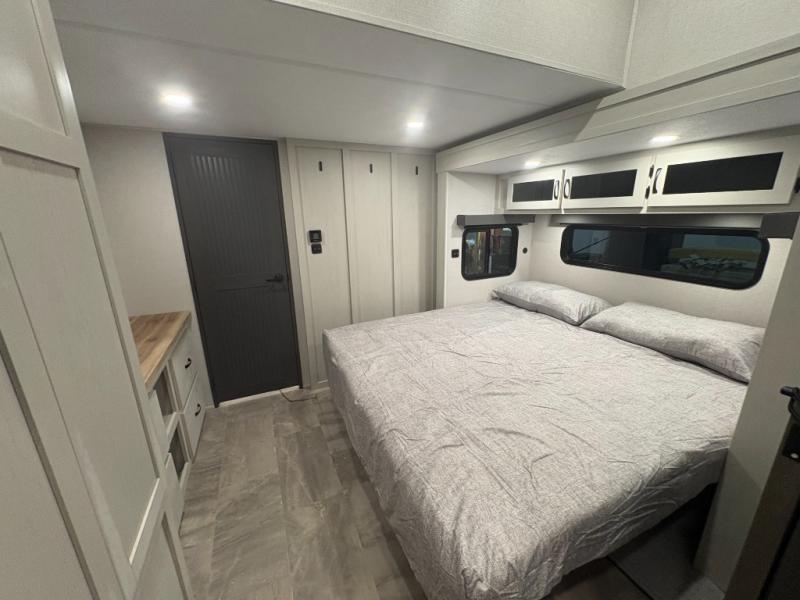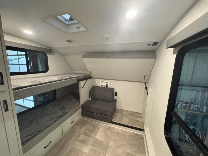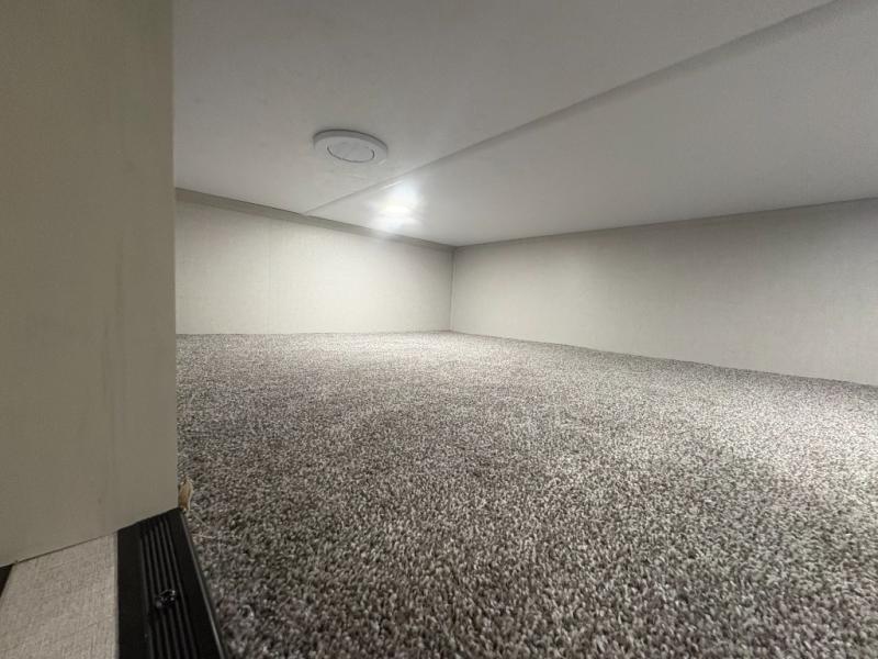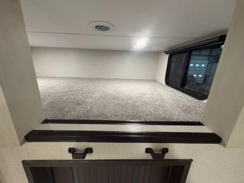 A front bunkhouse model with a private full bath, how nice! The children will love bringing along their friends with this spacious Chaparral fifth wheel. It even has a loft for added space or storage. The front bunk room features a cube sofa with a 30" x 62" bunk overhead, and 30" x 74" bunks off to the side. The full bath is located within the bunkhouse space and features a tub/shower, toilet and sink. There is also wardrobe space for clothing. Down on the main level, the combined kitchen and living area features one large slide including a theater seat and free spanning table for four. A nice center island features a sink so you can visit while prepping dinner or doing the dishes. There is also a tri-fold sofa in this space for seating and added sleeping. The rear features a master bedroom and second full bath including a king bed slide out! The full rear bath includes a vanity with two sinks, a toilet and a large shower with seat. The loft is above the rear master bedroom area and could sleep one more, or be used for added storage!