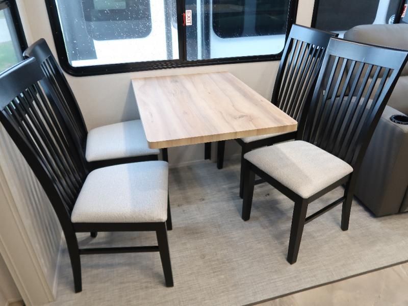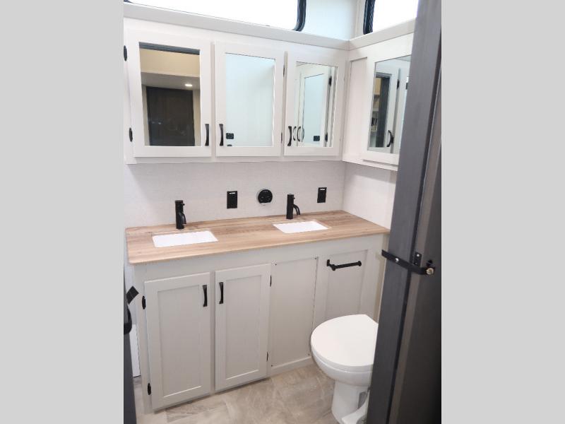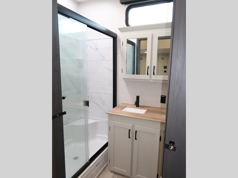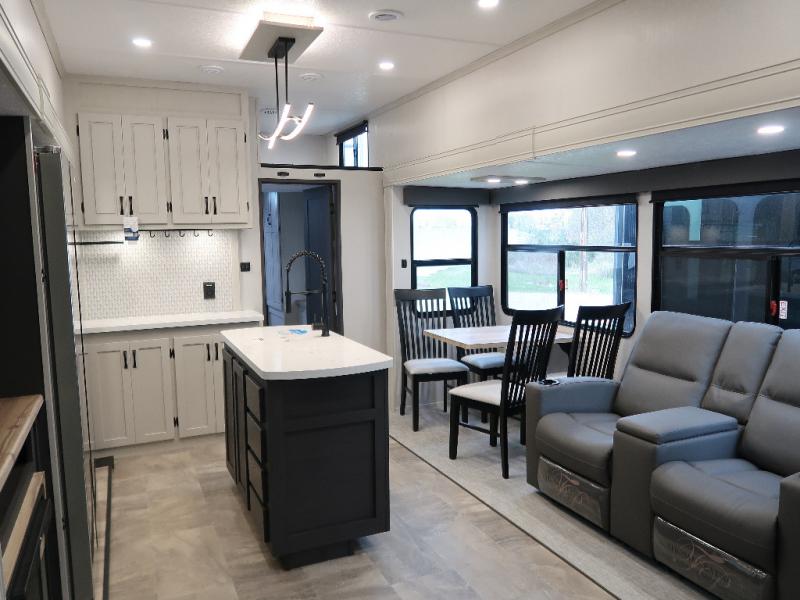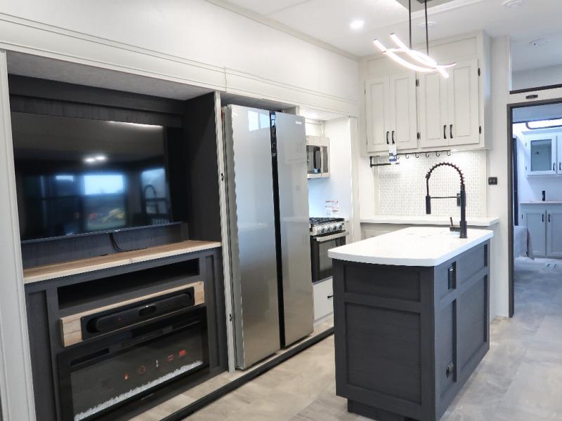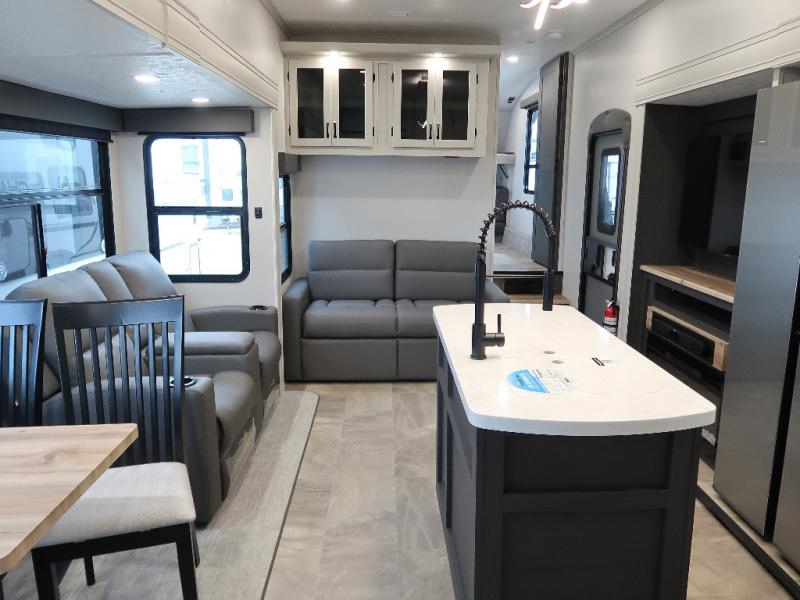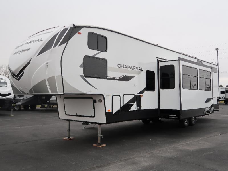 Each Chaparral mid-profile fifth wheel by Coachmen is designed with residential features, loads of storage space, and roomy bedroom suites to make you feel right at home. The durable construction means you can enjoy your RV for years to come. There's 6X double Azdel aluminum cage sidewall system, Weather Shield+ technology, and Tri-Tex powder coated frame technology that will help extend your camping season. Each model includes a Winegard Air 360+ HDTV/radio dome antenna to help keep you connected as you camp, slow rise blackout roller night shades, a new 16 cu. ft. side-by-side stainless glass 12V refrigerator, and a modern electric fireplace to make your space cozy. There is also a large transom window in the kitchen, a modern high-rise faucet, LED motion sensor lights in the bathroom, plus a full-size shower with glass doors and a seat. Now that's what I call luxury! Choose a Chaparral fifth wheel today!