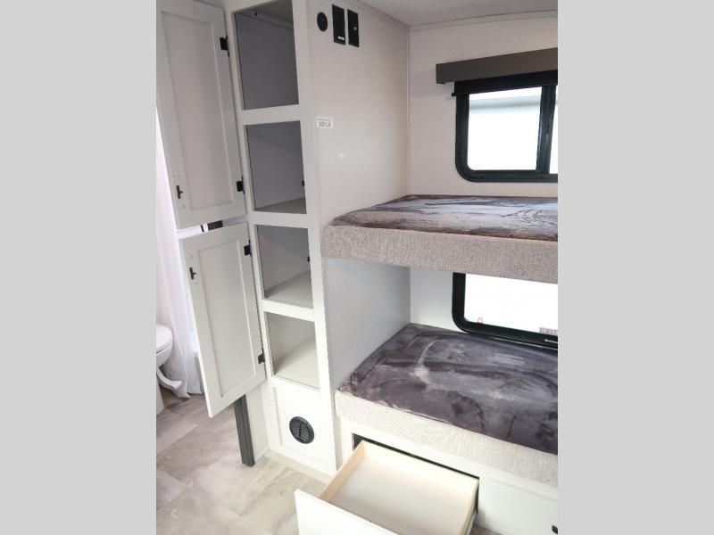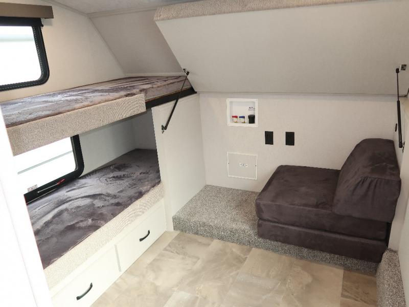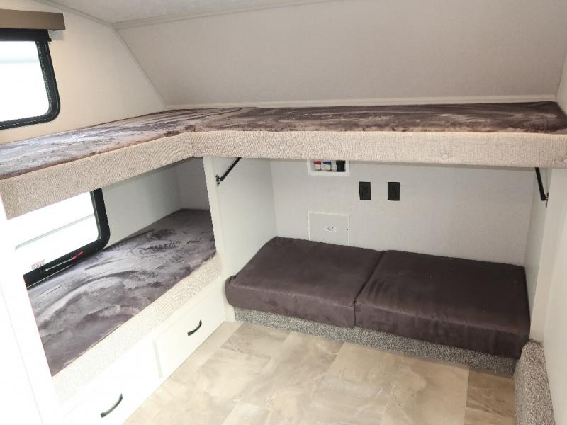 A front bunkhouse model with a private full bath, how nice! The children will love bringing along their friends with this spacious Chaparral fifth wheel. It even has a loft for added space or storage. The front bunk room features a cube sofa with a 30" x 62" bunk overhead, and 30" x 74" bunks off to the side. The full bath is located within the bunkhouse space and features a tub/shower, toilet and sink. There is also wardrobe space for clothing. Down on the main level, the combined kitchen and living area features one large slide including a theater seat and free spanning table for four. A nice center island features a sink so you can visit while prepping dinner or doing the dishes. There is also a tri-fold sofa in this space for seating and added sleeping. The rear features a master bedroom and second full bath including a king bed slide out! The full rear bath includes a vanity with two sinks, a toilet and a large shower with seat. The loft is above the rear master bedroom area and could sleep one more, or be used for added storage!