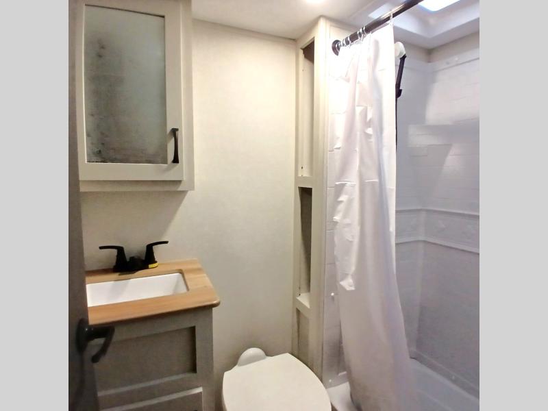 A front bunkhouse model with a private full bath, how nice! The children will love bringing along their friends with this spacious Chaparral fifth wheel. It even has a loft for added space or storage. The front bunk room features a cube sofa with a 30" x 62" bunk overhead, and 30" x 74" bunks off to the side. The full bath is located within the bunkhouse space and features a tub/shower, toilet and sink. There is also wardrobe space for clothing. Down on the main level, the combined kitchen and living area features one large slide including a theater seat and free spanning table for four. A nice center island features a sink so you can visit while prepping dinner or doing the dishes. There is also a tri-fold sofa in this space for seating and added sleeping. The rear features a master bedroom and second full bath including a king bed slide out! The full rear bath includes a vanity with two sinks, a toilet and a large shower with seat. The loft is above the rear master bedroom area and could sleep one more, or be used for added storage!