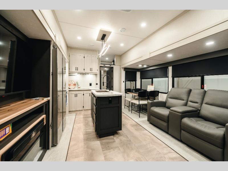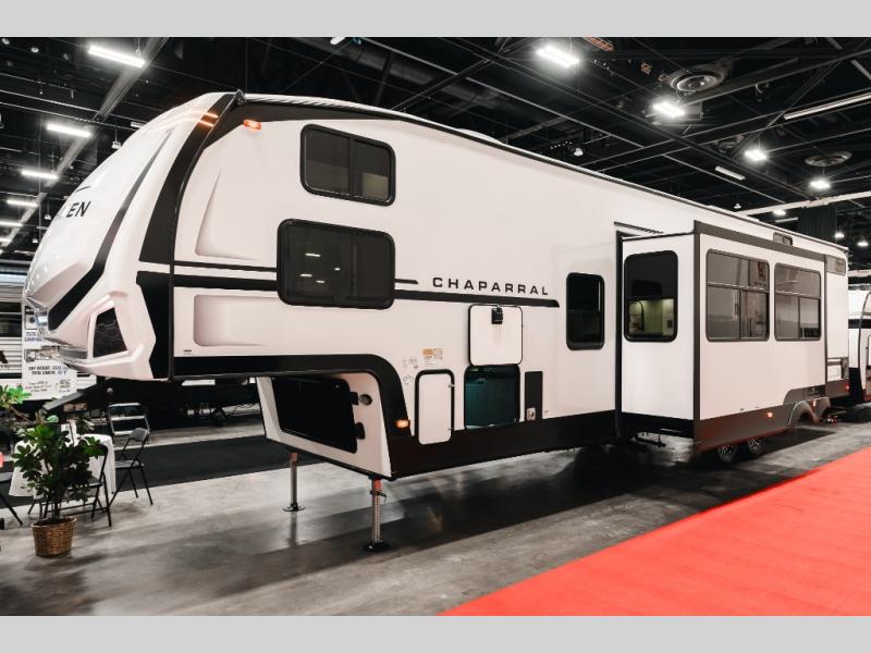 Each Chaparral mid-profile fifth wheel by Coachmen is designed with residential features, loads of storage space, and roomy bedroom suites to make you feel right at home. The durable construction means you can enjoy your RV for years to come. There's 6X double Azdel aluminum cage sidewall system, Weather Shield+ technology, and Tri-Tex powder coated frame technology that will help extend your camping season. Each model includes a Winegard Air 360+ HDTV/radio dome antenna to help keep you connected as you camp, slow rise blackout roller night shades, a new 16 cu. ft. side-by-side stainless glass 12V refrigerator, and a modern electric fireplace to make your space cozy. There is also a large transom window in the kitchen, a modern high-rise faucet, LED motion sensor lights in the bathroom, plus a full-size shower with glass doors and a seat. Now that's what I call luxury! Choose a Chaparral fifth wheel today!
