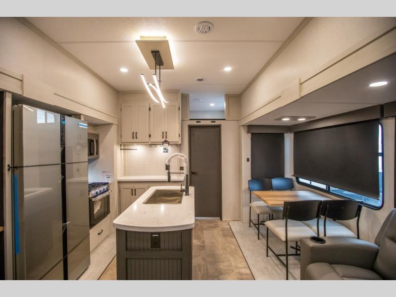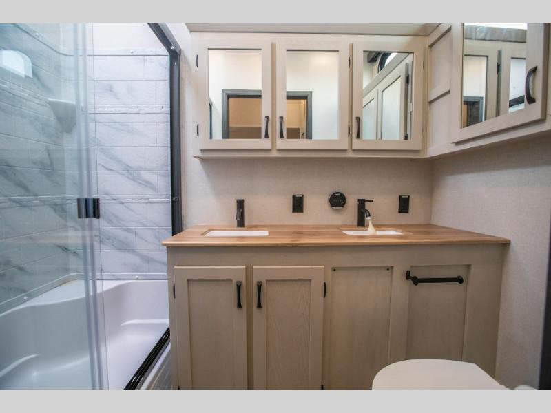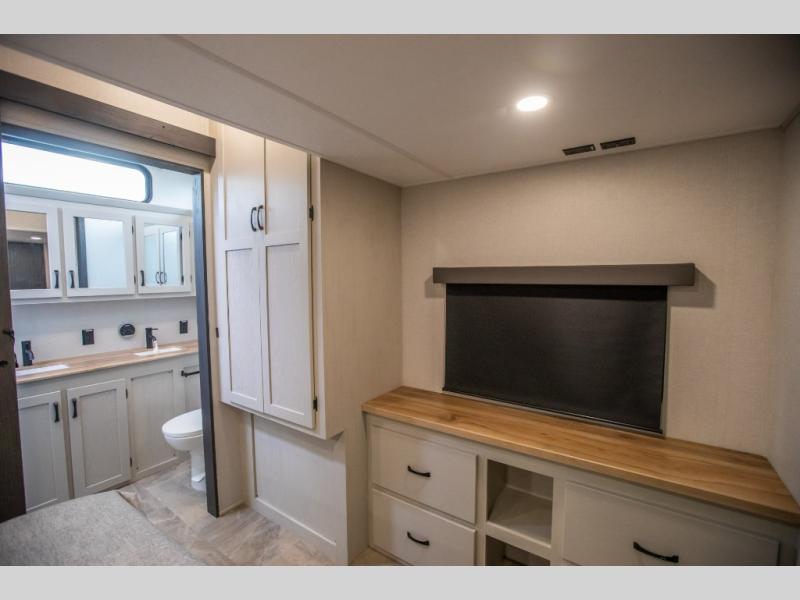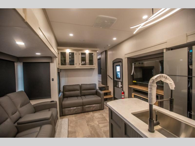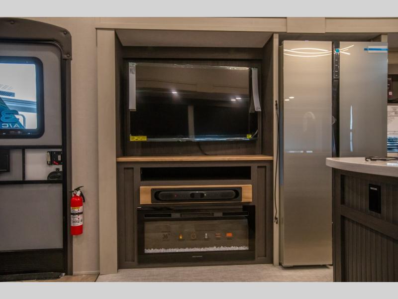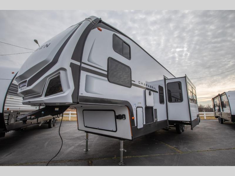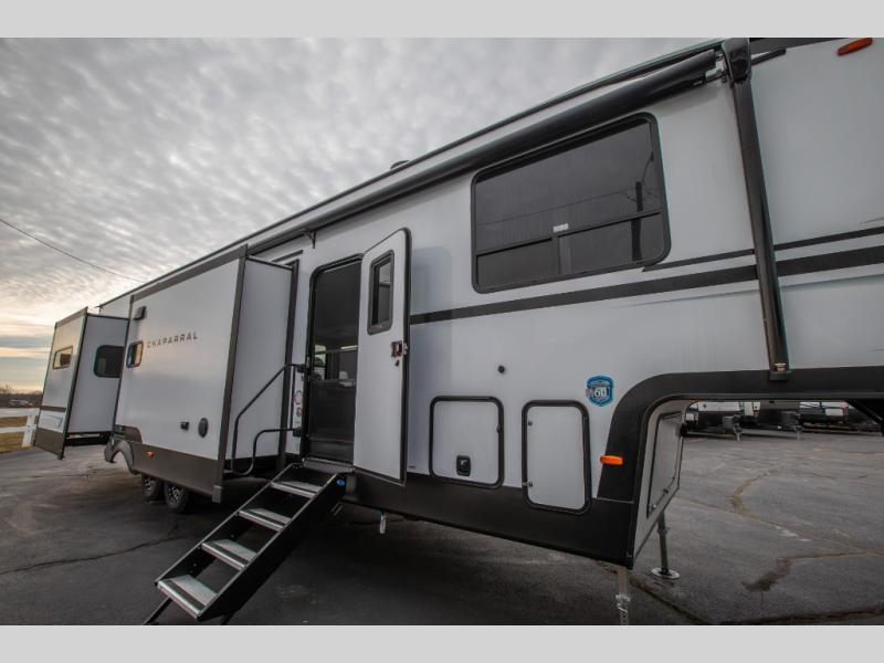 The Tri-Tex™ powder coated frame technology is up to 5X more weather resistant, and the Equa-Flex® suspension with 1/2" thick anodized shackles, bronze bushings, and greasable Zerk® fittings will make towing easier than ever. There is also a Solar Source +™ package with an upgraded 200W roof-mounted solar panel, along with an upgraded lithium-ready converter and 30AMP charge controller by Rich Solar® to support off-grid capability. To top it off, the 6X™ Double Azdel® aluminum cage sidewall system helps deliver a strong, vacuum-bonded build, while the upgraded Carbon & Walnut entertainment center with JBL® soundbar adds a premium touch. Now that's what I call luxury! Choose a Chaparral fifth wheel today!