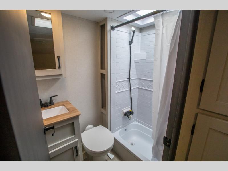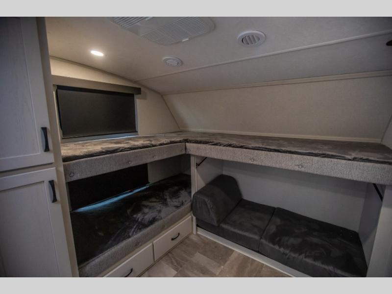 A front bunkhouse model with a private full bath, how nice! The children will love bringing along their friends with this spacious Chaparral fifth wheel. It even has a loft for added space or storage. The front bunk room features a cube sofa with a 30" x 62" bunk overhead, and 30" x 74" bunks off to the side. The full bath is located within the bunkhouse space and features a tub/shower, toilet and sink. There is also wardrobe space for clothing. Down on the main level, the combined kitchen and living area features one large slide including a theater seat and free spanning table for four. A nice center island features a sink so you can visit while prepping dinner or doing the dishes. There is also a tri-fold sofa in this space for seating and added sleeping. The rear features a master bedroom and second full bath including a king bed slide out! The full rear bath includes a vanity with two sinks, a toilet and a large shower with seat. The loft is above the rear master bedroom area and could sleep one more, or be used for added storage!