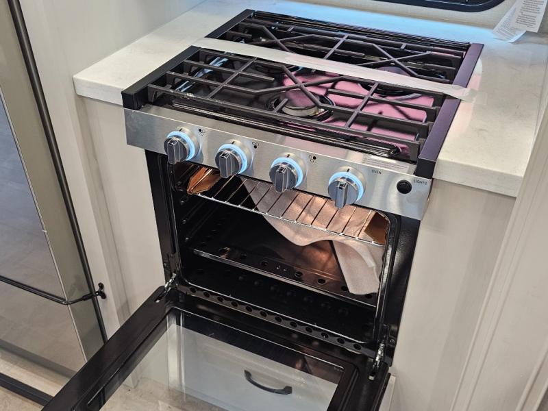 GE Profile stainless steel 21" oven with residential cooktop and microwave
