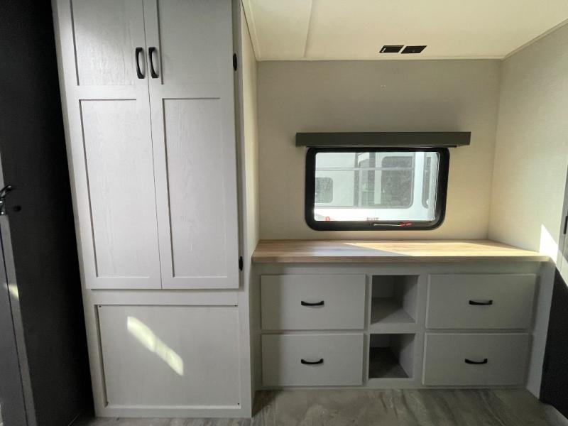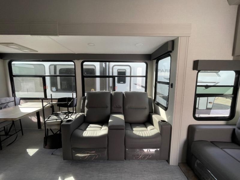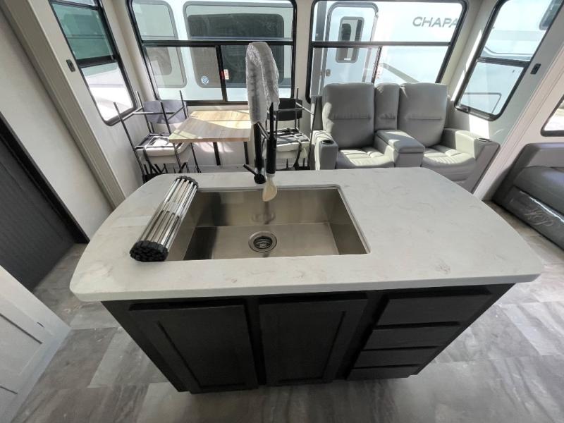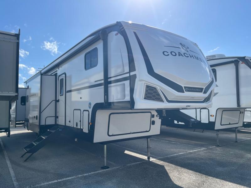 Each Chaparral mid-profile fifth wheel by Coachmen is designed with residential features, loads of storage space, and roomy bedroom suites to make you feel right at home. The durable construction means you can enjoy your RV for years to come. There's 6X double Azdel aluminum cage sidewall system, Weather Shield+ technology, and Tri-Tex powder coated frame technology that will help extend your camping season. Each model includes a Winegard Air 360+ HDTV/radio dome antenna to help keep you connected as you camp, slow rise blackout roller night shades, a new 16 cu. ft. side-by-side stainless glass 12V refrigerator, and a modern electric fireplace to make your space cozy. There is also a large transom window in the kitchen, a modern high-rise faucet, LED motion sensor lights in the bathroom, plus a full-size shower with glass doors and a seat. Now that's what I call luxury! Choose a Chaparral fifth wheel today!