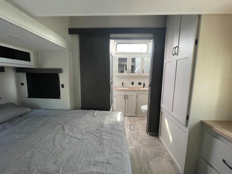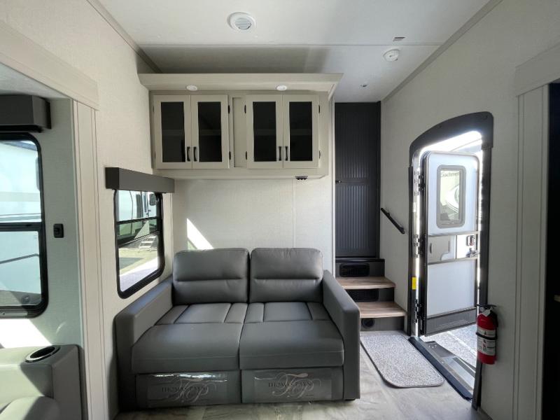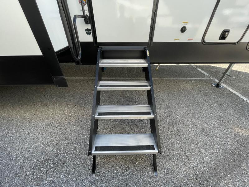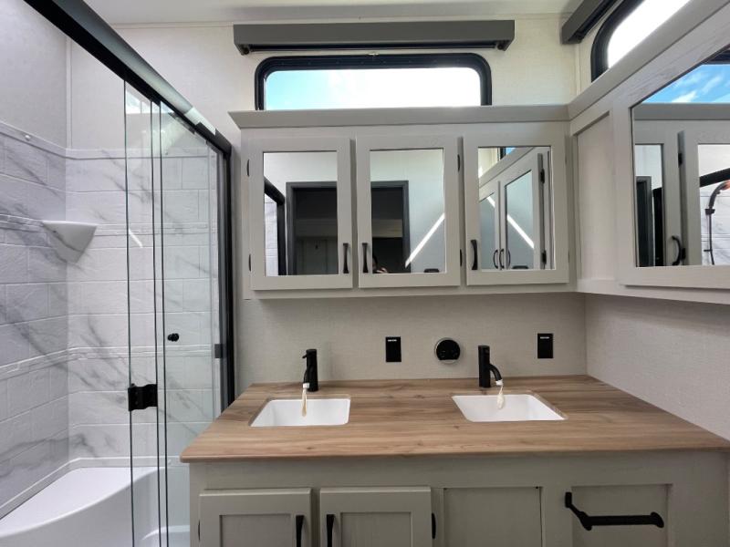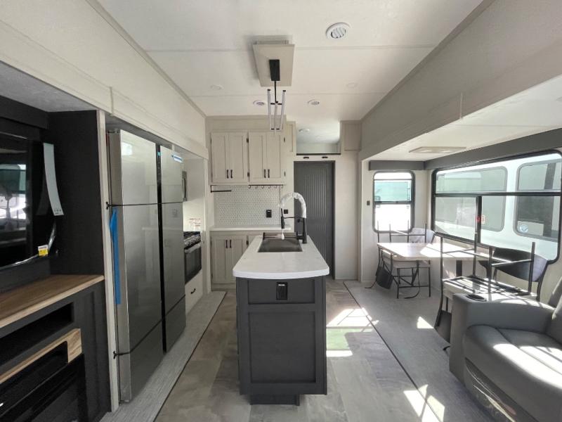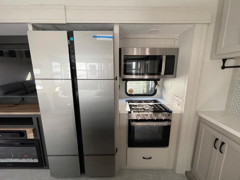 One look at this fifth wheel and you'll be sold! There are an impressive two master suites; one up front with a queen bed and full bath, and one towards the back with a king bed slide and second full bath! There are even dual bath sinks in the rear bath for added convenience! The middle living area includes dual opposing slides, a tri-fold sofa, plus theater seating and a free-spanning table for ample seating, dining, and sleeping space. There is also an entertainment center with a 50" 4K Smart LED TV to wash away those rainy day blues. The chef of your crew will have a GE Profile 21" stainless steel oven with a residential cooktop and a GE Profile stainless residential microwave to cook meals each day, a kitchen island for more counter space, and a 16 cu. ft. side-by-side 12V refrigerator for food storage.