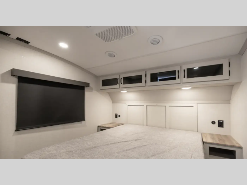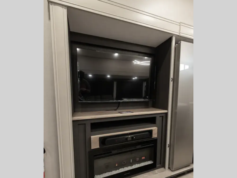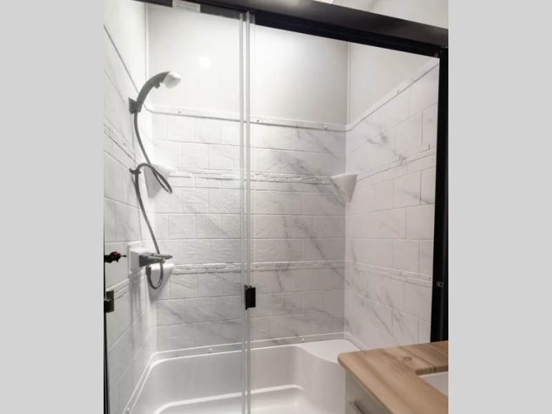 Enjoy slow-rise blackout shades, LED motion-sensor lighting, full-size shower with glass doors and seat, modern fireplace, and generous storage throughout.