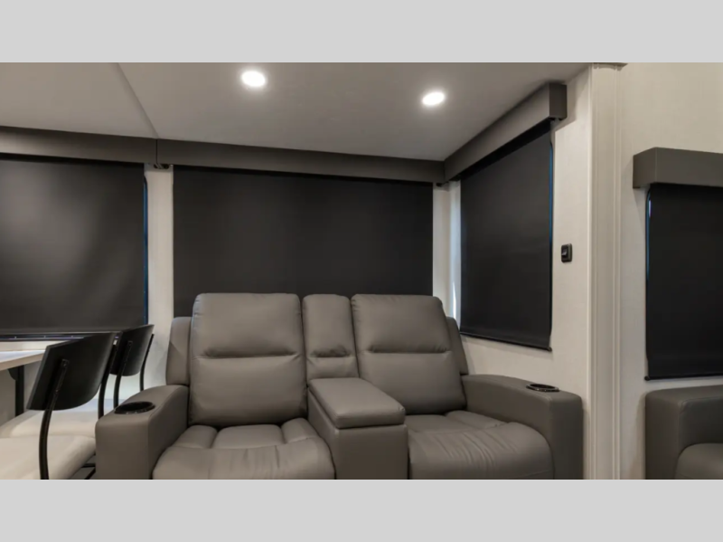Dual opposing slides create an open living area complete with a tri-fold sofa, theater seating, and a free-standing dinette table. Perfect for relaxing or entertaining.