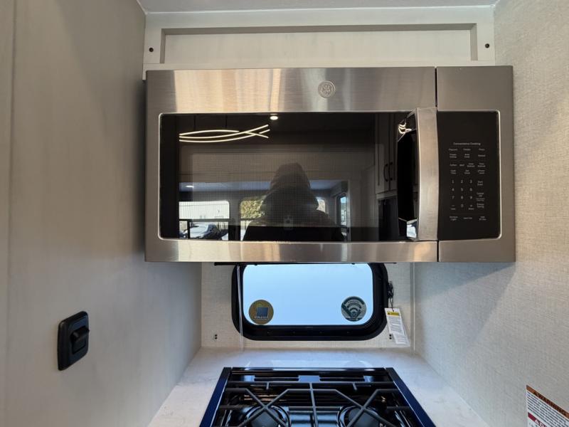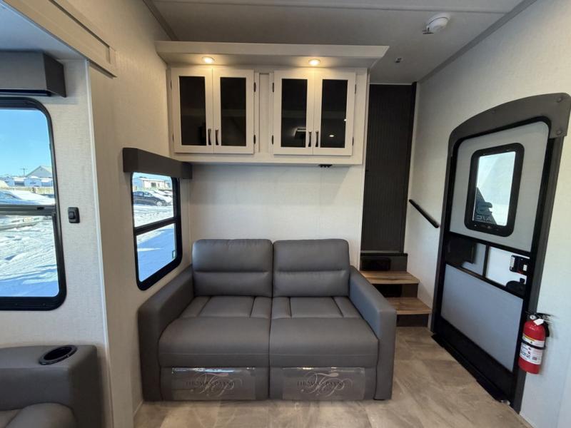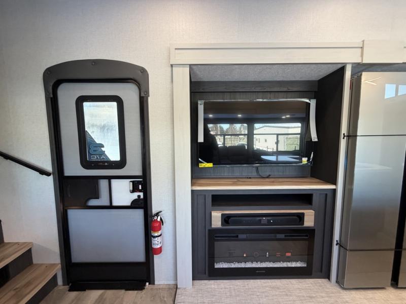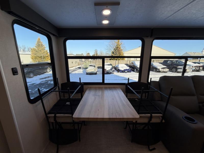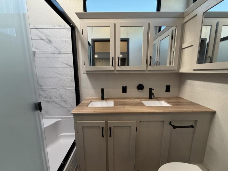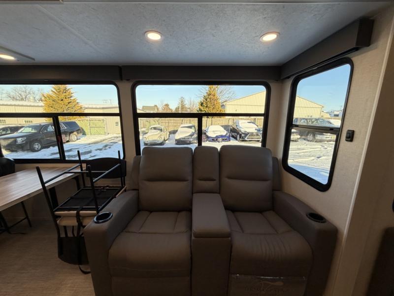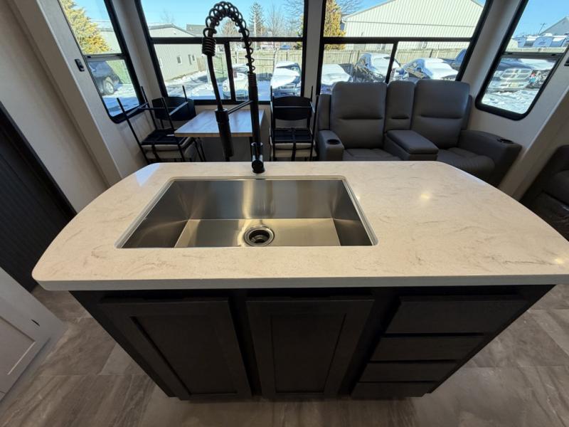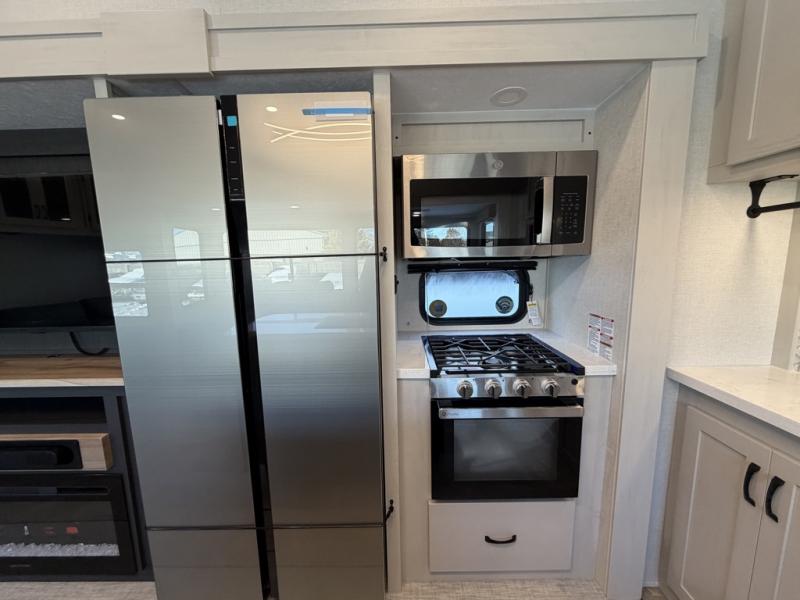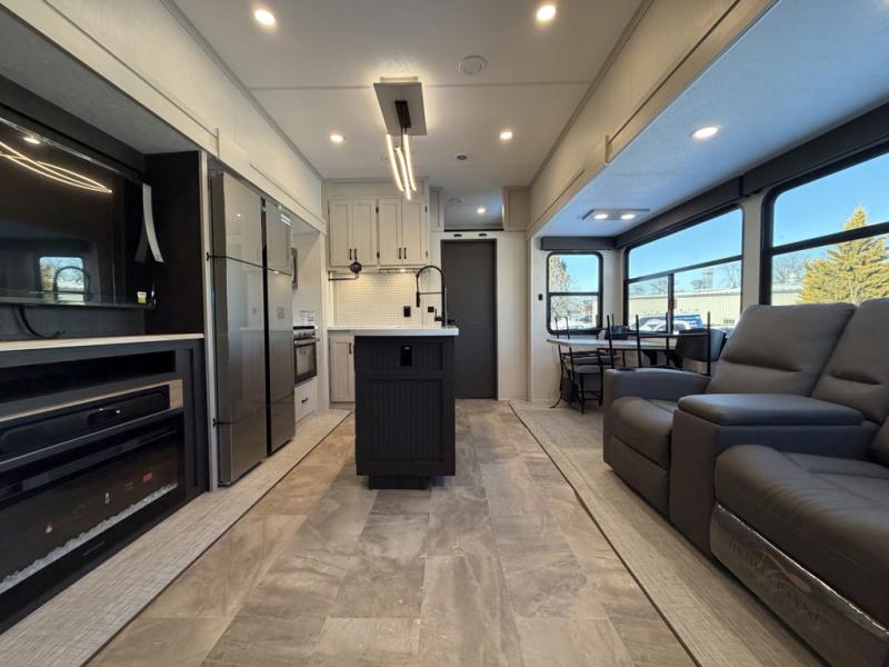 One look at this fifth wheel and you'll be sold! There are an impressive two master suites; one up front with a queen bed and full bath, and one towards the back with a king bed slide and second full bath! There are even dual bath sinks in the rear bath for added convenience! The middle living area includes dual opposing slides, a tri-fold sofa, plus theater seating and a free-spanning table for ample seating, dining, and sleeping space. There is also an entertainment center with a 50" 4K Smart LED TV to wash away those rainy day blues. The chef of your crew will have a GE Profile 21" stainless steel oven with a residential cooktop and a GE Profile stainless residential microwave to cook meals each day, a kitchen island for more counter space, and a 16 cu. ft. side-by-side 12V refrigerator for food storage.