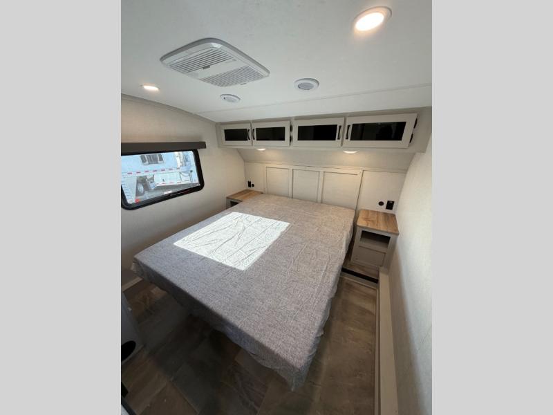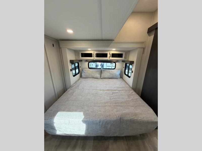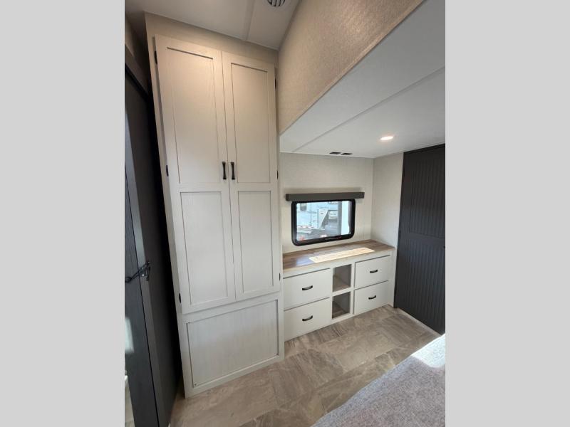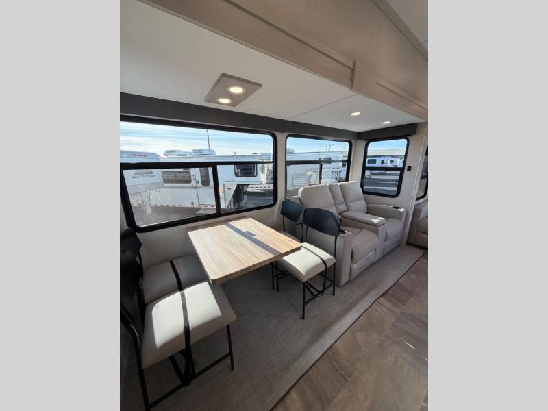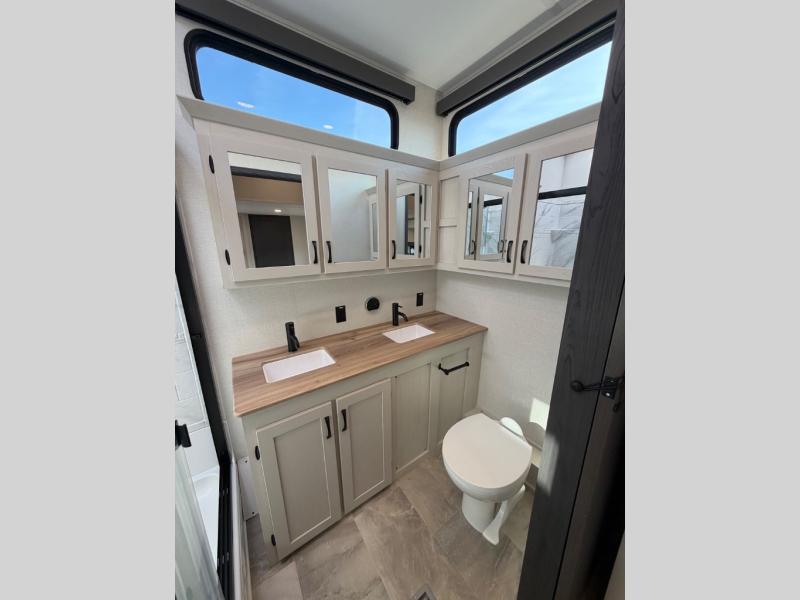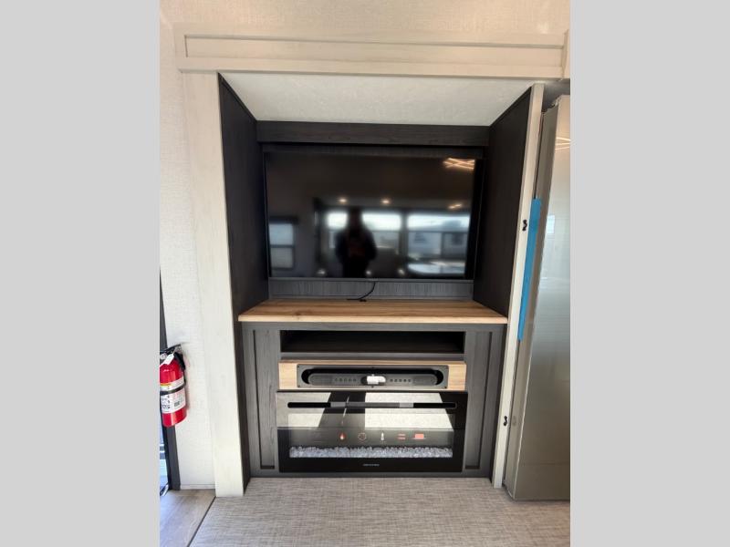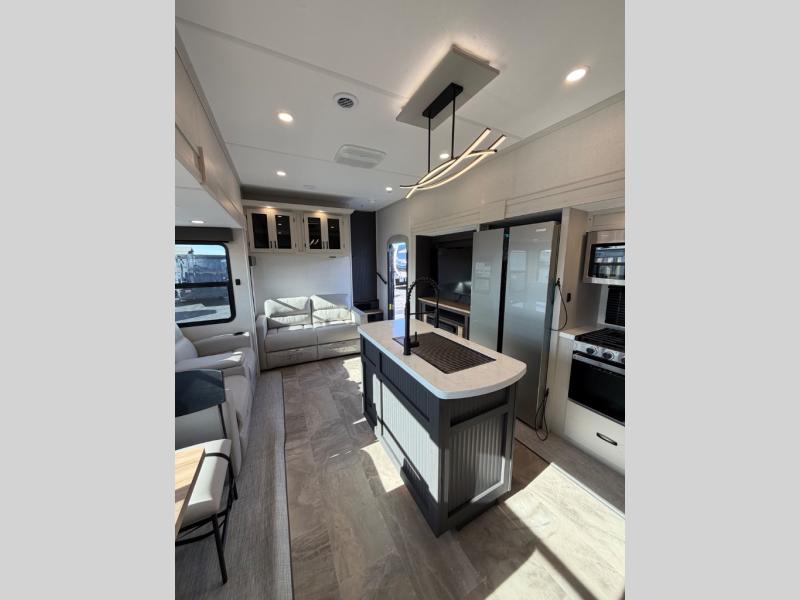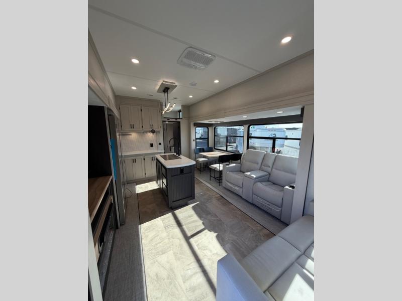 One look at this fifth wheel and you'll be sold! There are an impressive two master suites; one up front with a queen bed and full bath, and one towards the back with a king bed slide and second full bath! There are even dual bath sinks in the rear bath for added convenience! The middle living area includes dual opposing slides, a tri-fold sofa, plus theater seating and a free-spanning table for ample seating, dining, and sleeping space. There is also an entertainment center with a 50" 4K Smart LED TV to wash away those rainy day blues. The chef of your crew will have a GE Profile 21" stainless steel oven with a residential cooktop and a GE Profile stainless residential microwave to cook meals each day, a kitchen island for more counter space, and a 16 cu. ft. side-by-side 12V refrigerator for food storage.