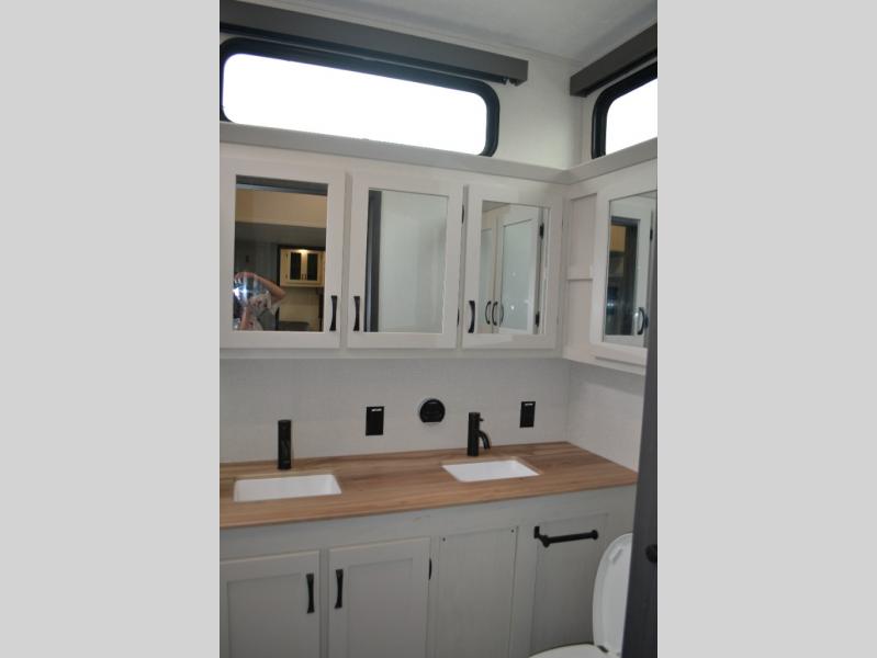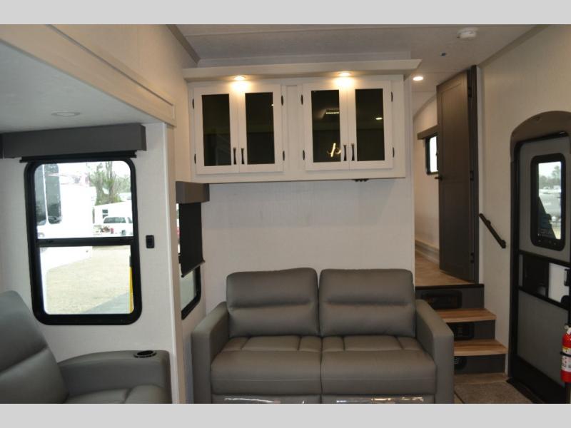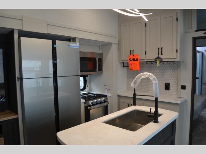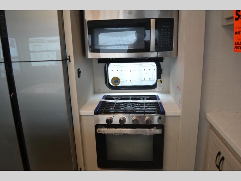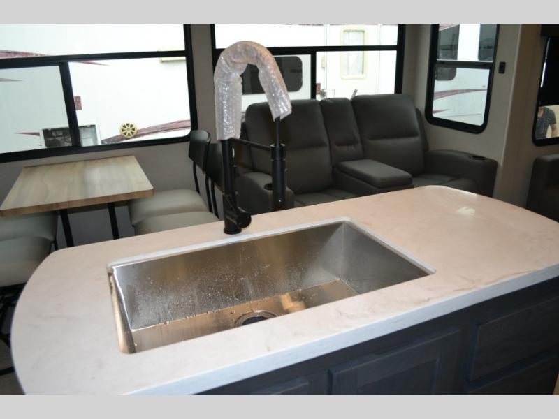 One look at this fifth wheel and you'll be sold! There are an impressive two master suites; one up front with a queen bed and full bath, and one towards the back with a king bed slide and second full bath! There are even dual bath sinks in the rear bath for added convenience! The middle living area includes dual opposing slides, a tri-fold sofa, plus theater seating and a free-spanning table for ample seating, dining, and sleeping space. There is also an entertainment center with a 50" 4K Smart LED TV to wash away those rainy day blues. The chef of your crew will have a GE Profile 21" stainless steel oven with a residential cooktop and a GE Profile stainless residential microwave to cook meals each day, a kitchen island for more counter space, and a 16 cu. ft. side-by-side 12V refrigerator for food storage.