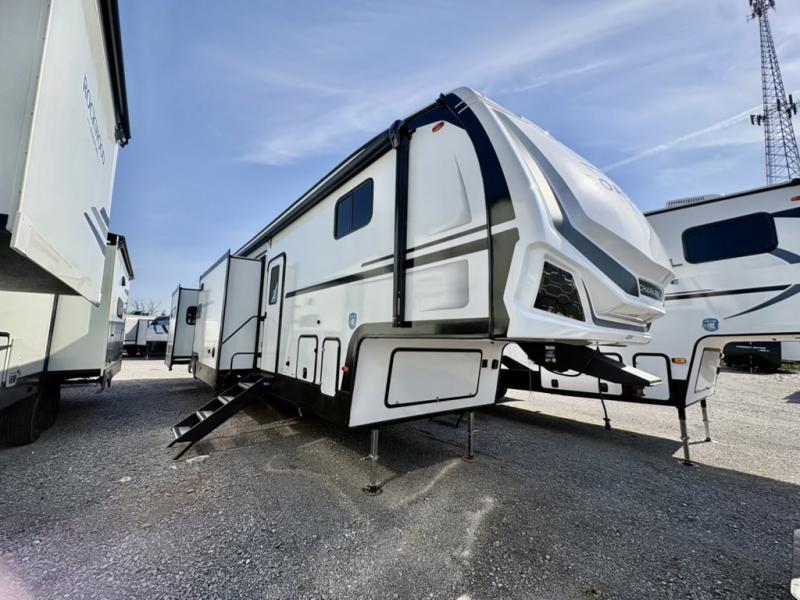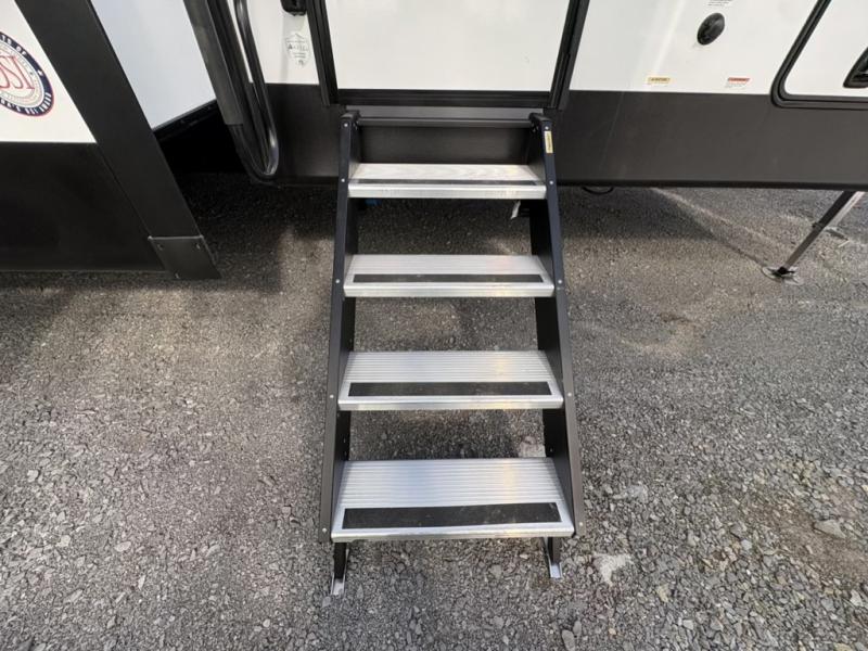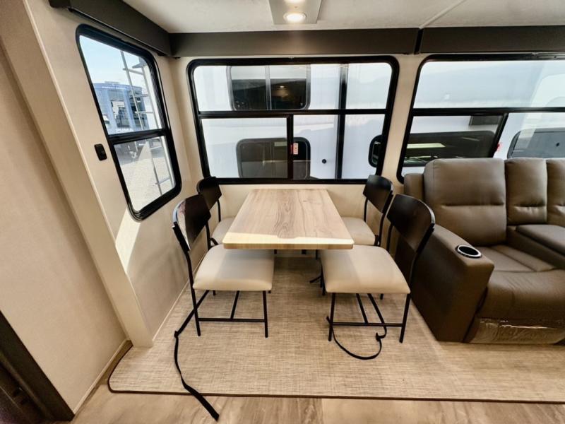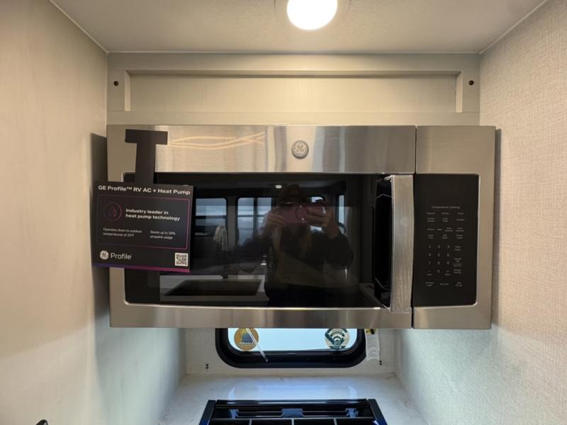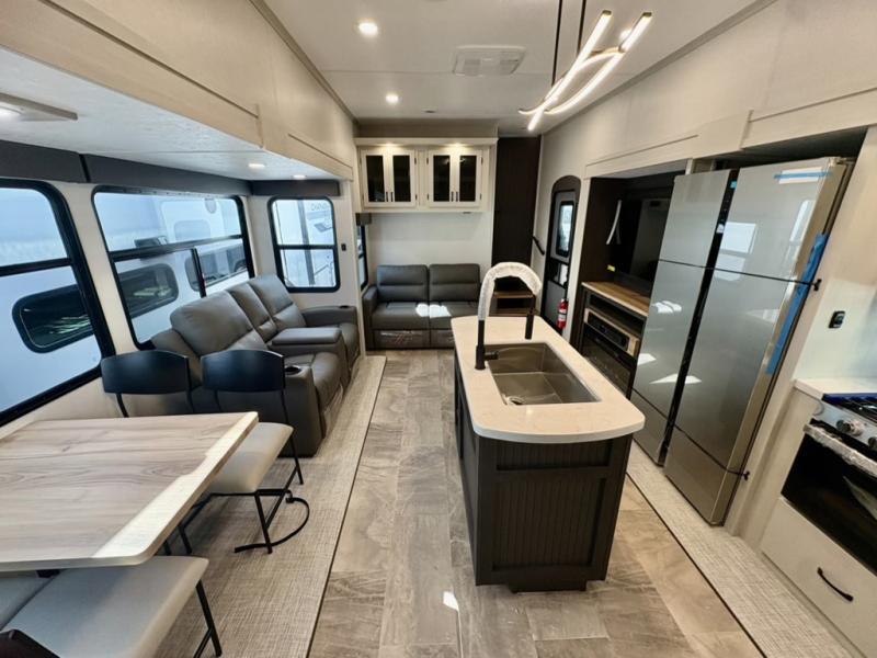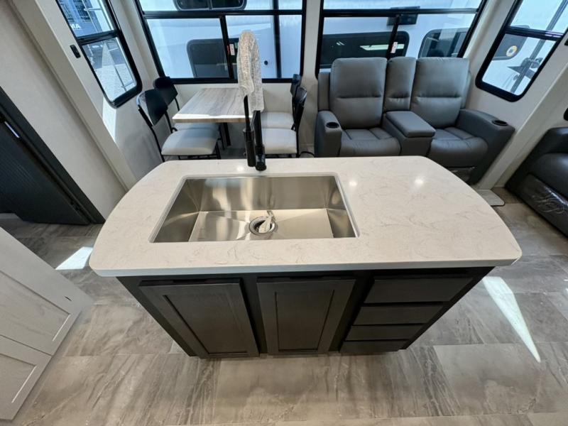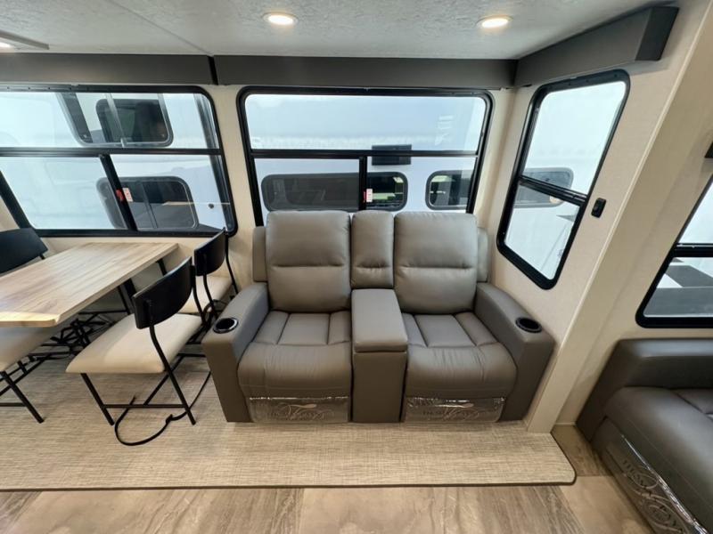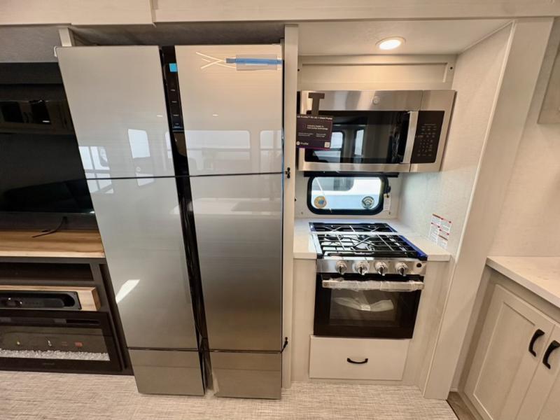 One look at this fifth wheel and you'll be sold! There are an impressive two master suites; one up front with a queen bed and full bath, and one towards the back with a king bed slide and second full bath! There are even dual bath sinks in the rear bath for added convenience! The middle living area includes dual opposing slides, a tri-fold sofa, plus theater seating and a free-spanning table for ample seating, dining, and sleeping space. There is also an entertainment center with a 50" 4K Smart LED TV to wash away those rainy day blues. The chef of your crew will have a GE Profile 21" stainless steel oven with a residential cooktop and a GE Profile stainless residential microwave to cook meals each day, a kitchen island for more counter space, and a 16 cu. ft. side-by-side 12V refrigerator for food storage.