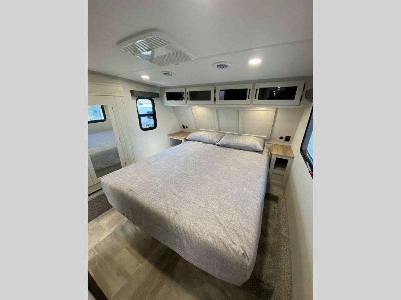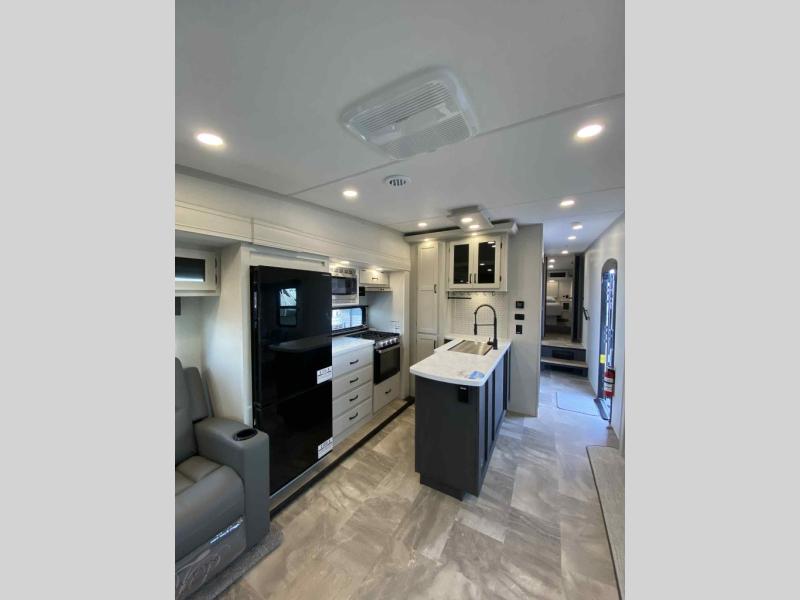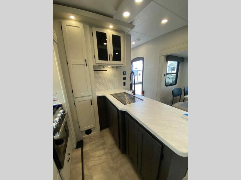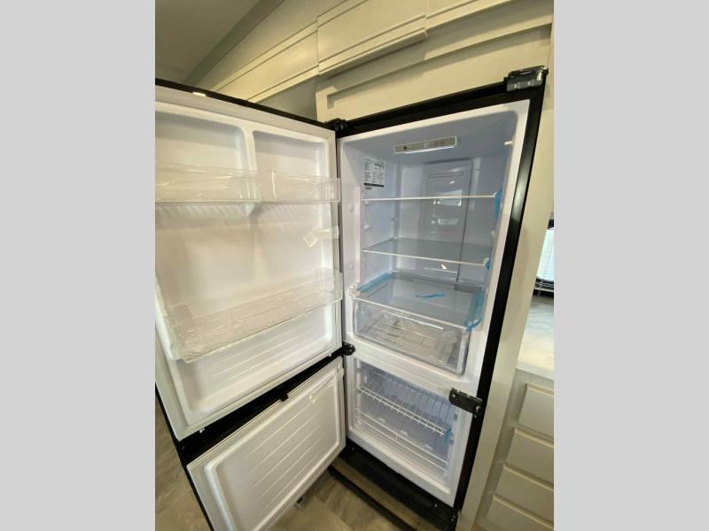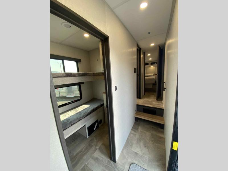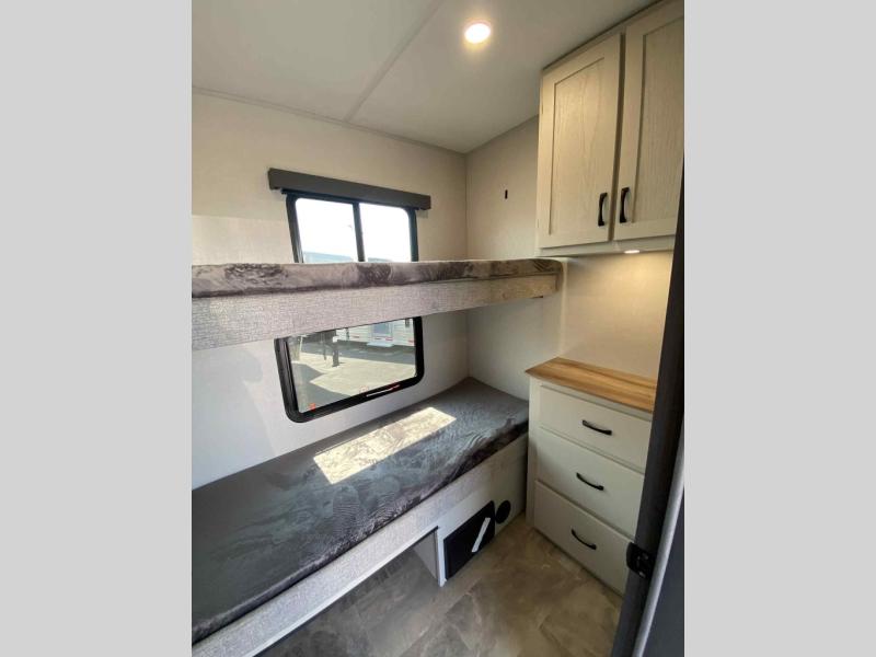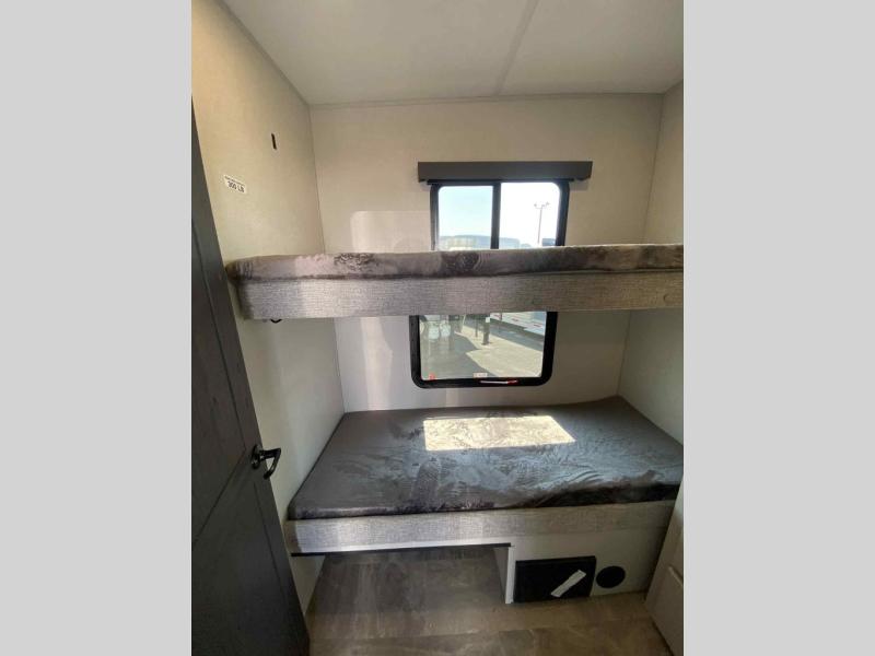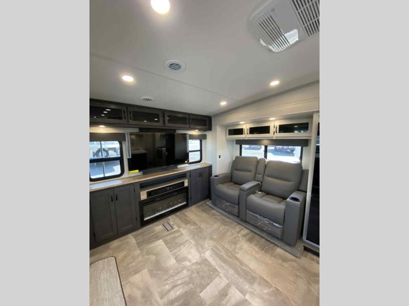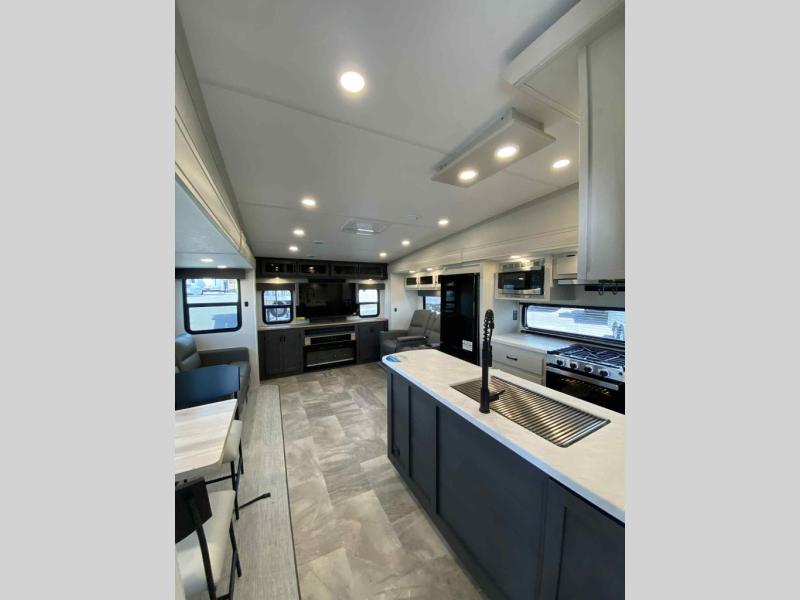 This fifth wheel is perfect for families or large groups since there is a front master bedroom and a middle bunkhouse! The front master suite not only has a queen bed to lay your head on at night and a wardrobe slide, but also an entrance into the dual entry bathroom. The middle bunkhouse has a 30" x 74" bunk bed and a flip-up bunk, shoe storage, and overhead cabinets to keep the clutter away. Grab some eggs from the 10 cu. ft. GE Stainless 12V refrigerator, fry them up on the three burner cooktop, and enjoy them at the free-spanning table. You can then read the morning newspaper on either the tri-fold hide-a-bed sofa and theater seating or watch the news with the rear entertainment center!