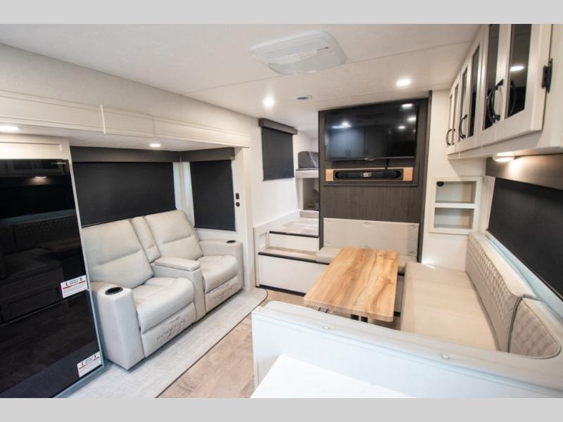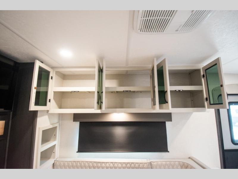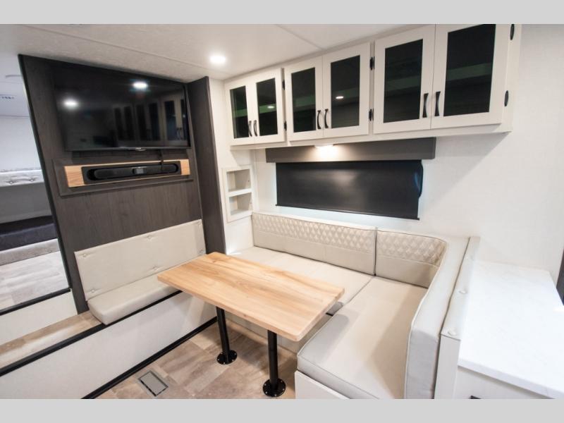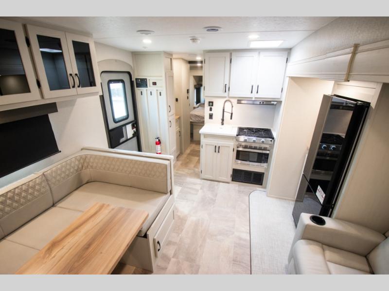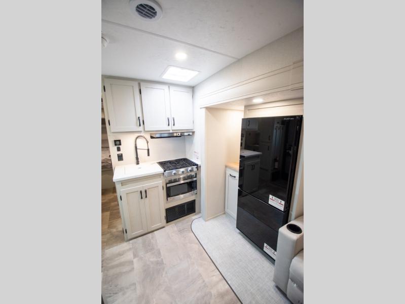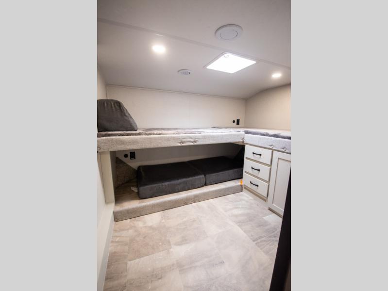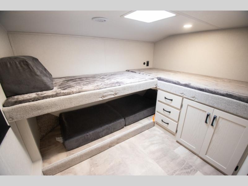 You'll love the amount of space you'll have in this fifth wheel thanks to the double slides! Once you arrive at the campground, you can start lunch in the full kitchen, then dine at the J-lounge with a table and bench seat. There is also theater seating within the living room slide for added space and comfort. Your guests can claim the front bunkhouse to themselves, which includes two bunk beds with a wardrobe below for clothes and shoes. The primary bedroom will have you feeling right at home with a rear queen bed slide out and quick access into the full bath!