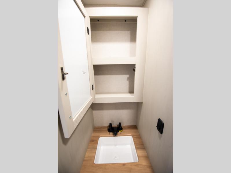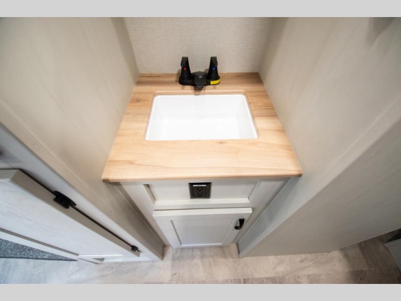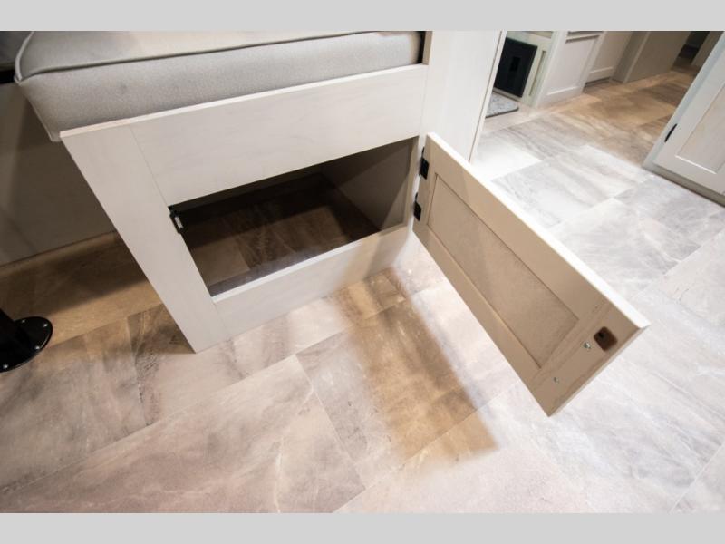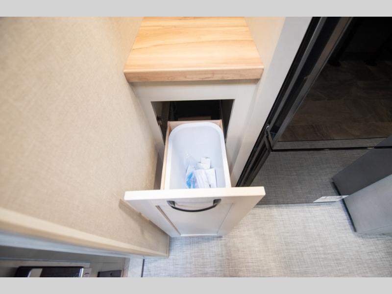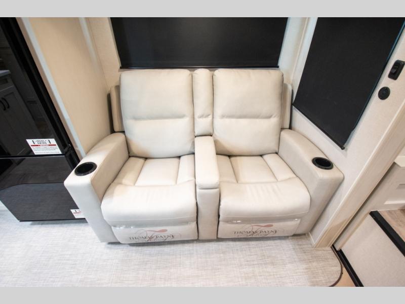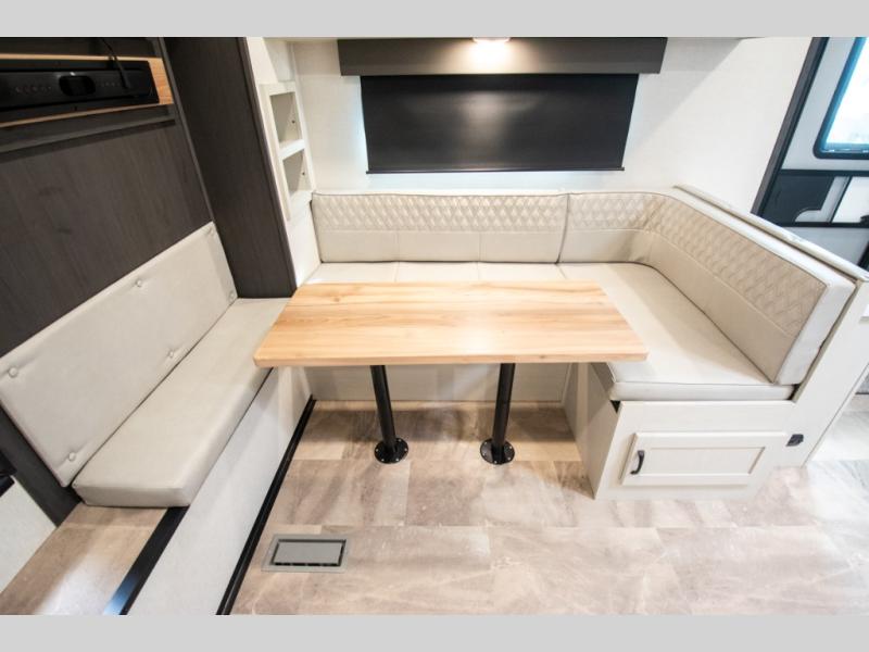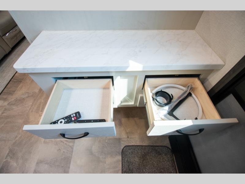 You'll love the amount of space you'll have in this fifth wheel thanks to the double slides! Once you arrive at the campground, you can start lunch in the full kitchen, then dine at the J-lounge with a table and bench seat. There is also theater seating within the living room slide for added space and comfort. Your guests can claim the front bunkhouse to themselves, which includes two bunk beds with a wardrobe below for clothes and shoes. The primary bedroom will have you feeling right at home with a rear queen bed slide out and quick access into the full bath!