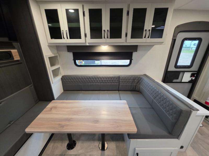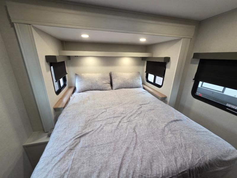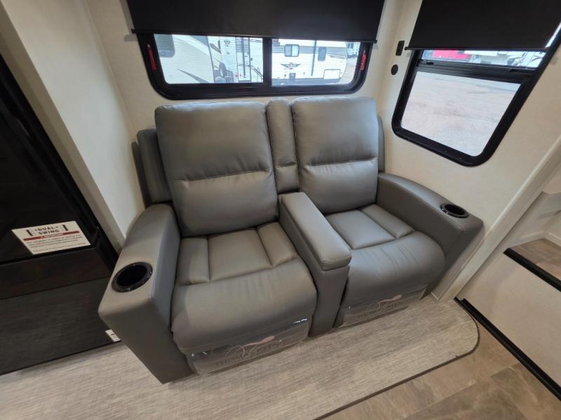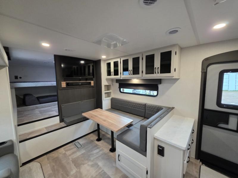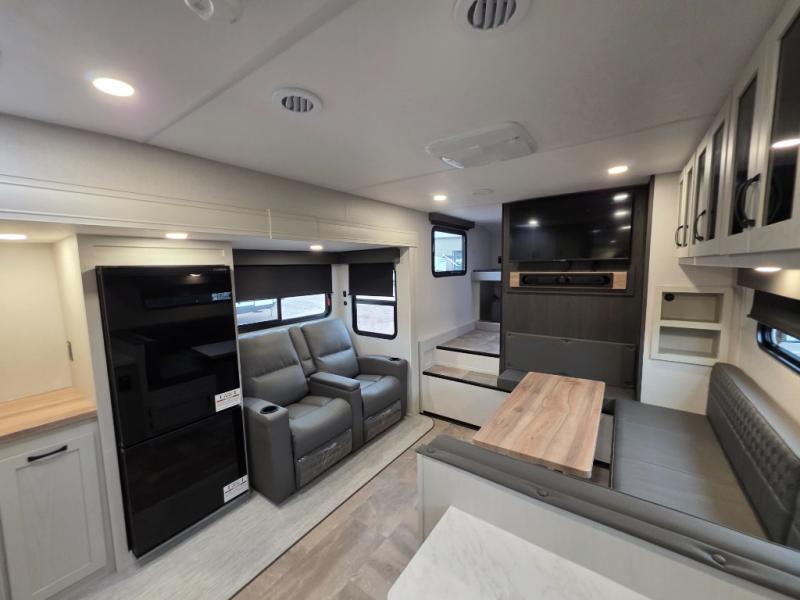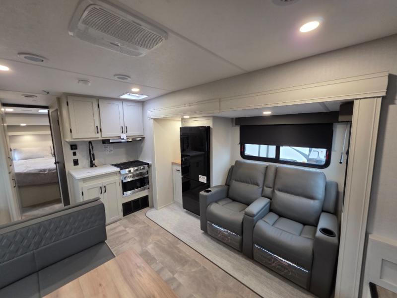 You'll love the amount of space you'll have in this fifth wheel thanks to the double slides! Once you arrive at the campground, you can start lunch in the full kitchen, then dine at the J-lounge with a table and bench seat. There is also theater seating within the living room slide for added space and comfort. Your guests can claim the front bunkhouse to themselves, which includes two bunk beds with a wardrobe below for clothes and shoes. The rear master bedroom will have you feeling right at home with a queen bed slide out and quick access into the full bath!