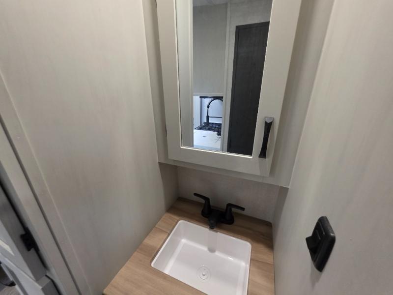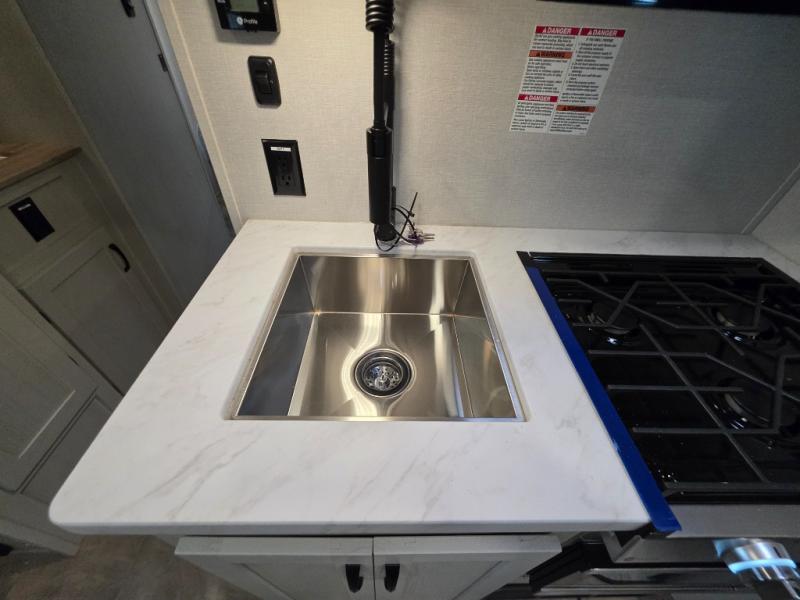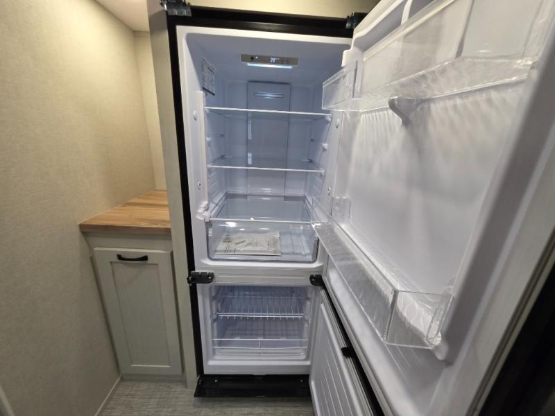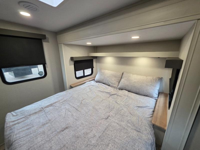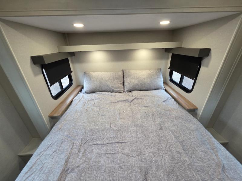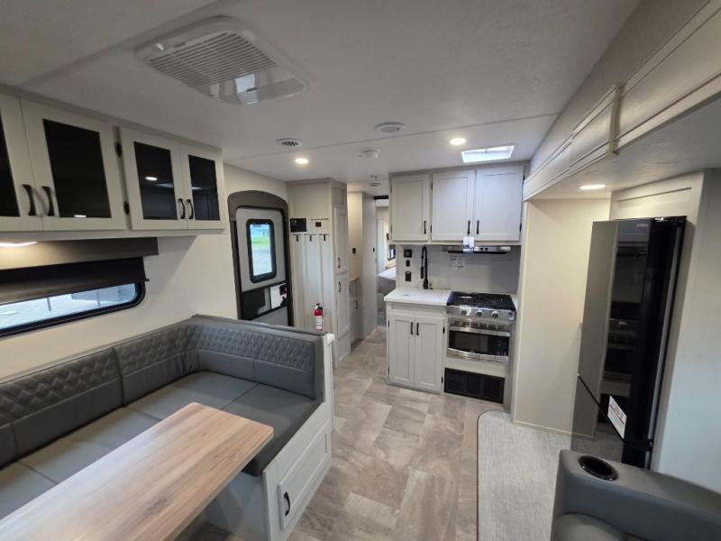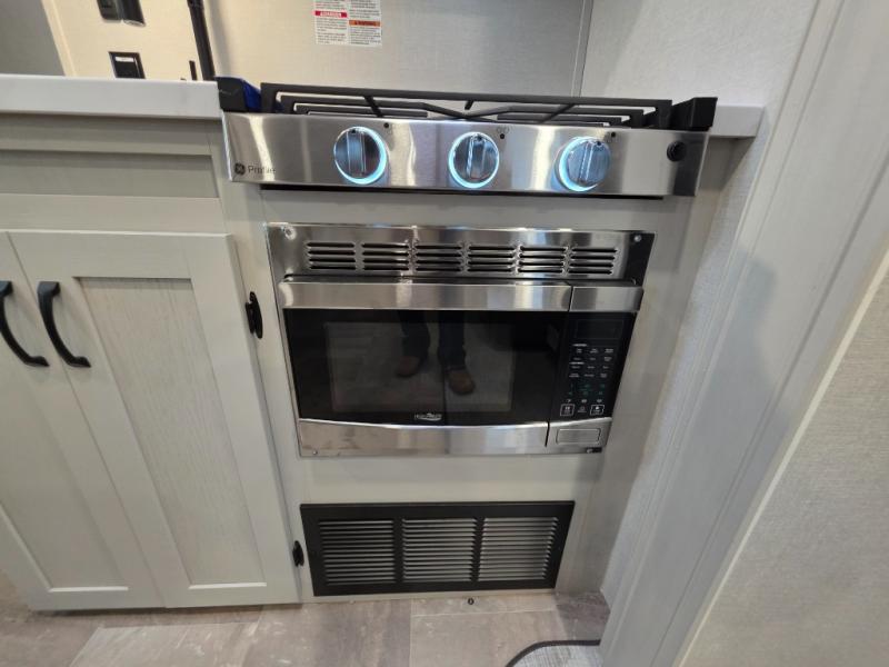You'll love the amount of space you'll have in this fifth wheel thanks to the double slides! Once you arrive at the campground, you can start lunch in the full kitchen, then dine at the J-lounge with a table and bench seat. There is also theater seating within the living room slide for added space and comfort. Your guests can claim the front bunkhouse to themselves, which includes two bunk beds with a wardrobe below for clothes and shoes. The rear master bedroom will have you feeling right at home with a queen bed slide out and quick access into the full bath!