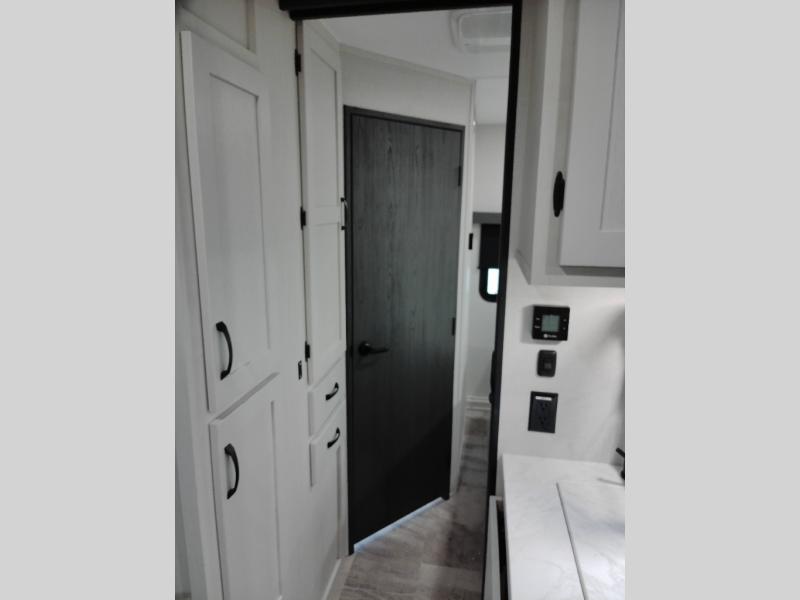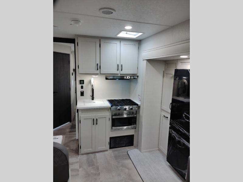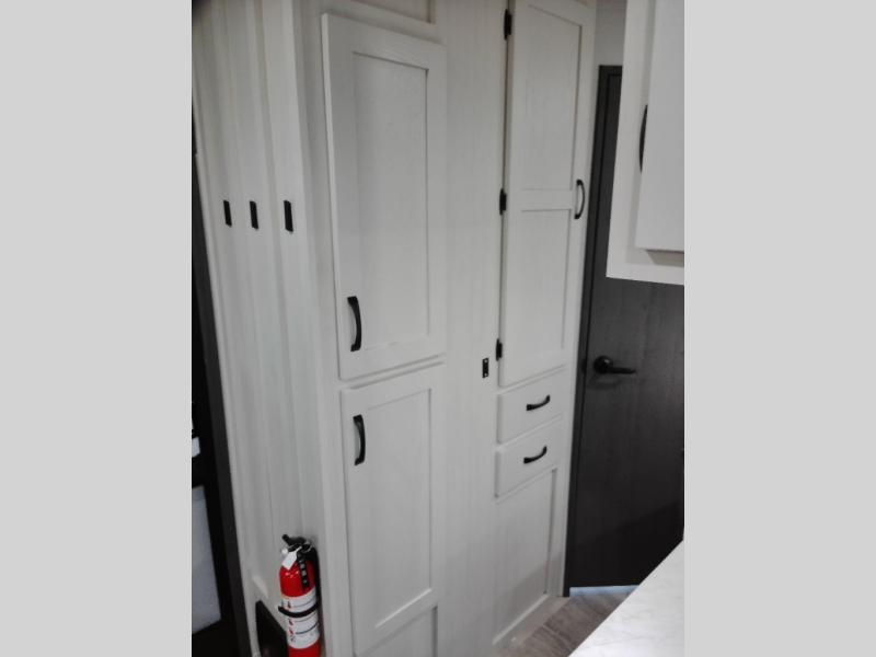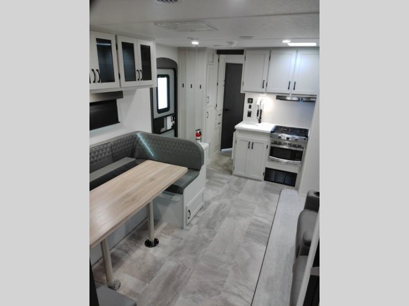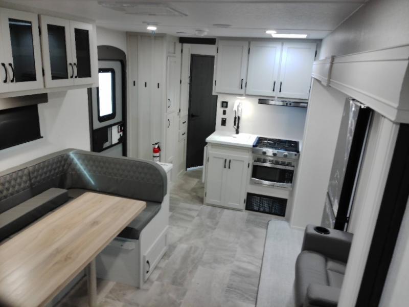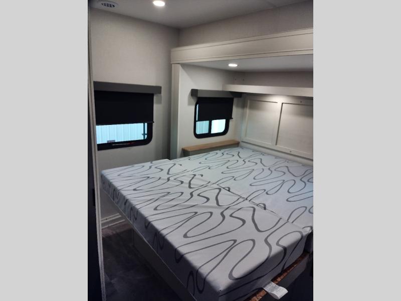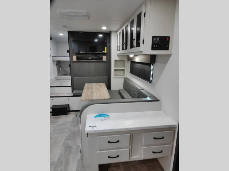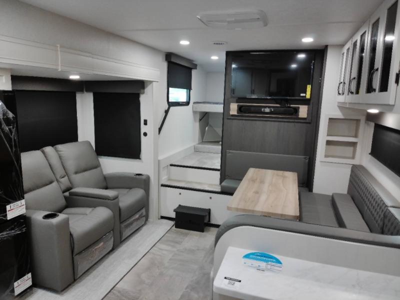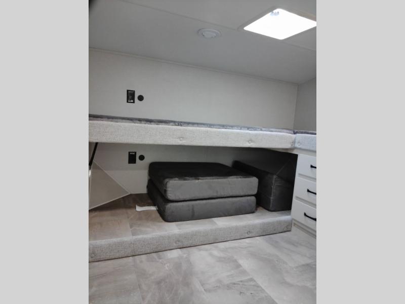 You'll love the amount of space you'll have in this fifth wheel thanks to the double slides! Once you arrive at the campground, you can start lunch in the full kitchen, then dine at the J-lounge with a table and bench seat. There is also theater seating within the living room slide for added space and comfort. Your guests can claim the front bunkhouse to themselves, which includes two bunk beds with a wardrobe below for clothes and shoes. The rear master bedroom will have you feeling right at home with a queen bed slide out and quick access into the full bath!