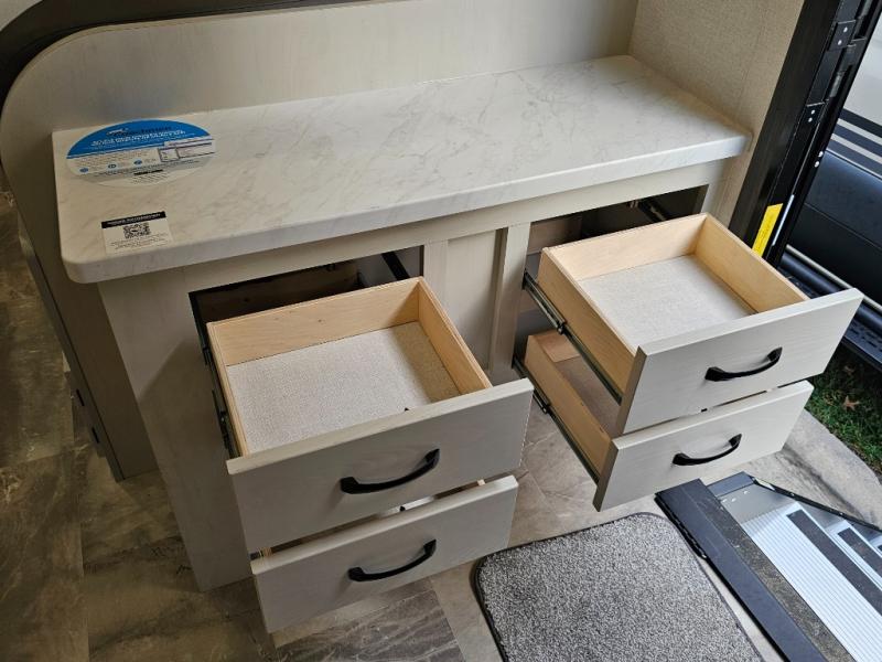 Double slide outs create an open-concept feel throughout the living and kitchen areas.