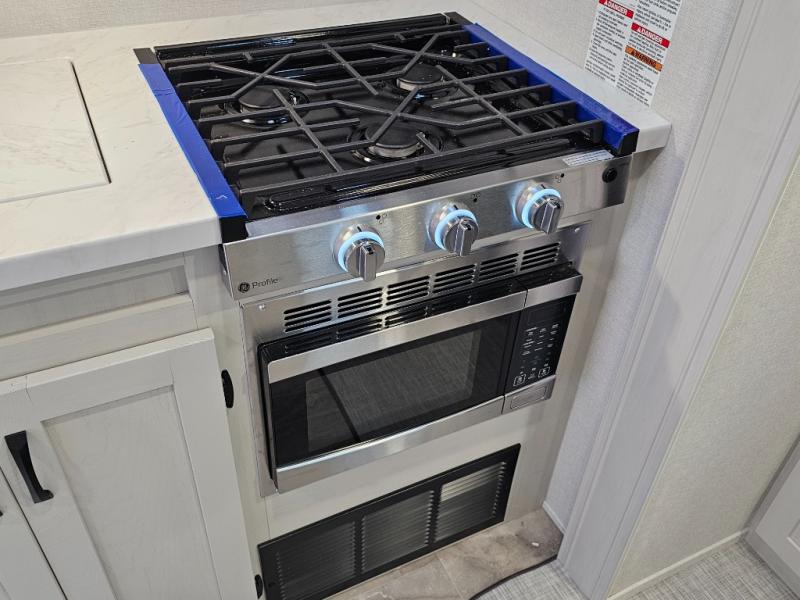 Three-burner cooktop with overhead microwave and range hood.