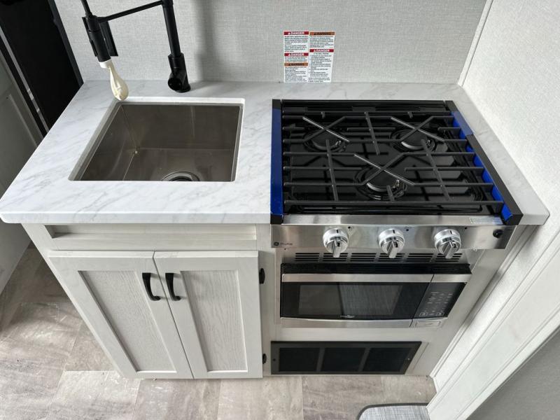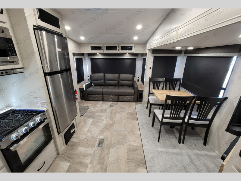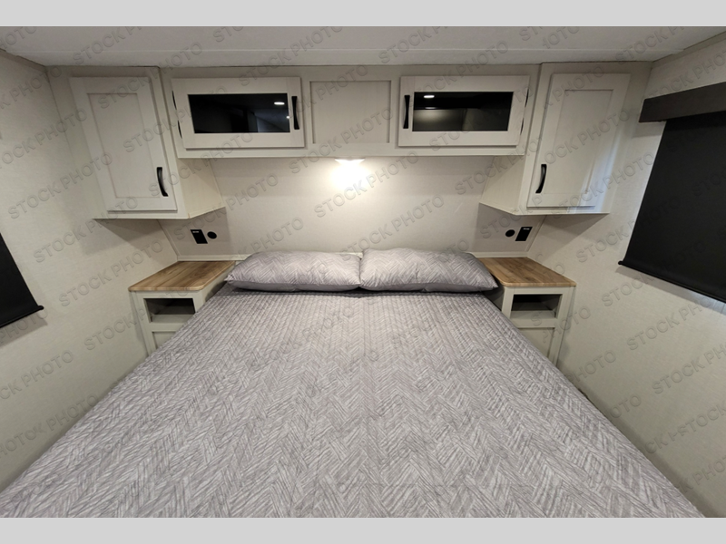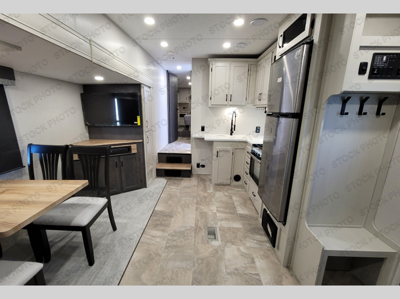 You'll love the amount of space you'll have in this fifth wheel thanks to the double slides! Once you arrive at the campground, you can start lunch in the full kitchen, then dine at the J-lounge with a table and bench seat. There is also theater seating within the living room slide for added space and comfort. Your guests can claim the front bunkhouse to themselves, which includes two bunk beds with a wardrobe below for clothes and shoes. The rear master bedroom will have you feeling right at home with a queen bed slide out and quick access into the full bath!