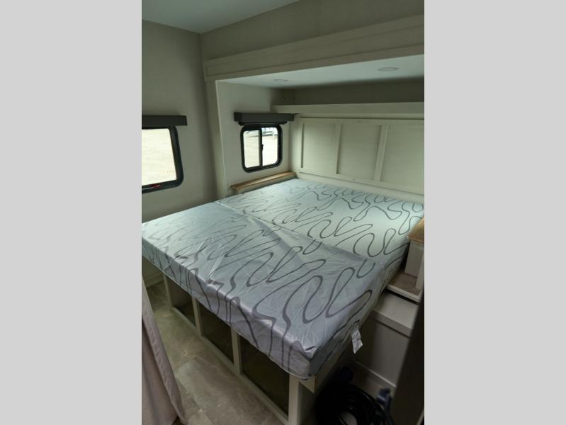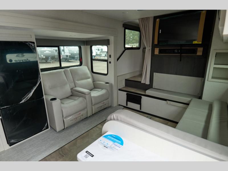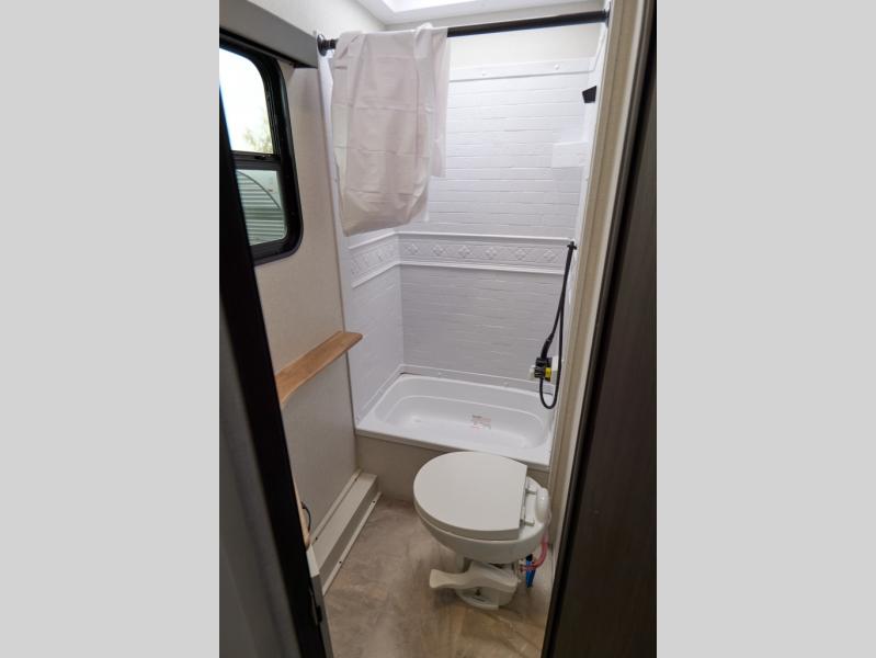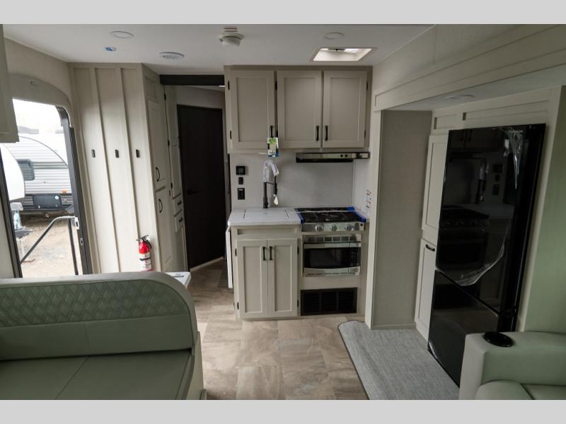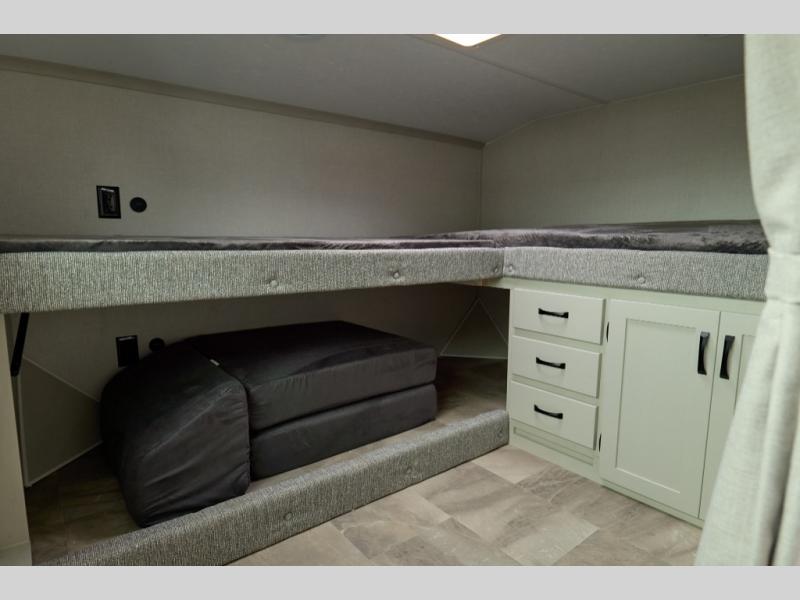 You'll love the amount of space you'll have in this fifth wheel thanks to the double slides! Once you arrive at the campground, you can start lunch in the full kitchen, then dine at the J-lounge with a table and bench seat. There is also theater seating within the living room slide for added space and comfort. Your guests can claim the front bunkhouse to themselves, which includes two bunk beds with a wardrobe below for clothes and shoes. The rear master bedroom will have you feeling right at home with a queen bed slide out and quick access into the full bath!