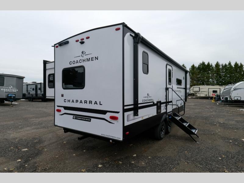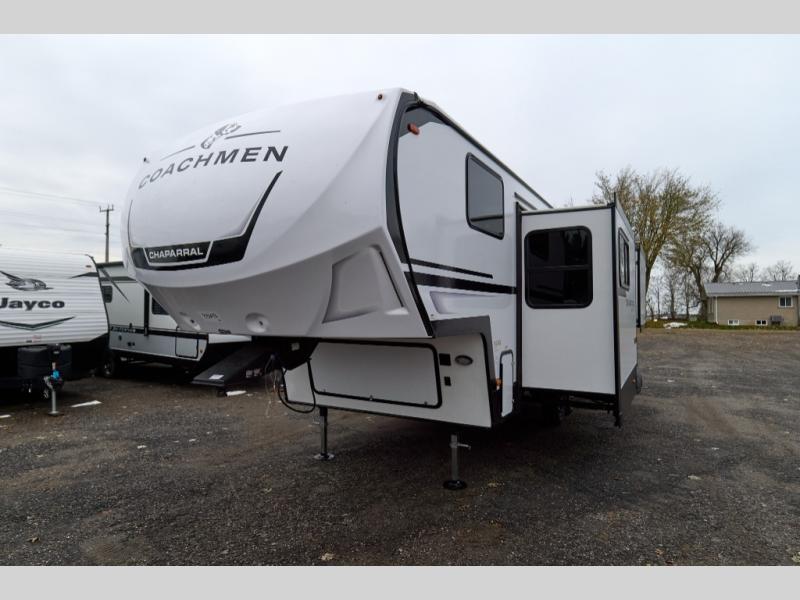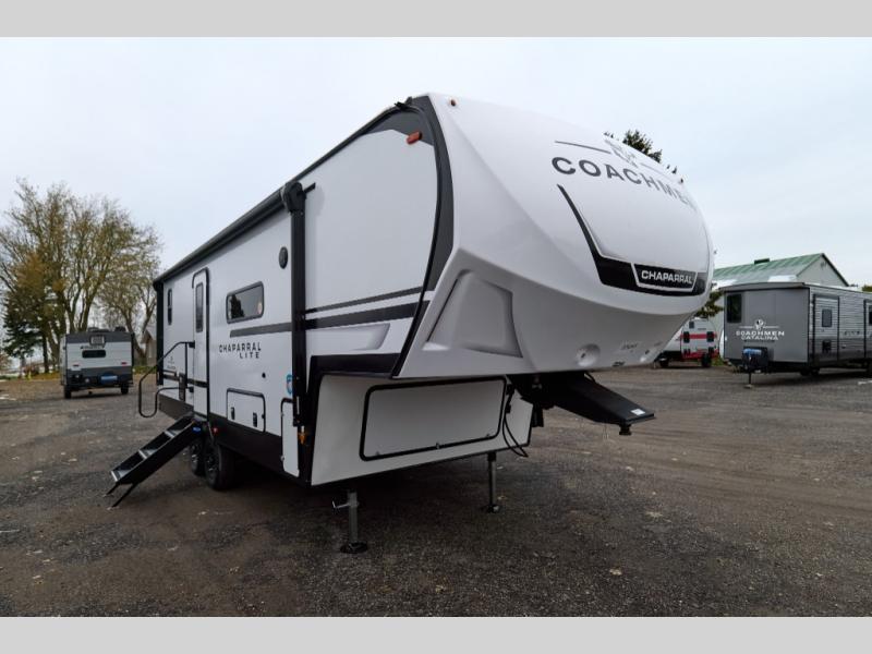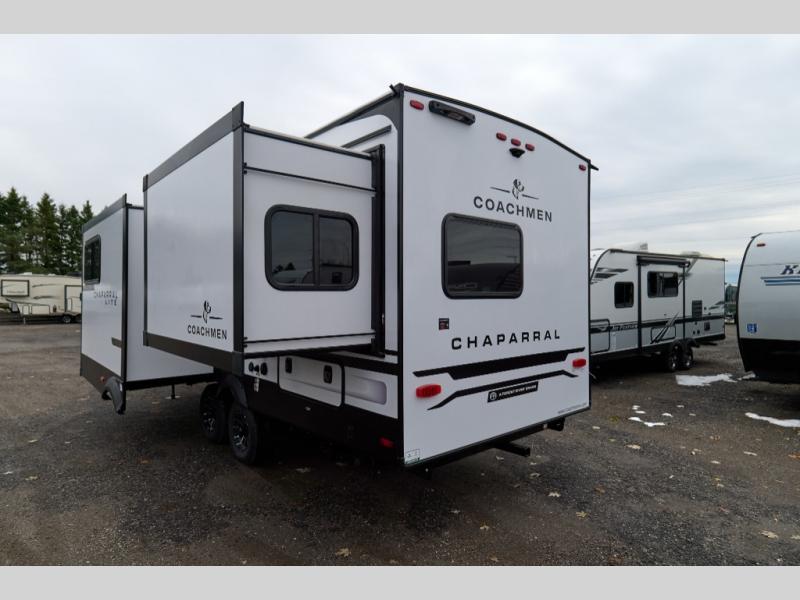 Comfort, convenience, and an easy haul is what you will find with each one of these Coachmen RV Chaparral Lite fifth wheels! Their Tri-Tex powder coated frame technology is up to 5X more weather resistant, and the dual-sided Azdel composite sidewall panels are ultra durable. The Equa-Flex suspension provides hassle-free towing, and you might want to add the exterior back-up and sideview camera prep for easy parking. You will feel right at home inside with slow rise blackout roller night shades, an upgraded Carbon and Walnut entertainment center, a modern high-rise kitchen faucet, and many more comforts! The exterior is just as inviting with its electric awning with LED lights, MORryde StepAbove entry steps, and pass-through storage for all your gear!