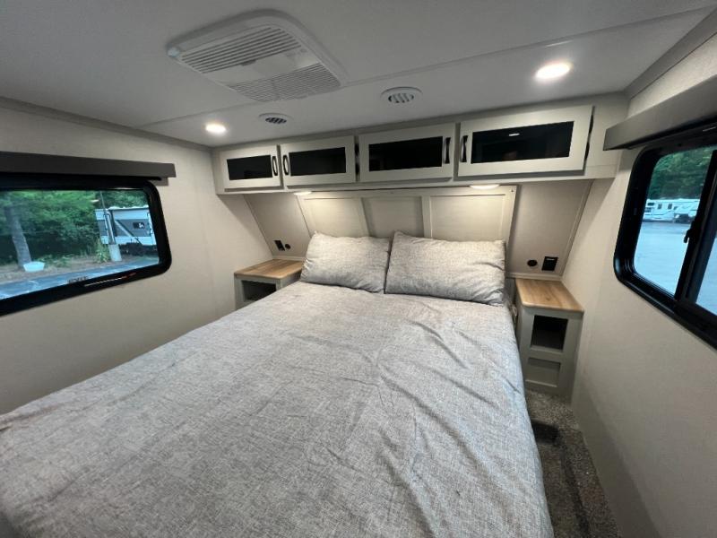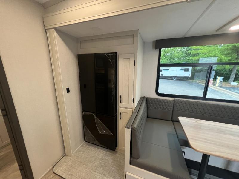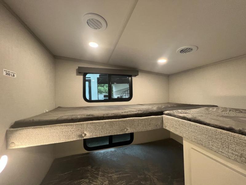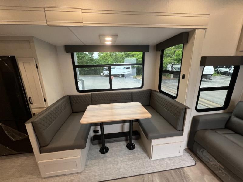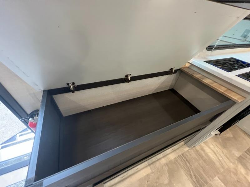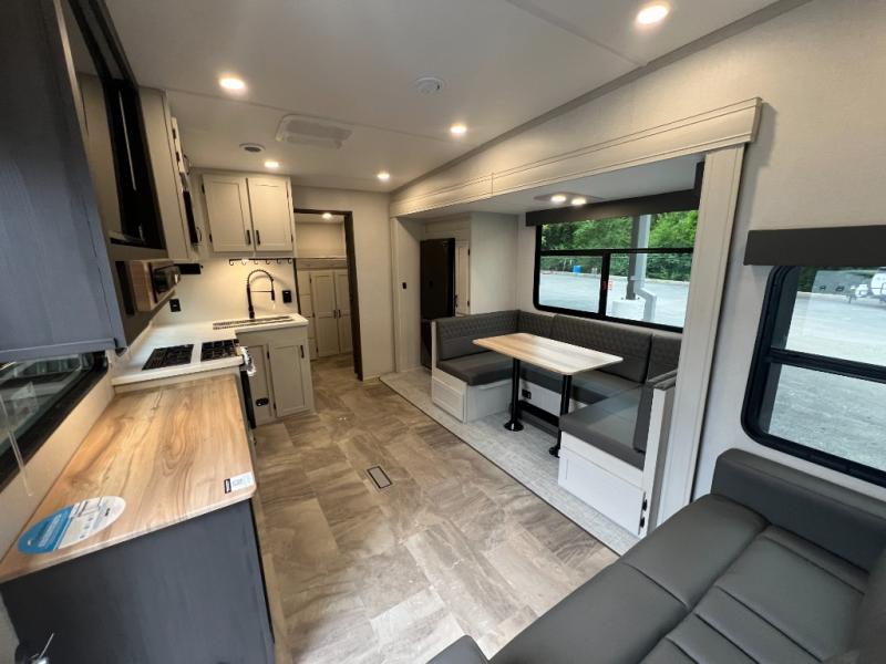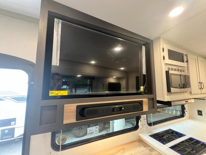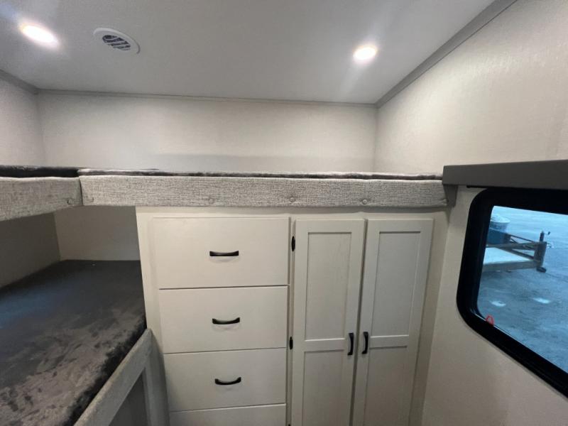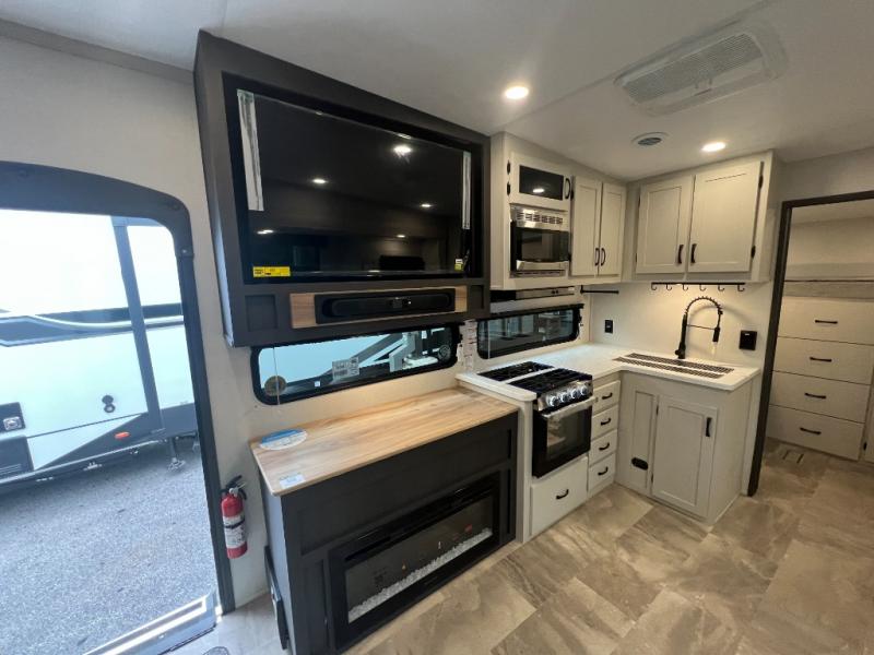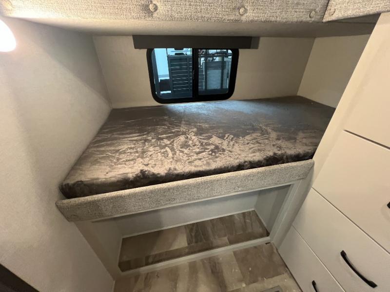 The whole family will have a fun time camping in this fifth wheel! The kiddos will love having their own rear private bunkhouse which has three bunks and a wardrobe/storage for their clothes or toys. Enjoy your own privacy with the front private bedroom including a queen bed, dual nightstands, plus roller night shades for privacy. You can even transform the tri-fold hide-a-bed sofa and U-shaped dinette into extra sleeping spaces for more guests to join in on the fun. The chef can either prepare their delicious meals indoors with the GE Profile 21" stainless steel oven with a residential cooktop or breathe in some fresh air while cooking at the outside kitchen while staying protected by the 16' electric awning!
