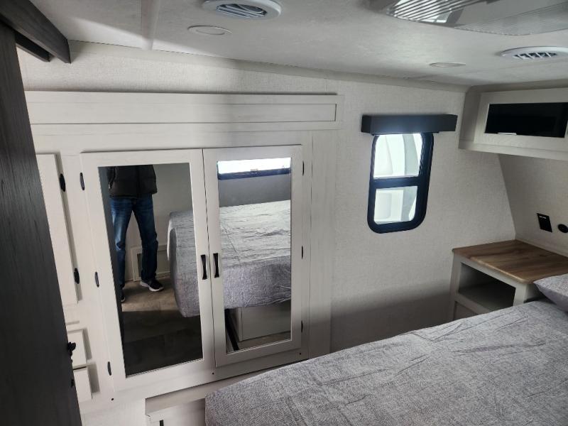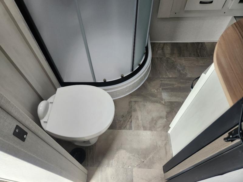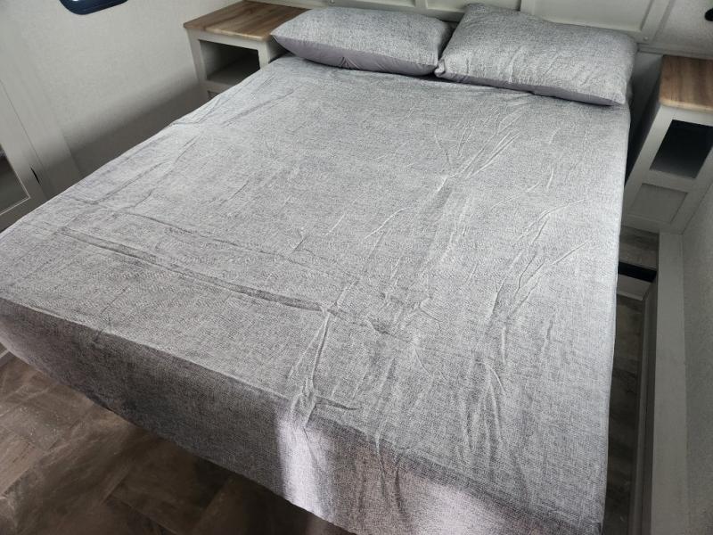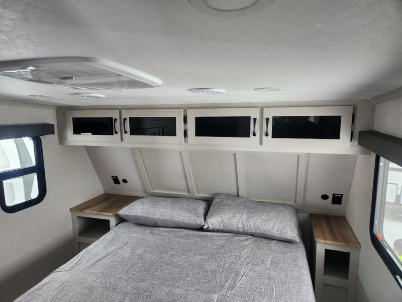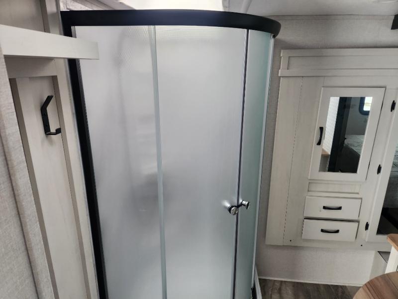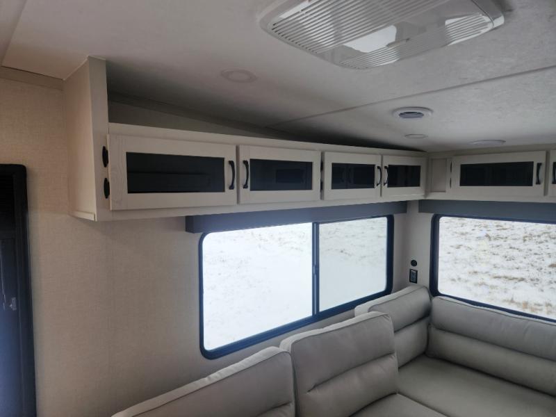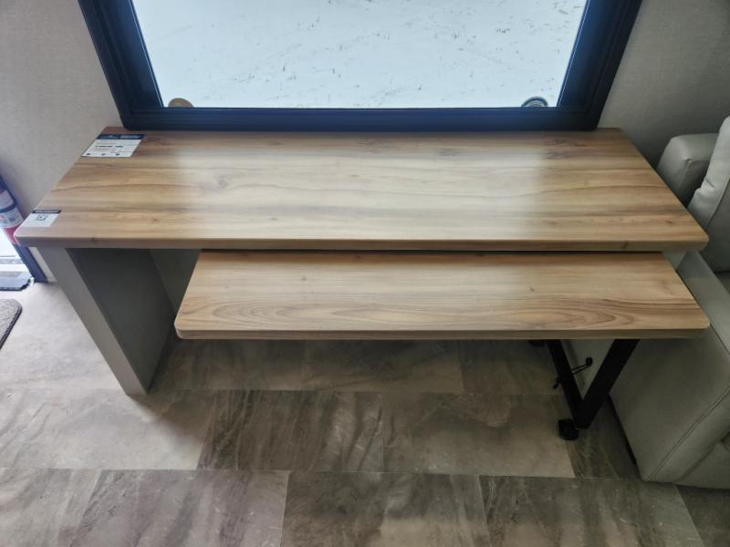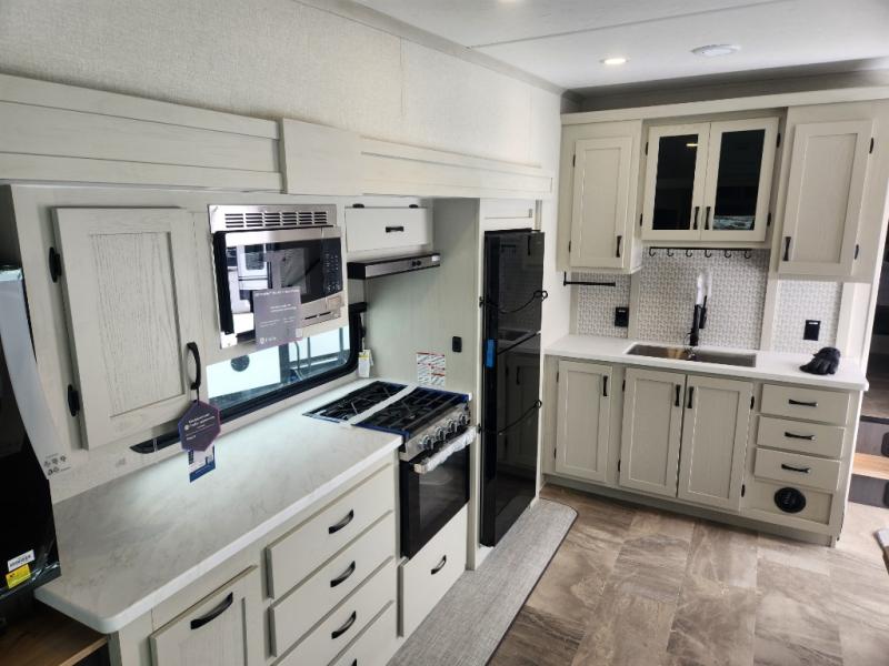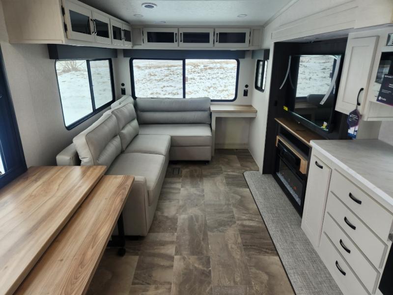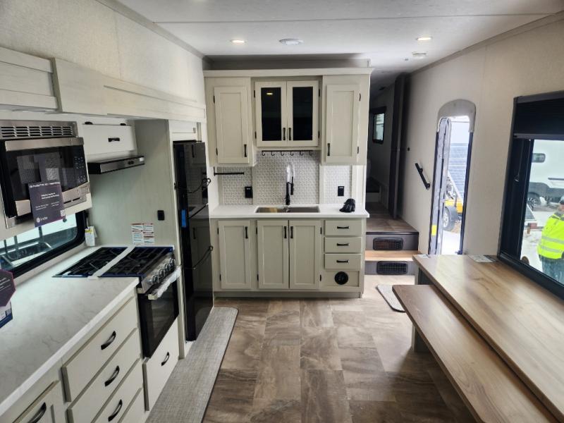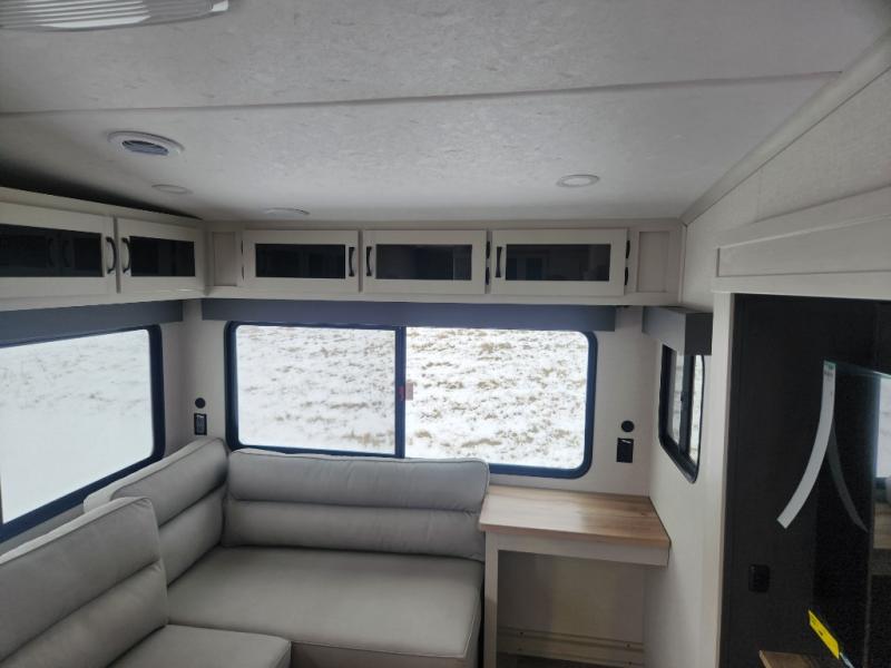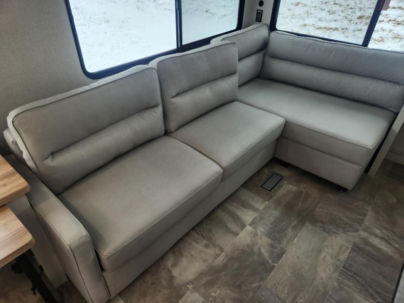 Enjoy the features this fifth wheeler has to offer for your next roadtrip! Have a great time with friends and family while you appreciate the pleasent outdoor view and enjoy some drinks at the table height fixed bar, or have a relaxing rest on the spacious j-lounge sofa that can turn into a bed so you can kick back and relax however you prefer. You can also enjoy a treat stored conveniently in the hidden swing-out pantry to maximize space and have easy access when craving a snack before enjoying some TV. Here you will find a front bedroom that includes great options for storage including a wardrobe to keep all your clothes wrinkle-free, after a day of adventure, refresh and recharge in your bathroom complete with a radius shower, modern fixtures, and everything you need to unwind before settling into your cozy queen bed.