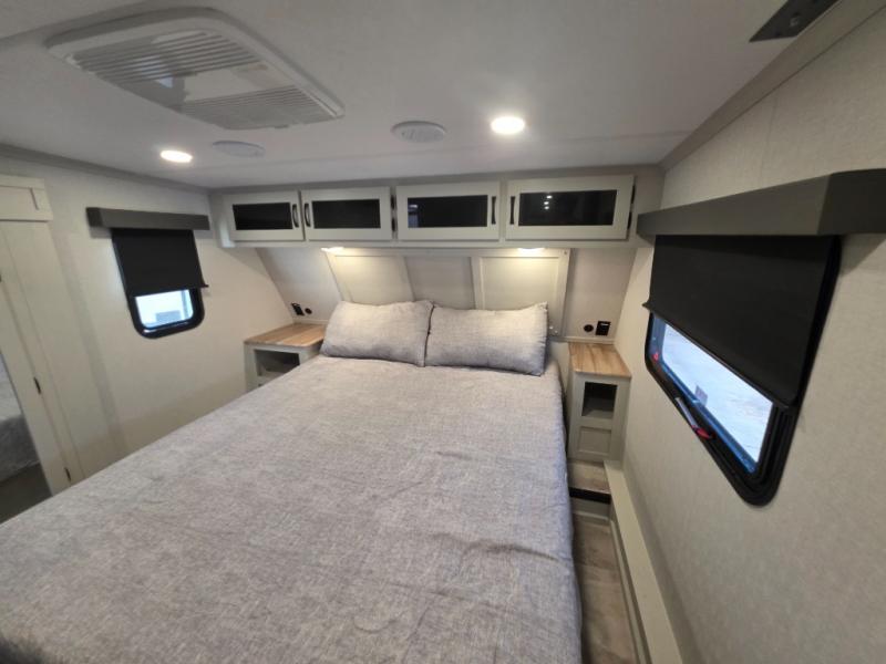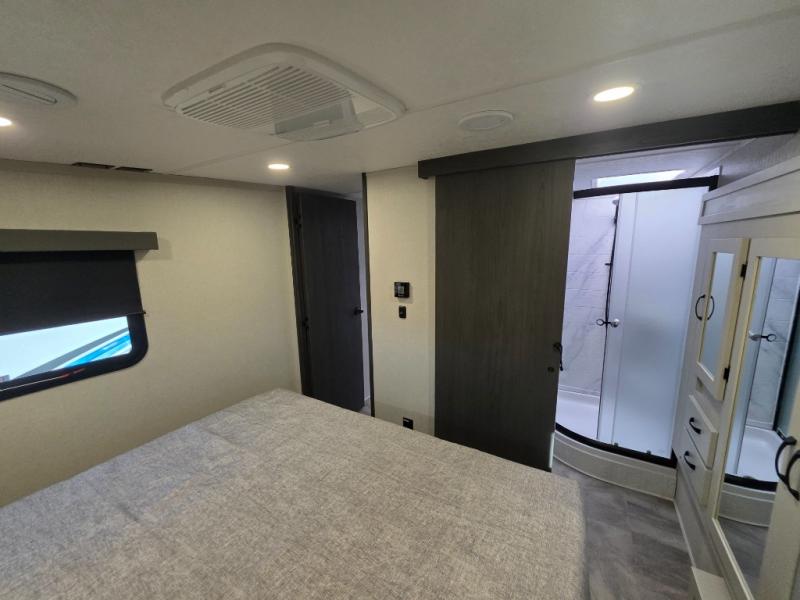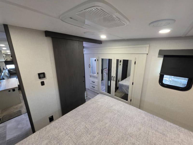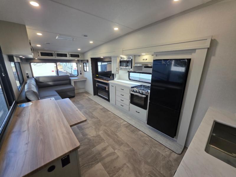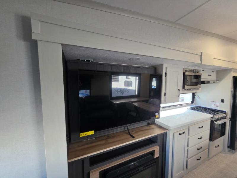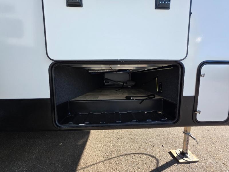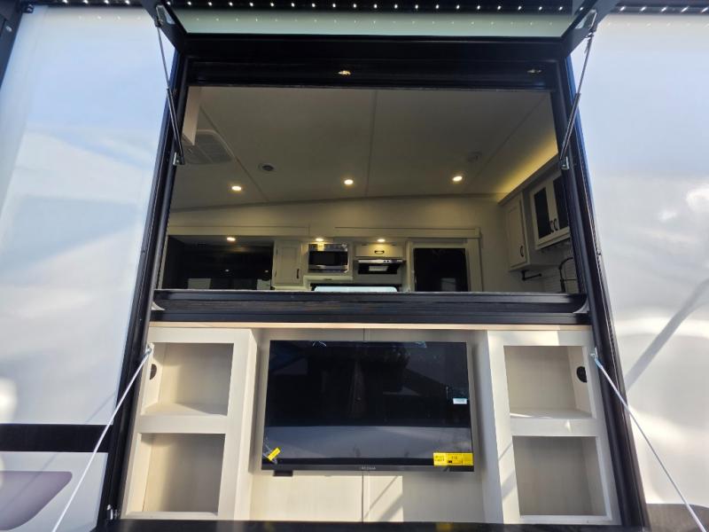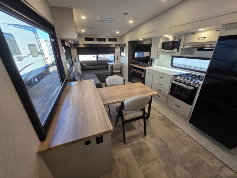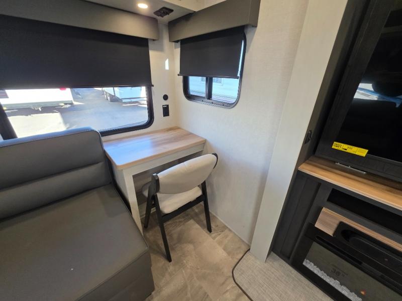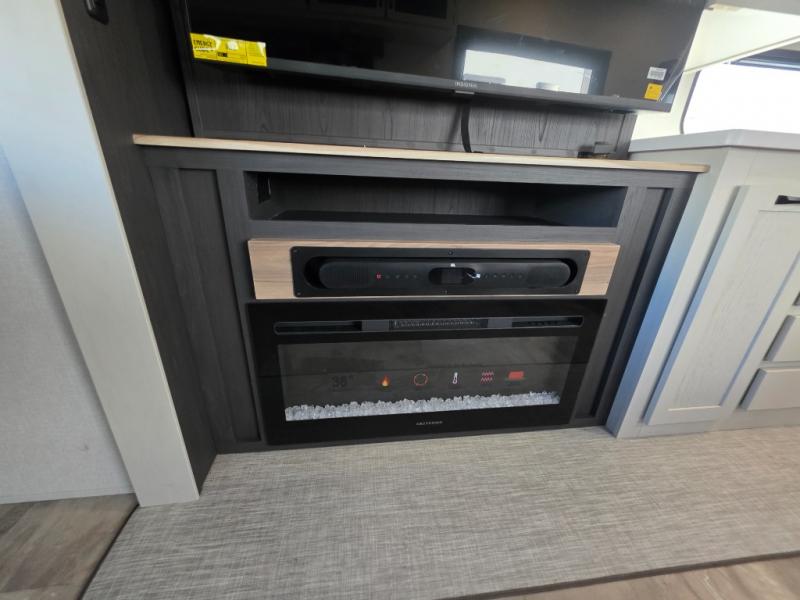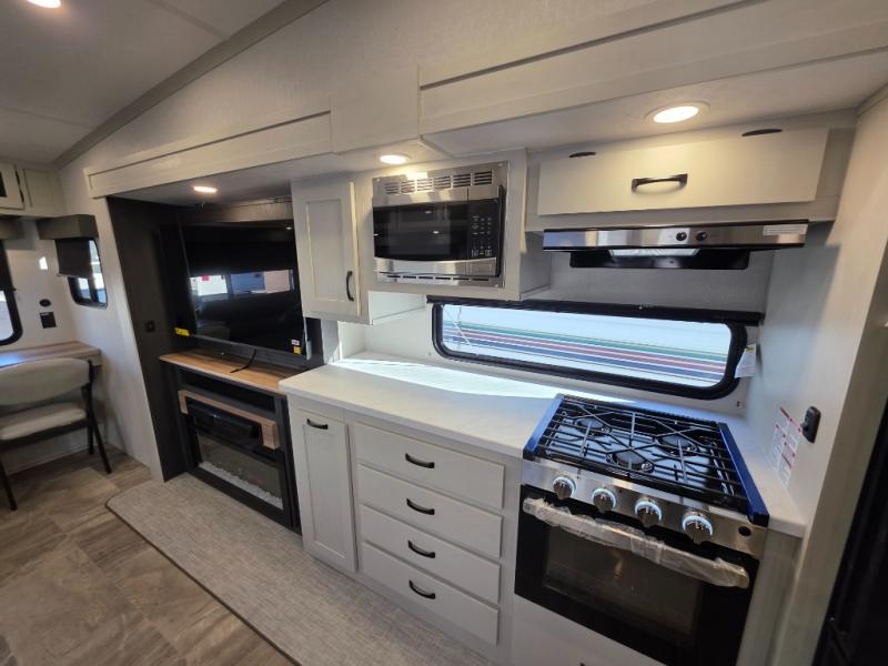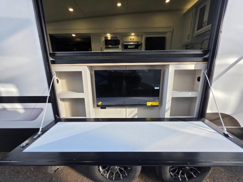 Enjoy the features this fifth wheeler has to offer for your next roadtrip! Have a great time with friends and family while you appreciate the pleasent outdoor view and enjoy some drinks at the table height fixed bar, or have a relaxing rest on the spacious j-lounge sofa that can turn into a bed so you can kick back and relax however you prefer. You can also enjoy a treat stored conveniently in the hidden swing-out pantry to maximize space and have easy access when craving a snack before enjoying some TV. Here you will find a front bedroom that includes great options for storage including a wardrobe to keep all your clothes wrinkle-free, after a day of adventure, refresh and recharge in your bathroom complete with a radius shower, modern fixtures, and everything you need to unwind before settling into your cozy queen bed.